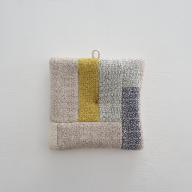 もの作りをする上で、どうしても溜まってしまう、試し織りした布地や製品サンプル。 手元に残ったそれらの布地に新たに陽が当たるように、パッチワークにして ポットホールダーにしました。 ( 素材には、マフラーなどにも使用している、柔らかく肌触りのよいウールを中心に使用しています。 ) 裏地には、11号綿帆布を使用。 表地と裏生地の間に中綿を入れ、暑い鍋蓋や薬缶も、安心してお持ち頂ける厚みとサイズに。 鍋つかみとしてのご使用の他、鍋敷きとしても〇。( ※ 鍋敷きとしてご使用頂く場合、沸騰して直ぐのものは載せないで下さい。 ) 今はもう制作していない布地等を使用していたりするので、一点もの的な感覚でお選び頂けたらと思います。 --------------------------------------------------- [ ご注意事項 ] ※ 汚れが付着した際は、直ぐに、しっかりと水洗いして下さい。 ※ 洗濯は、中性洗剤を使用し手洗いして下さい。また、洗濯の後、軽く脱水し、形を整えて干して下さい。 ※ 洗濯や摩擦により、縮みや毛羽立ちが生じることがあります。 --------------------------------------------------- qua : wool ( 中綿 : polyester 100% / 裏地 : cotton 100% ) col : beige base size : one size 幅 : 16.0cm 高さ : 16.0cm ※ 5mm前後の個体差がある場合がございます。 Made in Japan ( 大阪 貝塚 のアトリエの手機で織った布地の残布を使用して形にしています。) ------------------------------------------------ [ 製品の発送について ] 金、土、日曜日 及び 祝日は、発送業務を休止しております。金、土、日曜日 及び に祝日に頂いたご注文分は、翌営業日以降、順次発送させて頂きます。( 月曜日が祝日の場合は、火曜日以降の発送 ) ※ こちらの製品は、ご注文金額が ¥5,000-未満の場合は レターパックライト( 郵便受けに投函 )、¥5,000-以上の場合は レターパックプラス( 対面での受取 )でお送りさせて頂きます。 -------------------------------------------------------- ※ 残布を使用しているため、一点一点がそれぞれ異なります。 ※ 撮影日の光の具合等により、色合いが実際とは多少異なる場合がございます。 ※ 寸法の微妙な誤差は、ご了承下さい。 ※ コチラの製品は、実店舗でも販売致しております。ご注文と入れ違いで売れた際は、ご容赦願います。 ご不明な点等ございましたら、どうぞお気軽にお問い合わせ下さい。