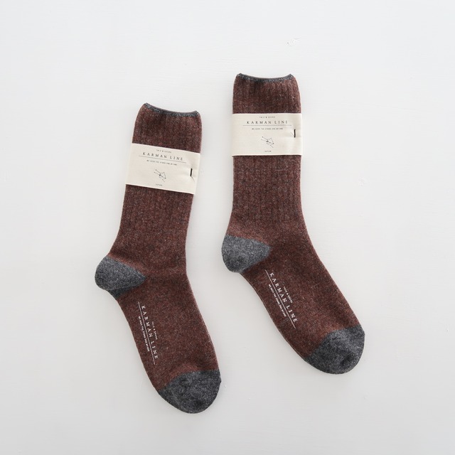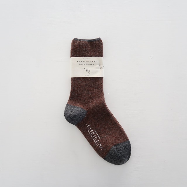 【 KARMAN LINE bland concept 】 「 私たちからあなたへ あなたから大切な人へ 贈り伝えたいものを編み続けます 」 2014年、お二人でスタートされたブランド。 靴下の産地である 奈良の方々と共につくる「デザイン」「糸」「履き心地」にこだわった一足、そこへ宙の言葉を込めて発表されています。 ・・・・・・・・・・・・・・・・・・・・・・・・・・・・・・・ 暖かさはもとより、身に着ければ着けるほど柔らかく肌馴染みのよくなる、ウールのソックス " TAURUS " を個人的に愛用しており、お店でもお取り扱いをさせて頂けることになりました。 コットンやシルク、ウールなど天然の素材を中心に使用しながら、豊富な色展開も魅力で、メンズサイズのものもございます。 ::::::::::::::::::::::::::::::: その「 KARMAN LINE 」から。 こちらは「 TAURUS / 牡牛座 」と星座の名前がつけられた、ウールのリブソックス。 素材は、ふんわりと柔らかなラムウールで、身に着ければ着けるほど、ますます柔らかく肌馴染みがよくなり、また、しっかりと足元を温めてくれる、寒い冬には欠かせないあたたかソックスです。 また、ミドルゲージの厚過ぎず薄過ぎない程よい厚みになっているので、スニーカー等カジュアルなシューズだけでなく、キレイ目の革靴などにも合わせられるのも魅力です。 ------------------------------------------------------ < ご注意事項 > ※ 天然の繊維で編み上げた製品は、化学繊維のものに比べ繊細です。繊維を傷めず、長くご愛用頂くためには、洗濯は、ぬるま湯に中性洗剤をご使用頂き、手洗いををお勧め致します。洗濯機をご使用の場合も、中性洗剤をご使用の上、弱水流で洗濯ネットをご使用下さい。 ※ 洗濯の後、履き口を上にして陰干しして下さい。 ---------------------------------------------------- qua : wool 70% nylon 17% polyester 12% polyurethane 1% col : charcoal × brownie size : 26.0~28.0cm ( かかとから履き口までの長さ : 約24.0cm ) ※ 一つ一つ若干の個体差がございます。 Made in Japan -------------------------------------------------------- [ 製品の発送について ] 金、土、日曜日 及び 祝日は、発送業務を休止しております。金、土、日曜日 及び に祝日に頂いたご注文分は、翌営業日以降、順次発送させて頂きます。( 月曜日が祝日の場合は、火曜日以降の発送 ) ※ こちらの製品は、ご注文金額が ¥5,000-未満の場合は レターパックライト( 郵便受けに投函 )、¥5,000-以上の場合は レターパックプラス( 対面での受取 )でお送りさせて頂きます。 -------------------------------------------------------- ※ 撮影日の光の具合等により、色合いが実際とは多少異なる場合がございます。 ※ 寸法の微妙な誤差は、ご了承下さい。 ※ コチラの製品は、実店舗でも販売致しております。ご注文と入れ違いで売れた際は、ご容赦願います。 ご不明な点等ございましたら、どうぞお気軽にお問い合わせ下さい。