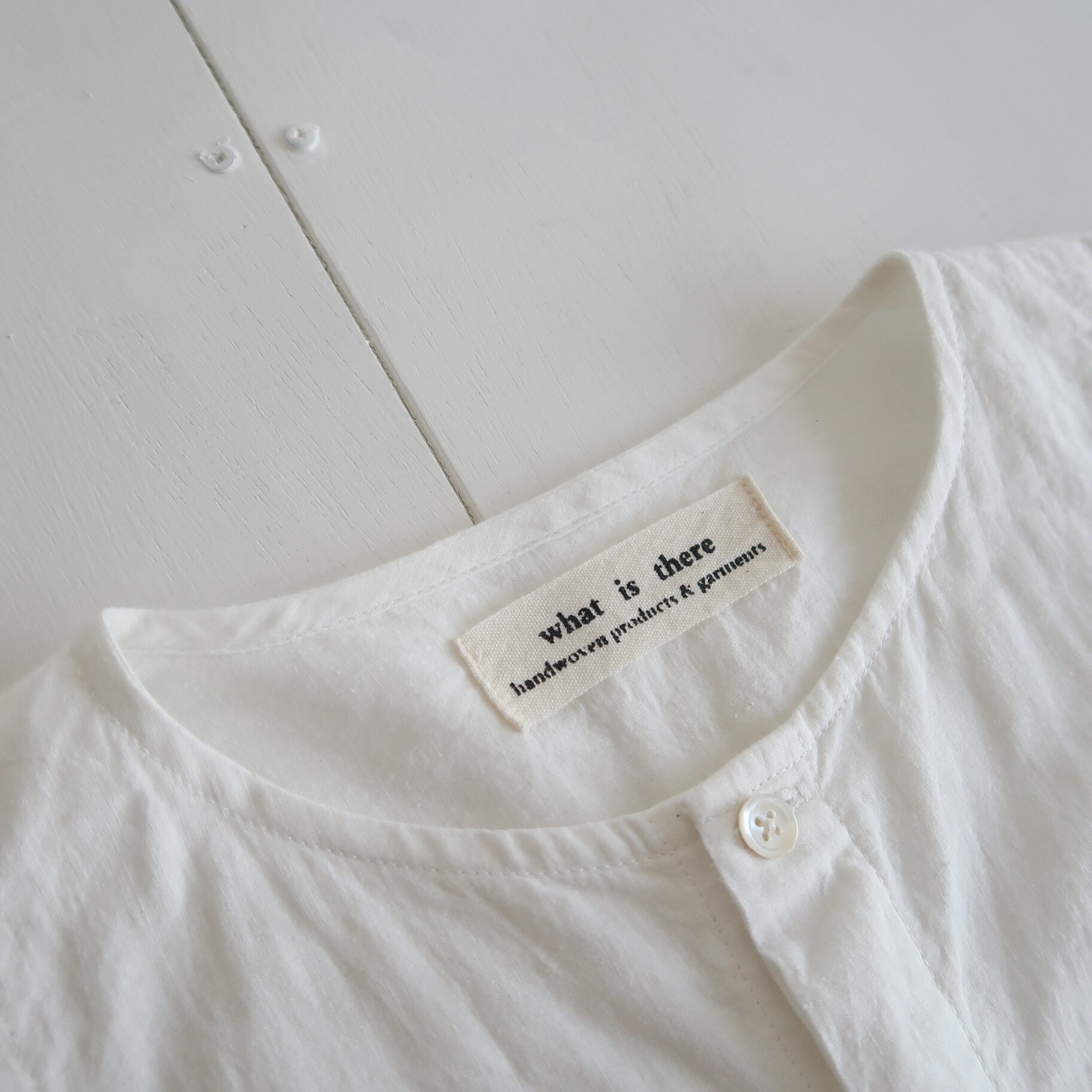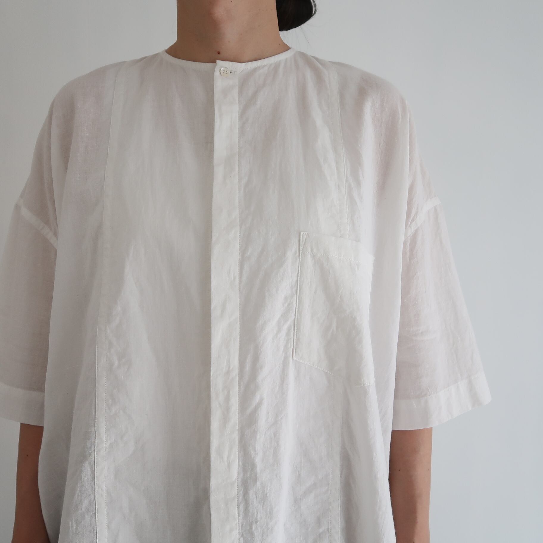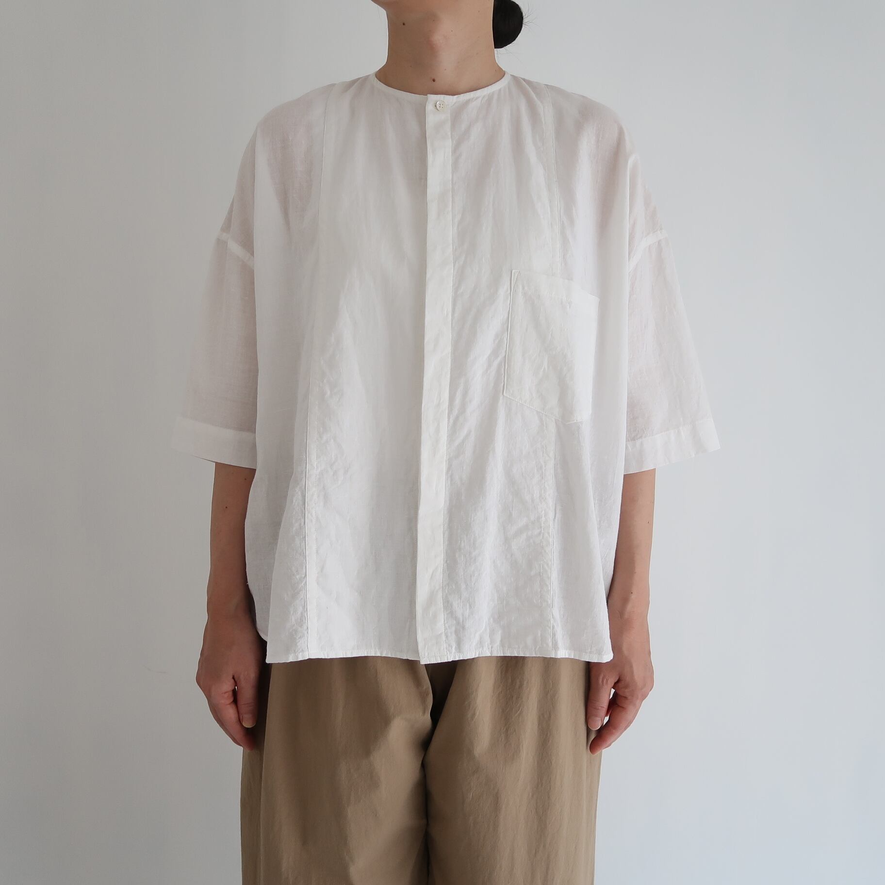 今回、ノーカラーシャツ ( 半袖 ) を制作するのにあたって選んだ素材は、 極薄手のカディコットン。