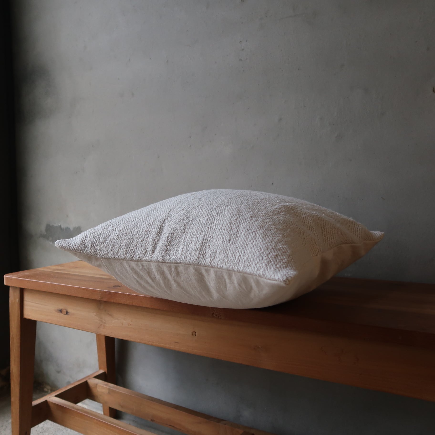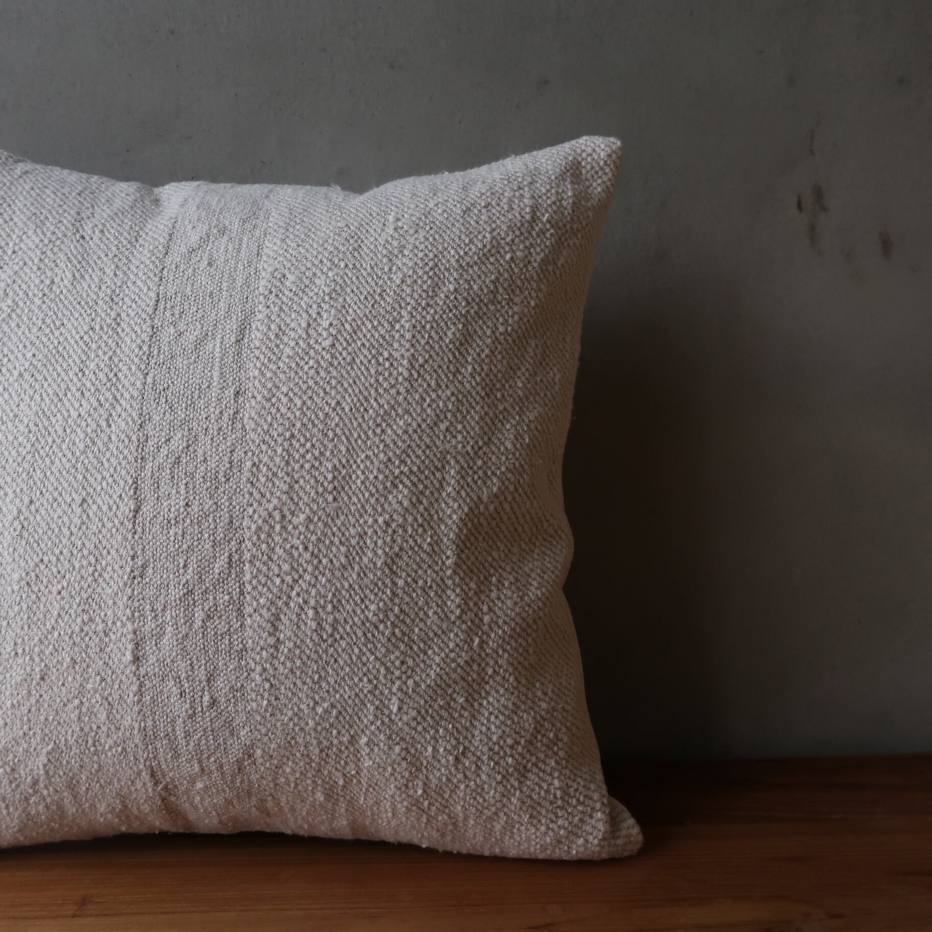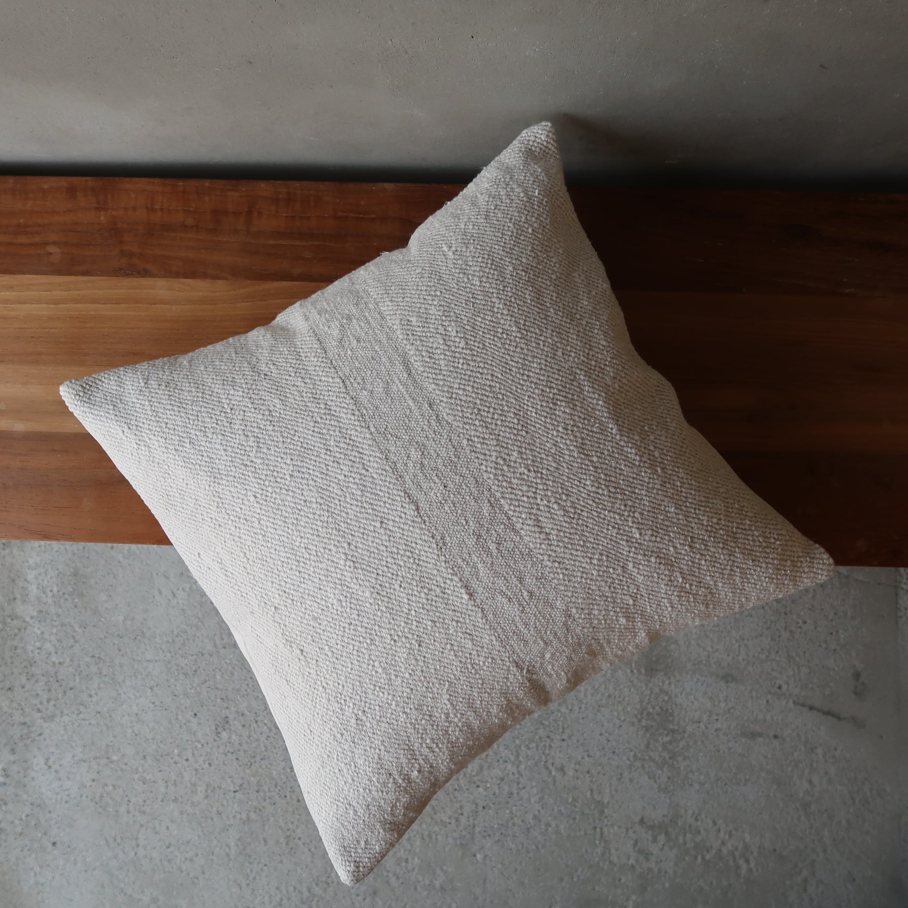 その魅力的な糸を緯糸に、経糸にリネン ( 25番手の双糸 ) を使用し、40cm角のクッションを制作いたしました。 ( 表面は、ガラ紡 のテキスタイル。裏面は 11号の綿帆布を使用。ポリエステル100%の中材付き。柄の入り方が微妙に異なる場合があります。 )