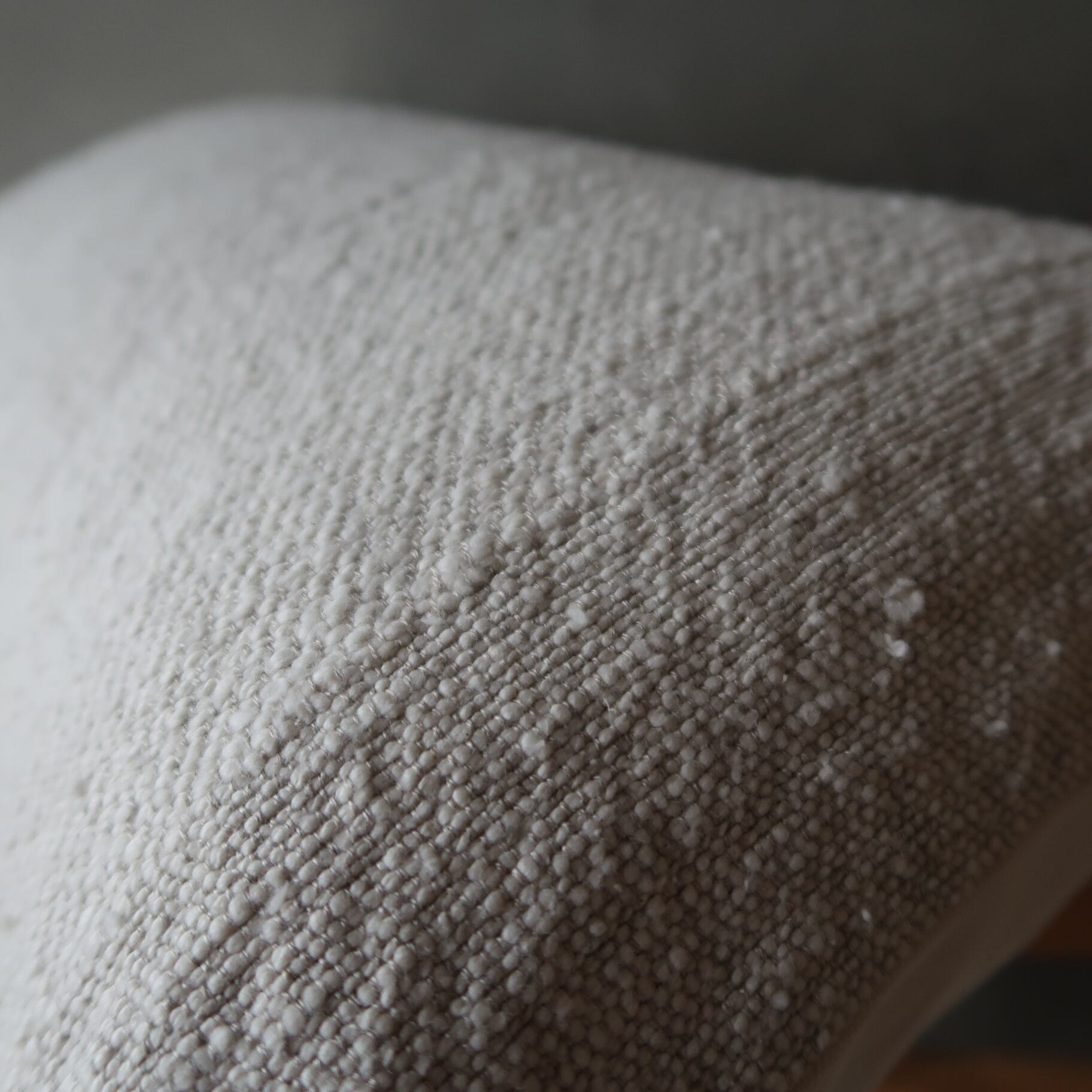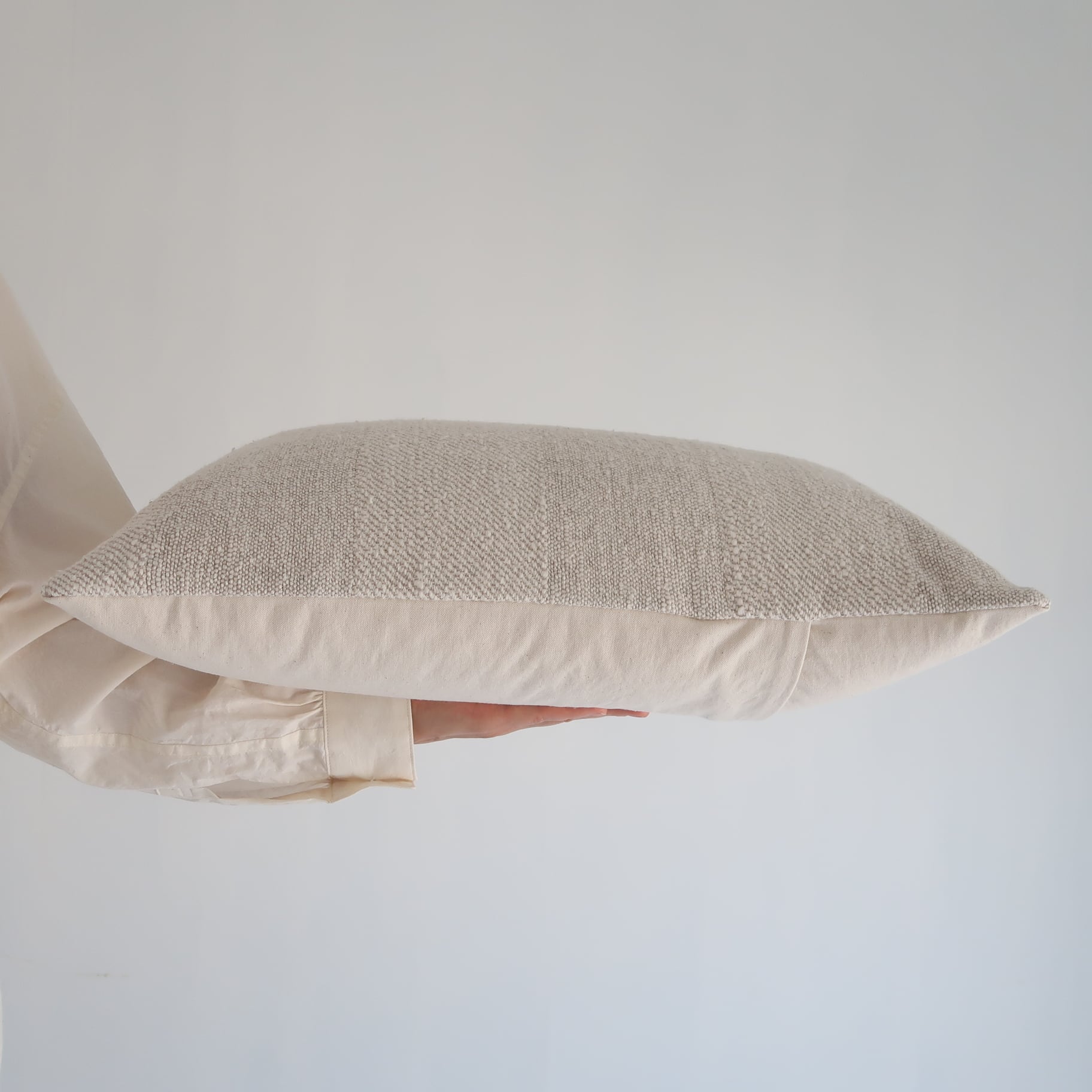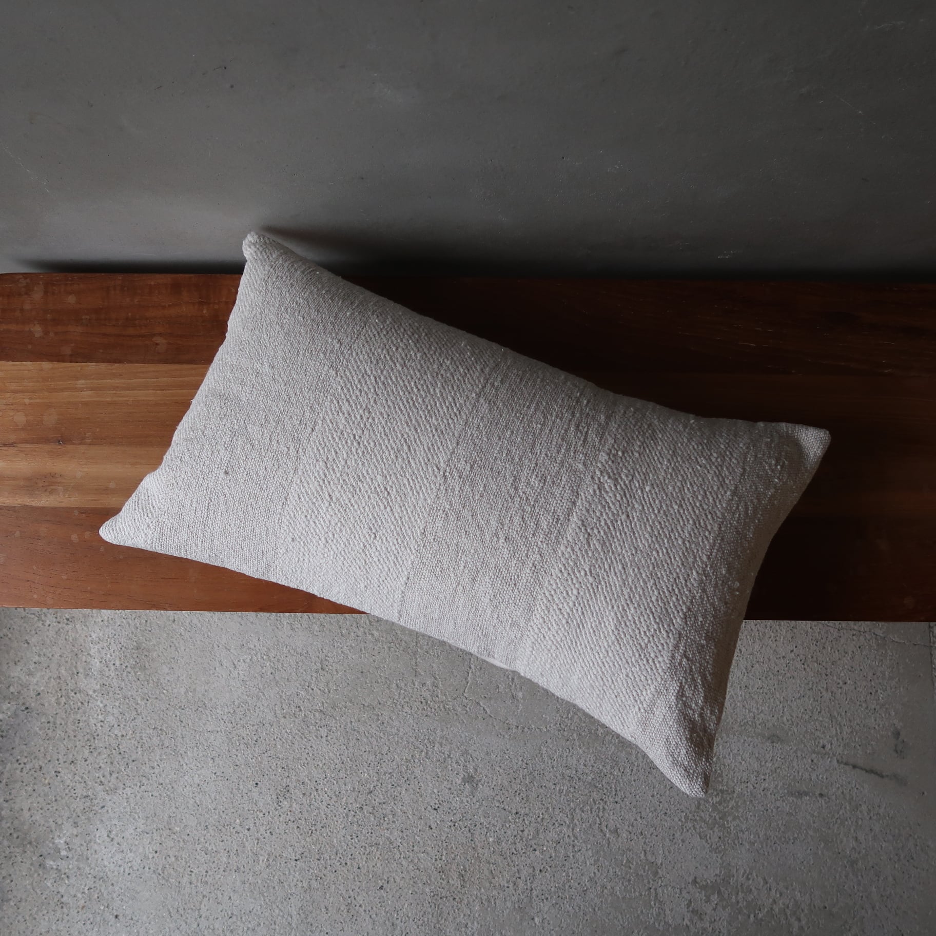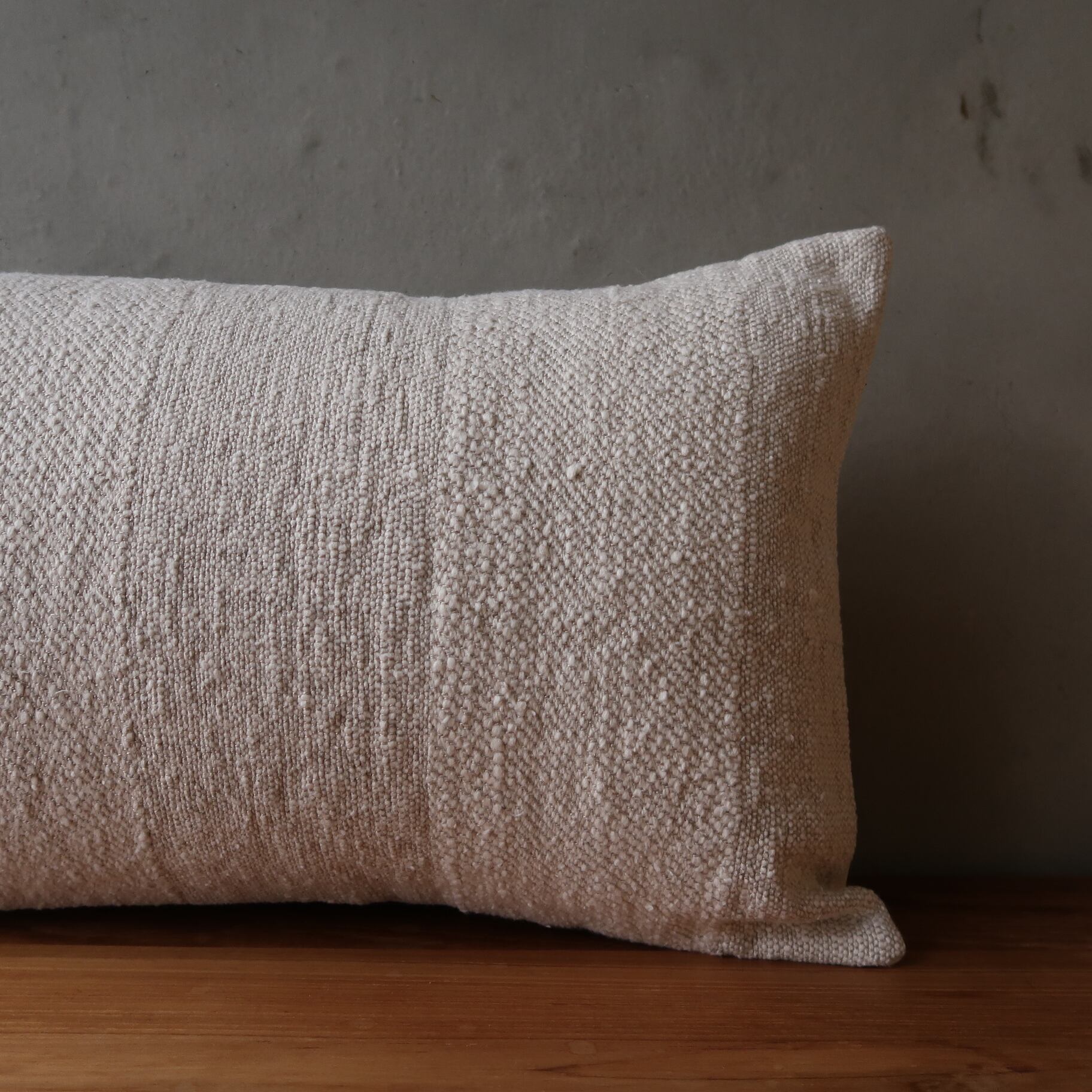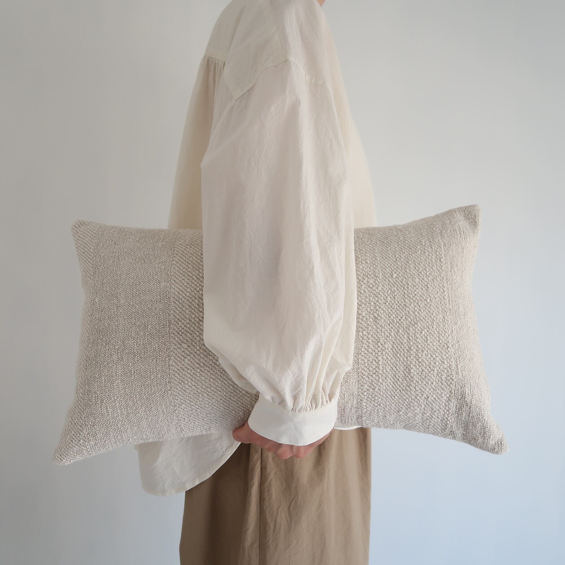 その魅力的な糸を緯糸に、経糸にリネン ( 25番手の双糸 ) を使用し、50×30cm サイズのクッションを制作いたしました。 ( 表面は、ガラ紡 のテキスタイル。裏面は 11号の綿帆布を使用。ポリエステル100%の中材付き。柄の入り方が微妙に異なる場合があります。 )