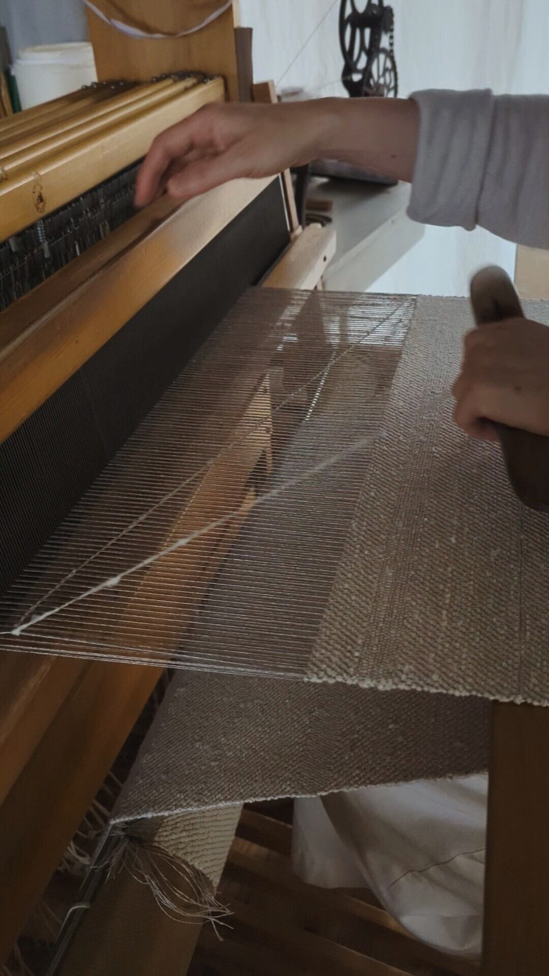 ( 大阪 貝塚のアトリエの手機で布地を織り、バッグを制作(縫製)しています。)