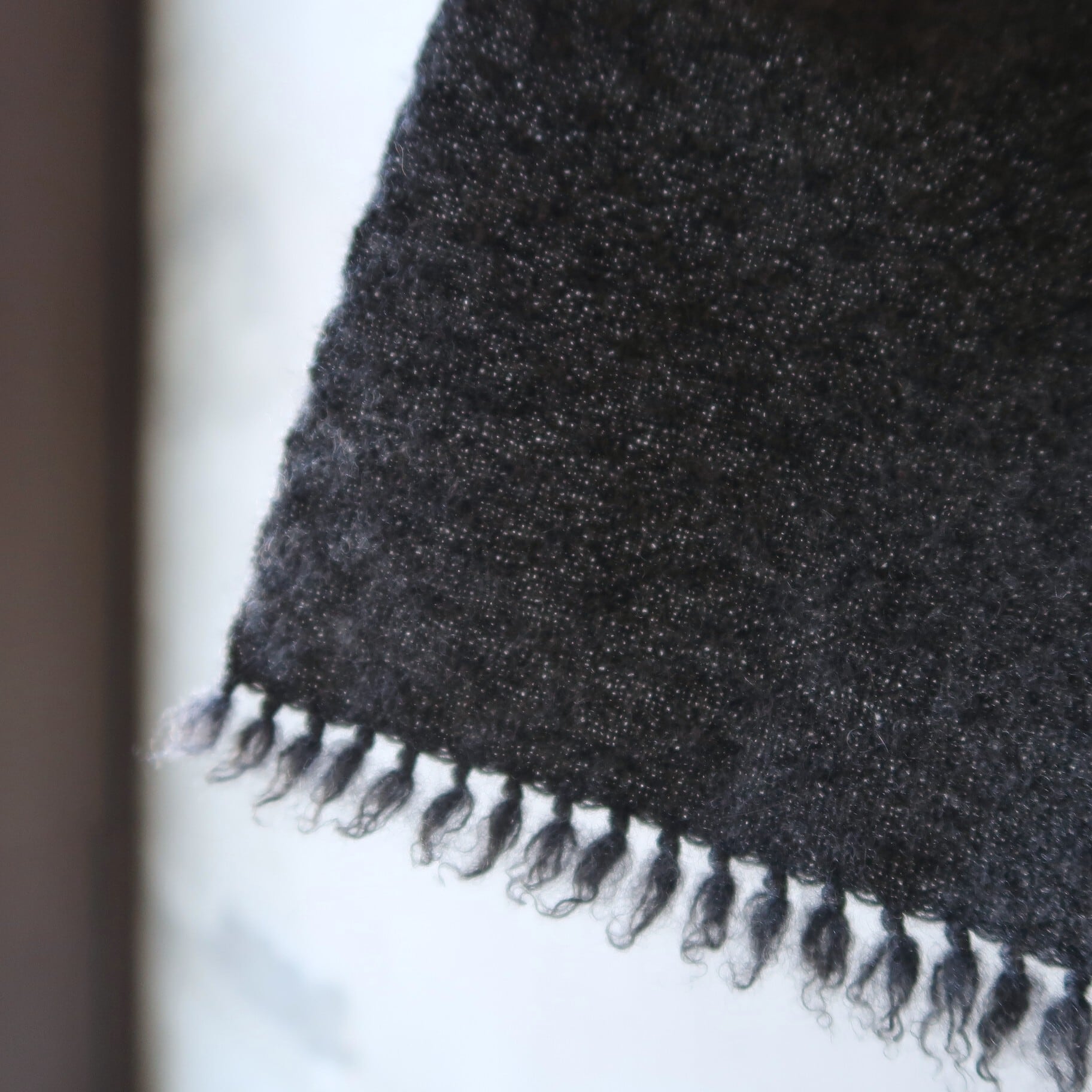 基本的にマフラータイプは、組織織りのものも 平織りのものも、布端を結び留めにして軽く仕上げています。