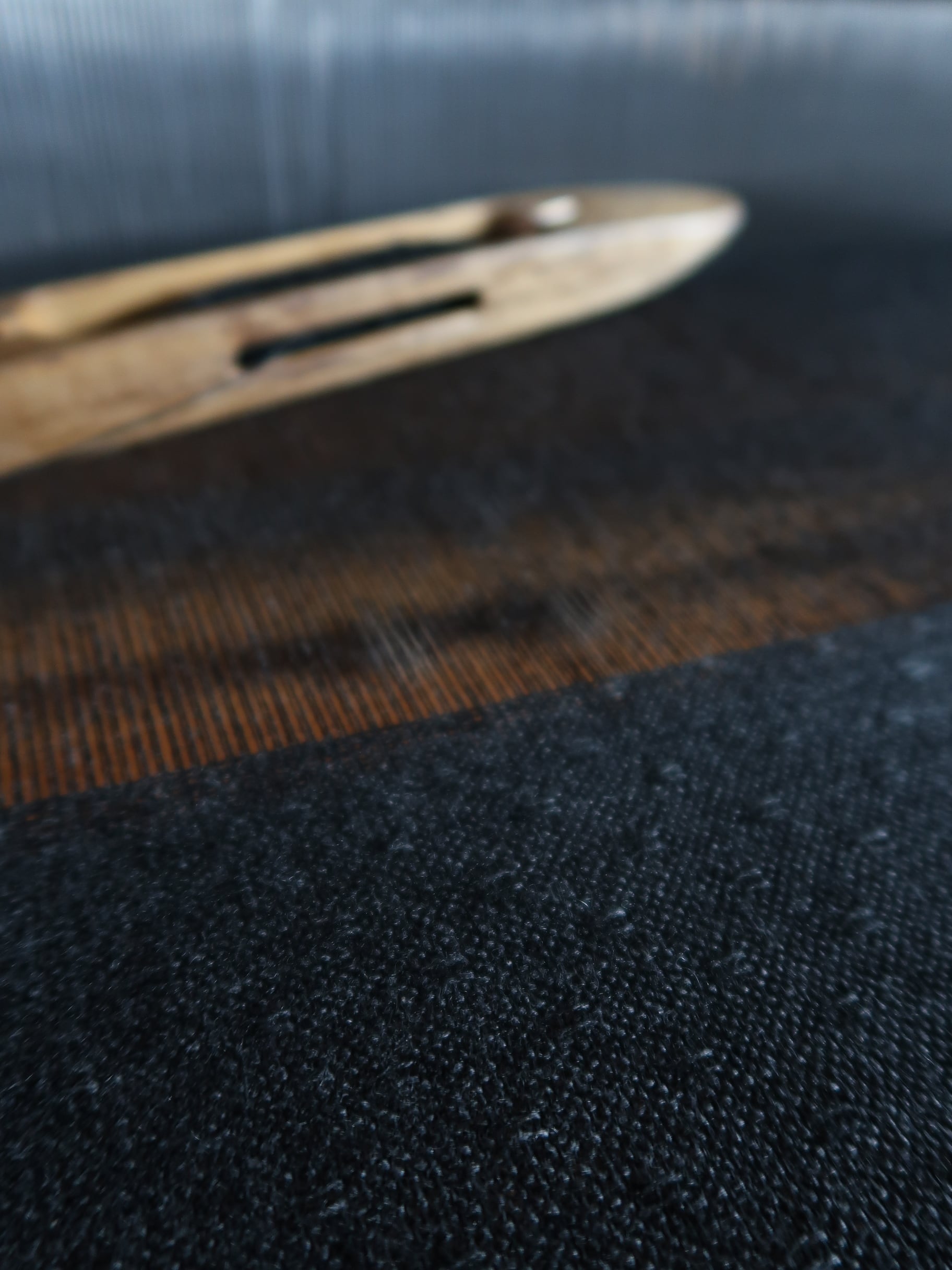 ( 大阪 貝塚のアトリエの手機で、一つ一つ織っています。)