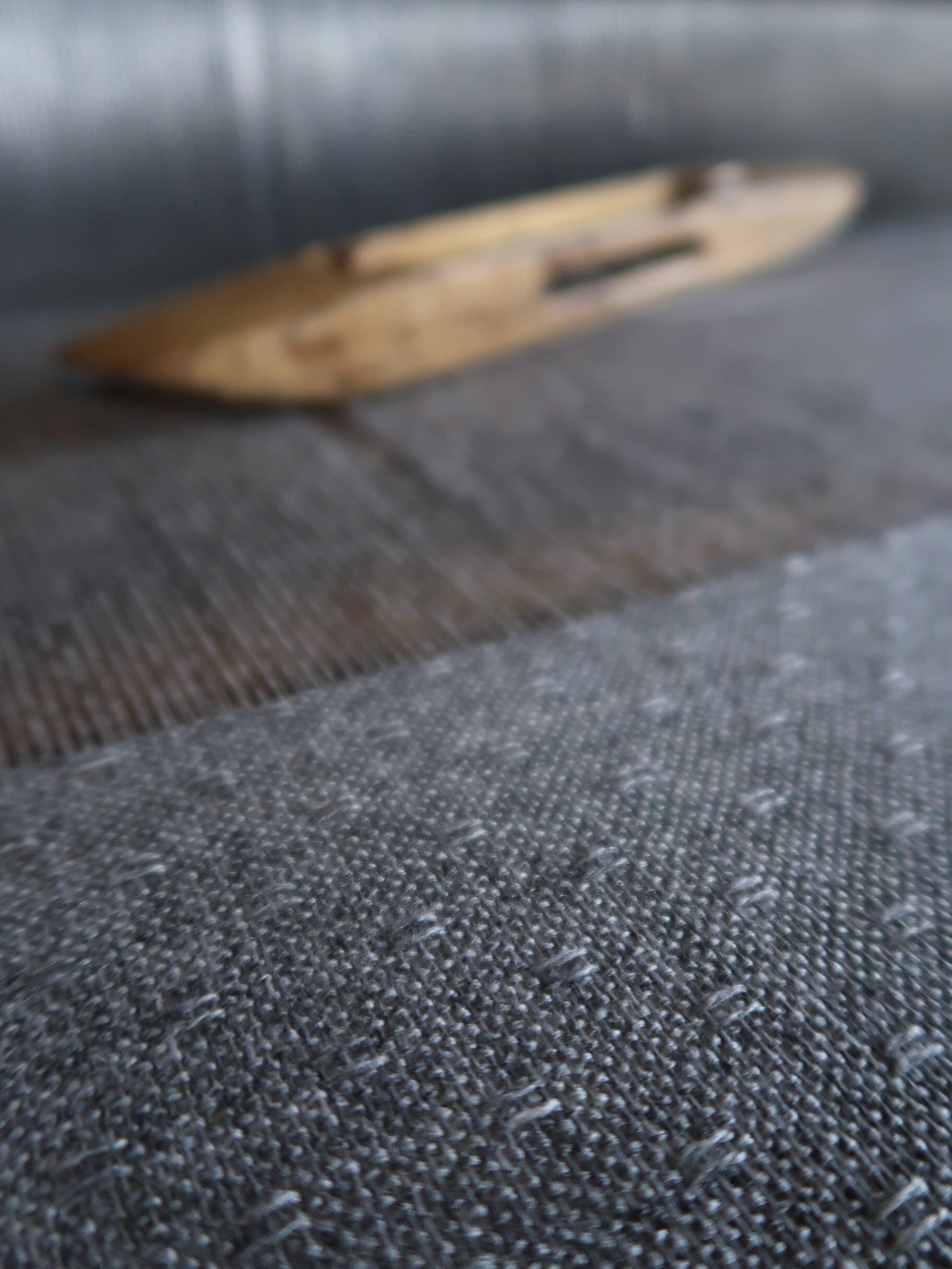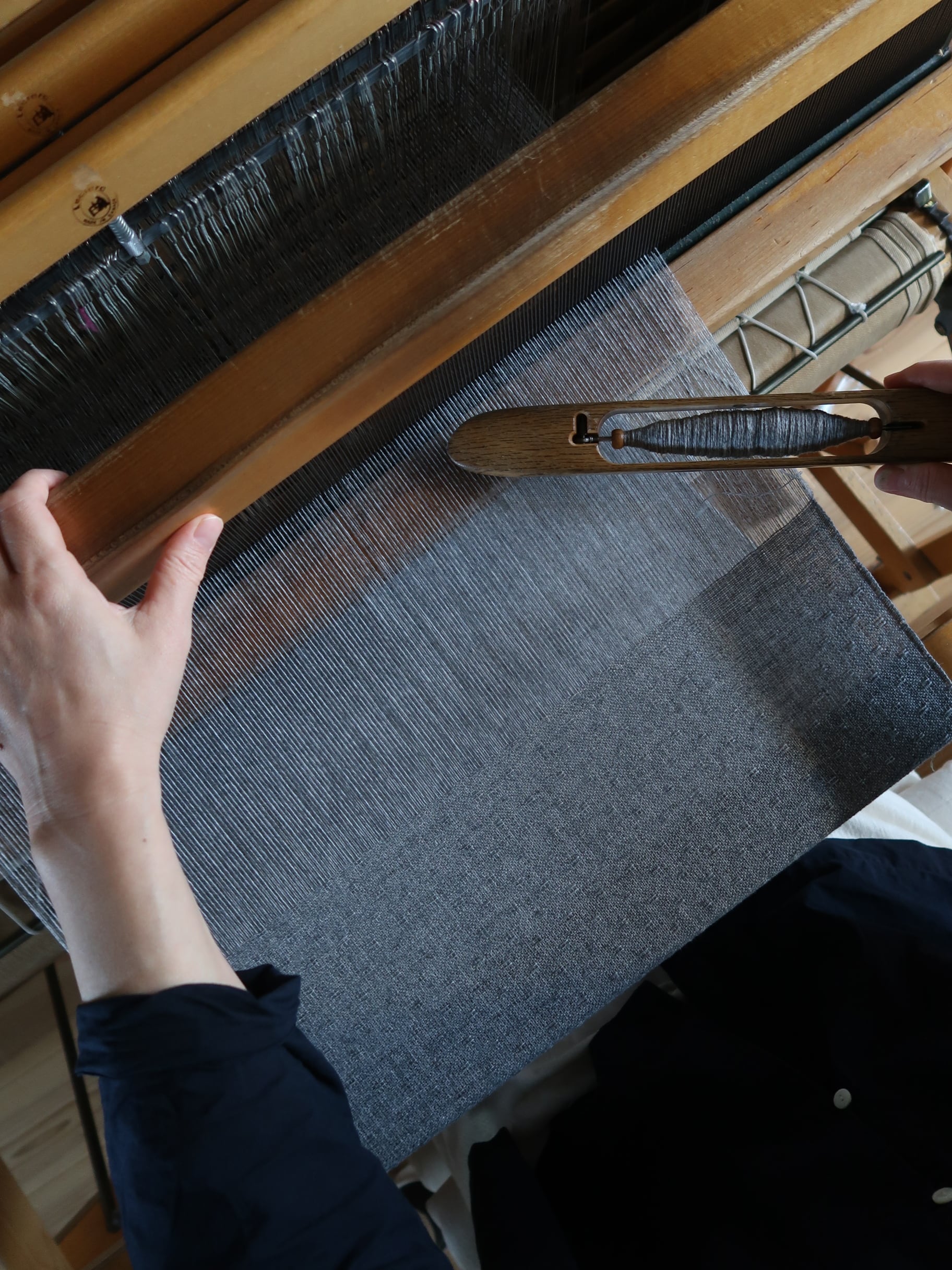遠目に見ると、ドット模様のように見える組織織りで織り上げることで、布地に変化をつけ、程よい厚みで織り上げました。( 平織りのものよりも、フンワリとした織り上がりになっているように感じられます。)