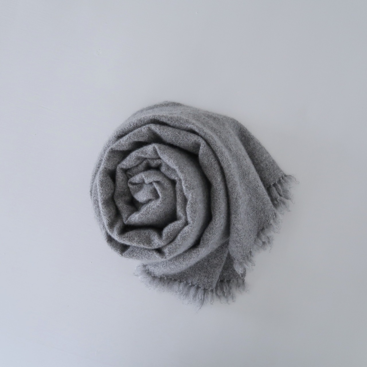 首に巻いても、肩に掛けても、ちょうど良いボリューム、サイズ感で、フワッと柔らかで滑らかなカシミヤ100%の大判ショール。