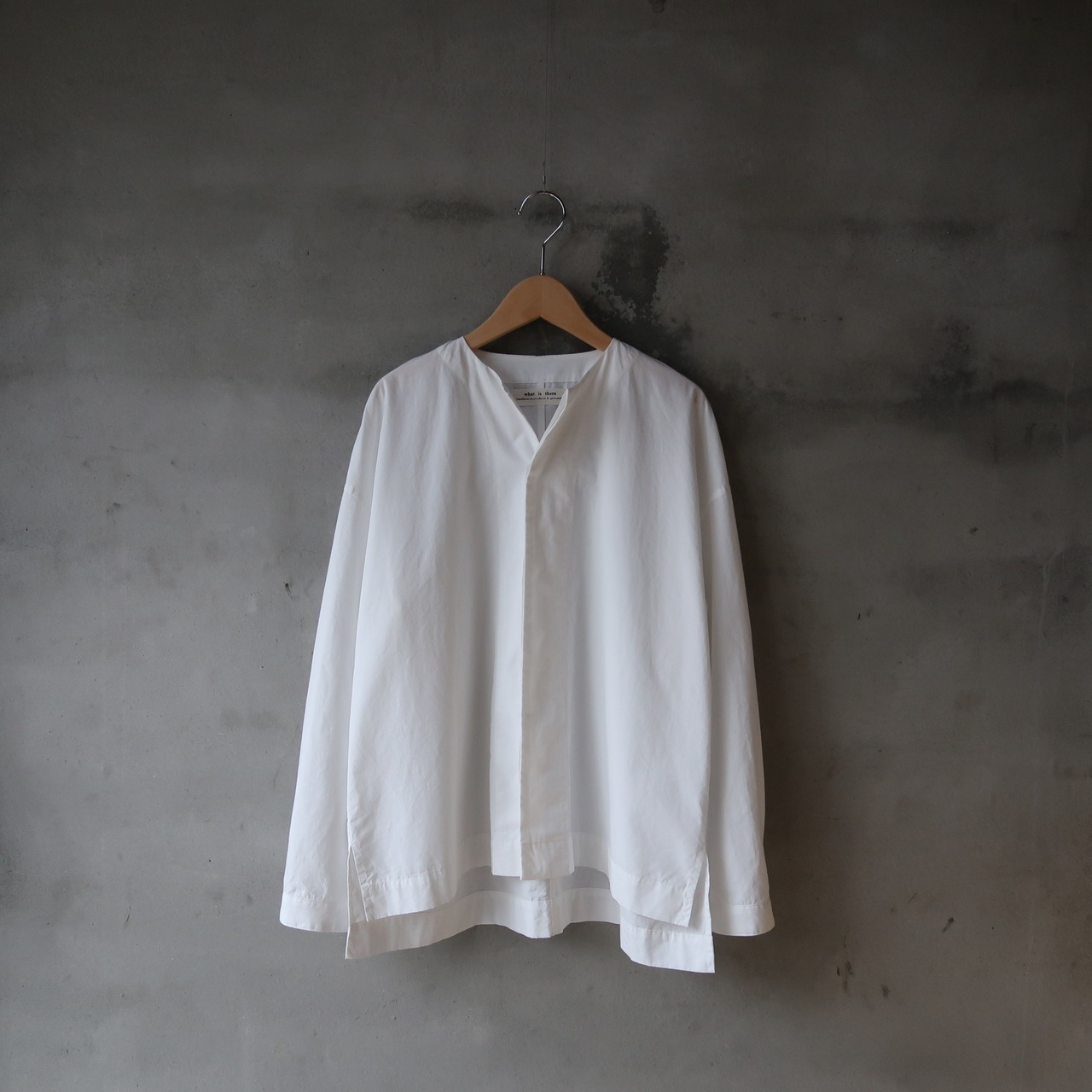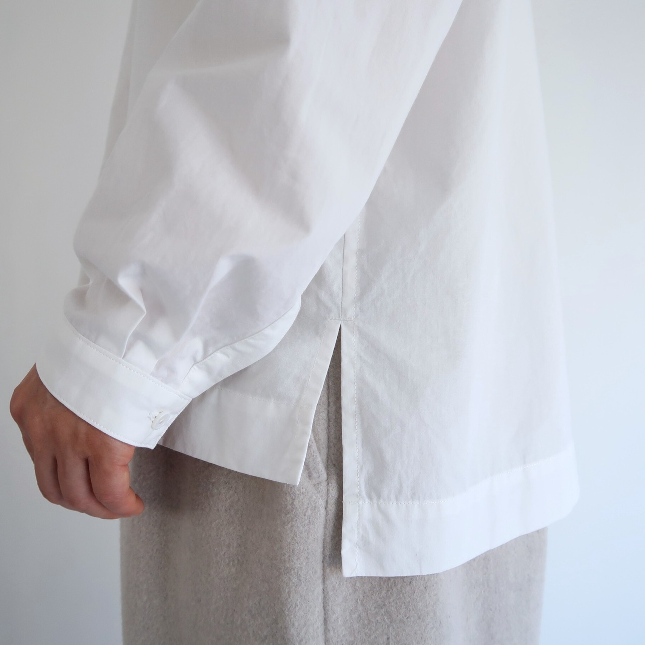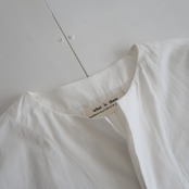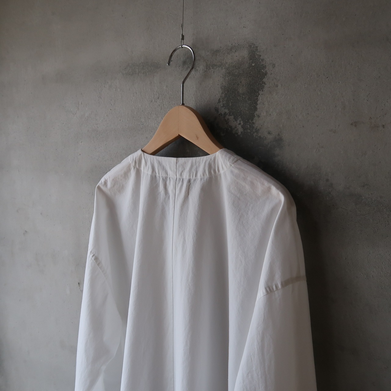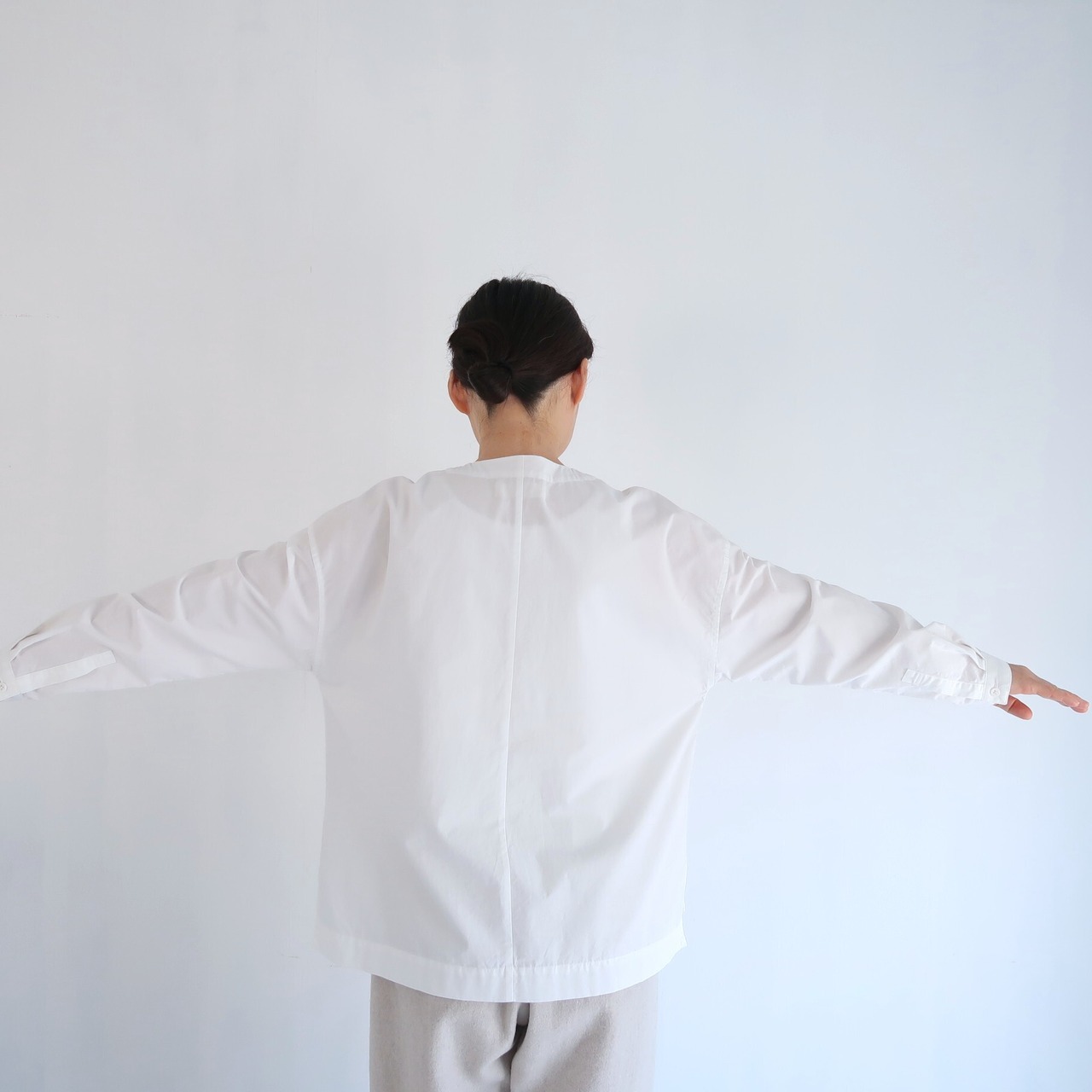 そのオーガニックコットンブロードのパリッとハリのある素材感を活かし、ノーカラー、比翼仕立て、背中のヨークなし、ポケットなし のミニマムな仕様