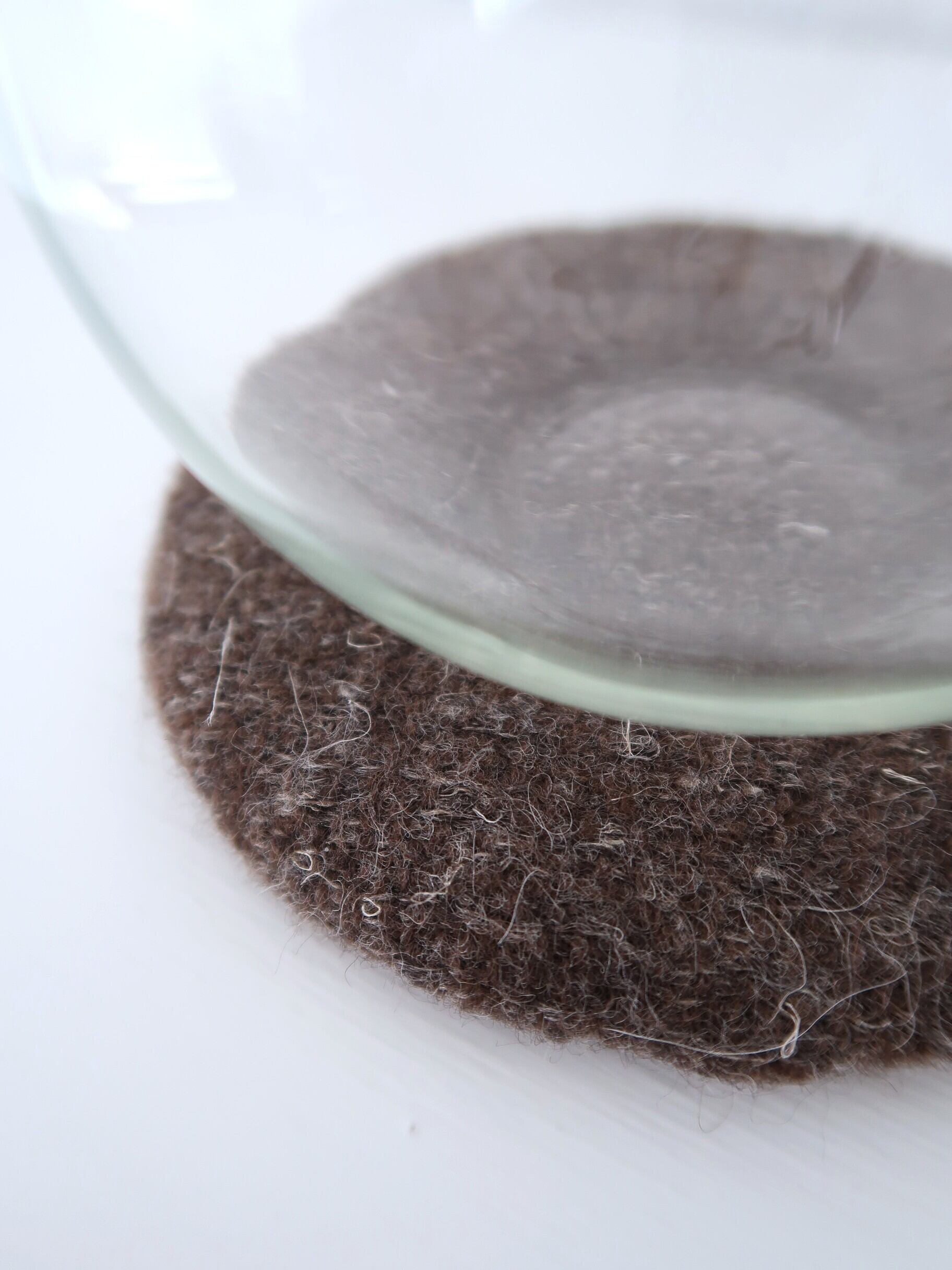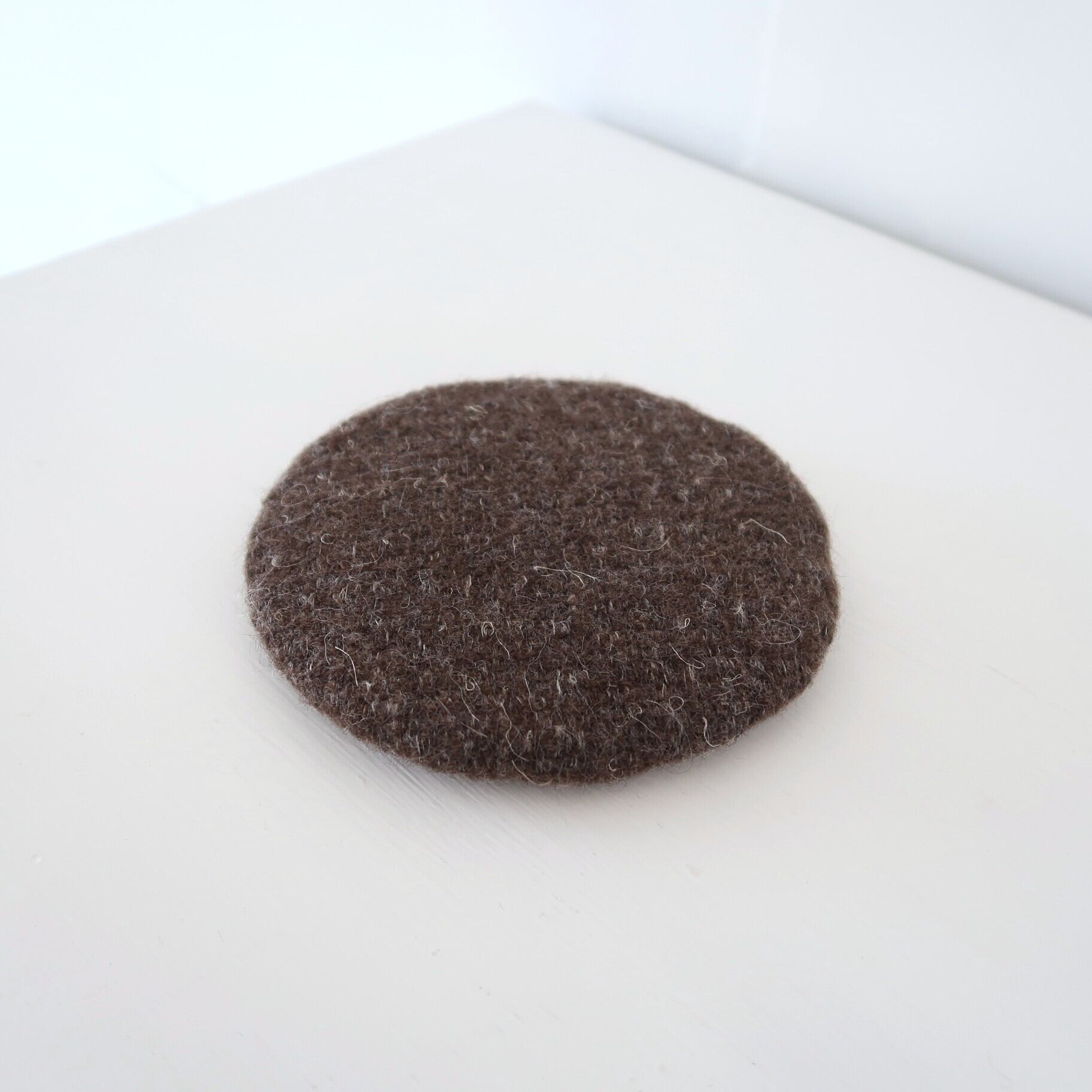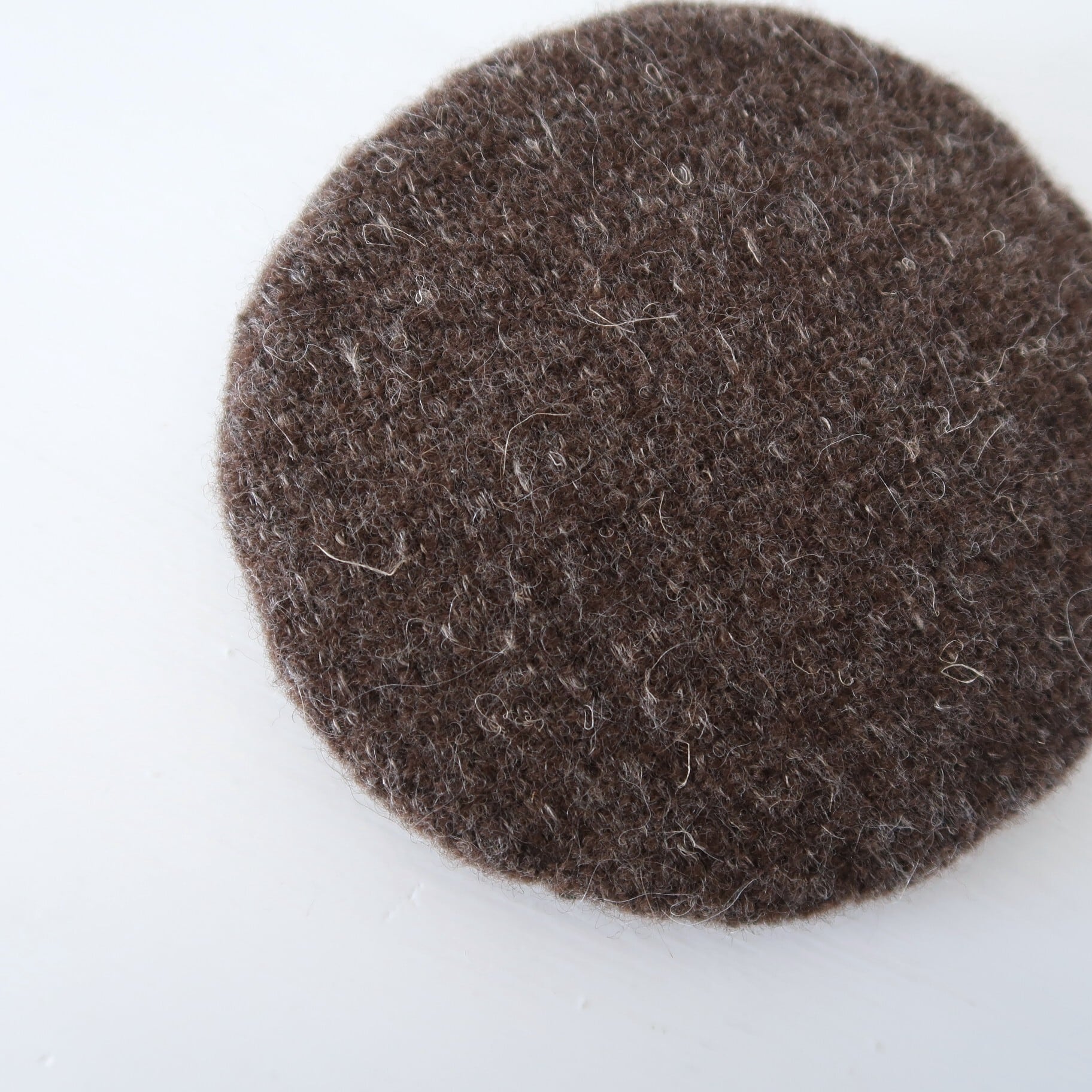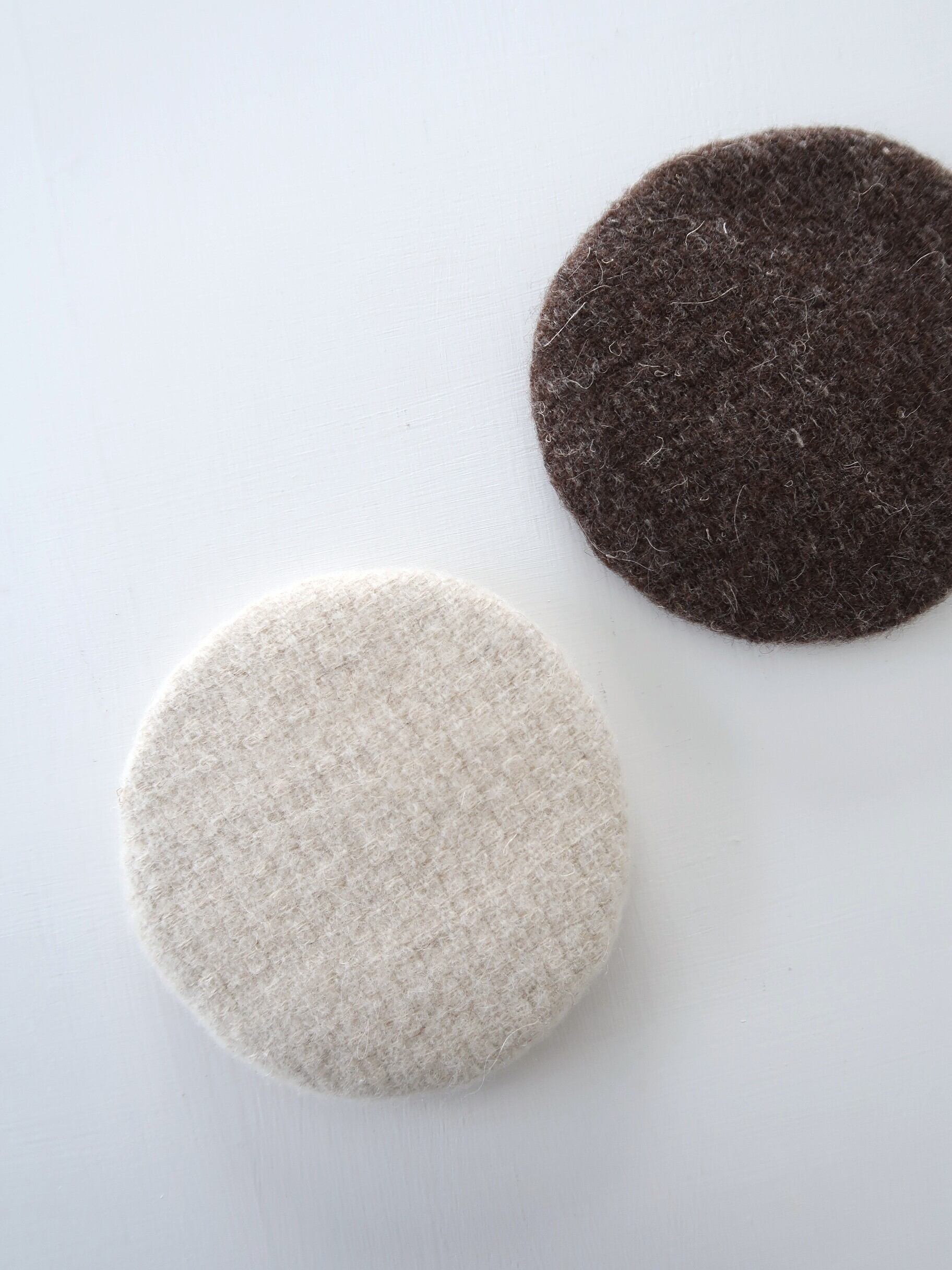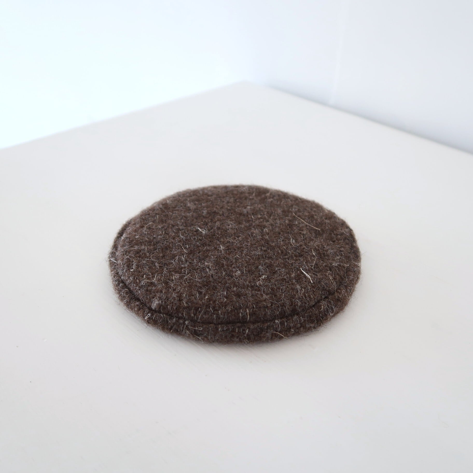テーブルに置いた際、縫い合わせが見えないように、上面より底面の直径を少し小さくして、縁を上面の布地で包み込むように仕上げています。( 上面、底面どちらもナチュラルウールのテキスタイルを使用。写真 8枚目 ポットマット 裏面。)