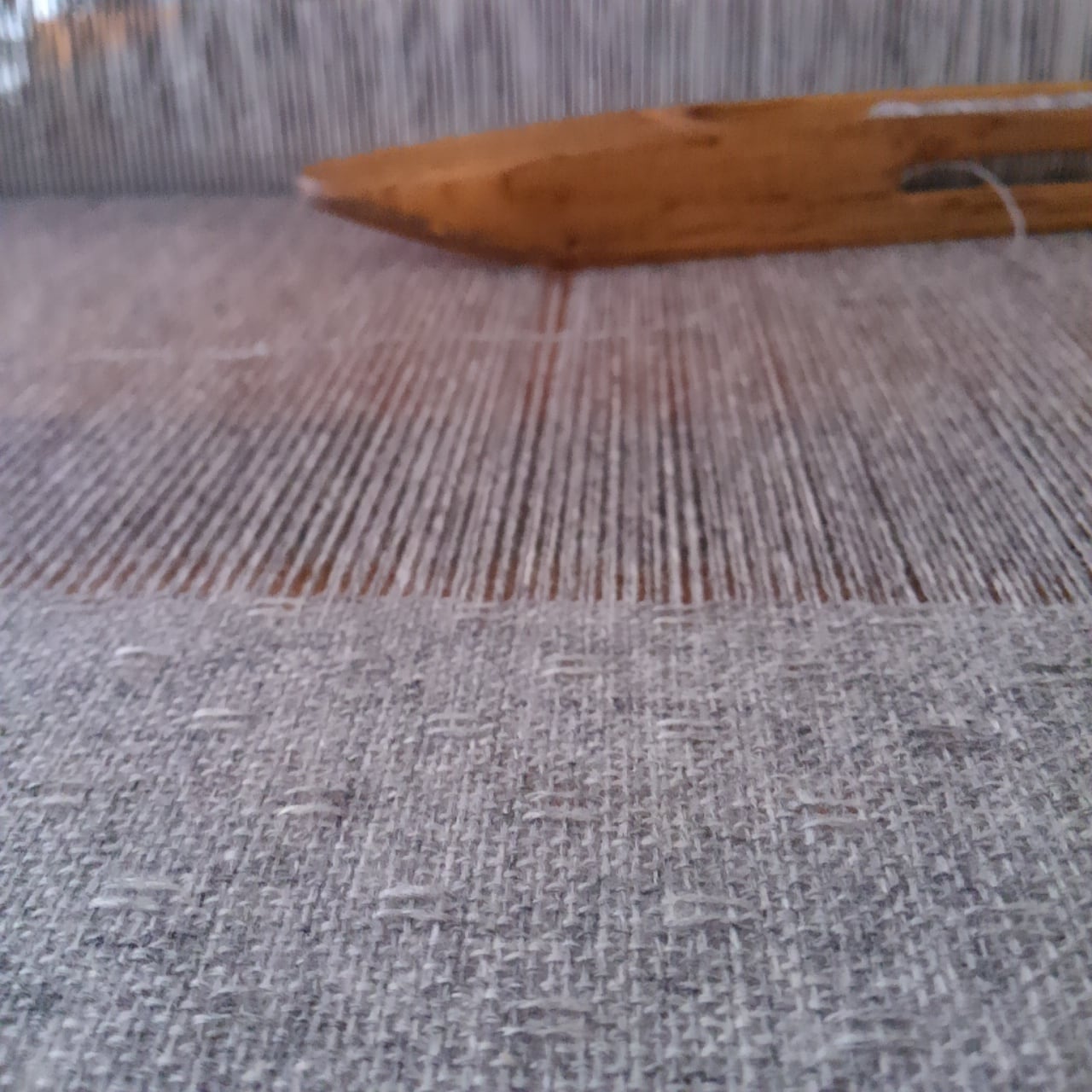 遠目に見ると、ドット模様のように見える組織織りで織り上げることで、布地に変化をつけ、程よい厚みに織り上げました。( 平織りのものよりも、フンワリとした織り上がりになっているように感じられます。)