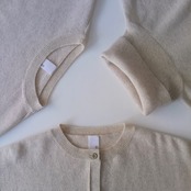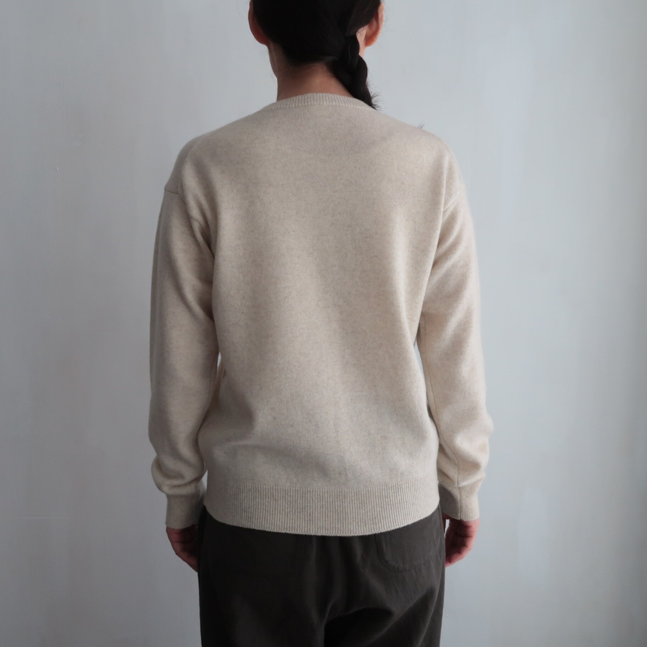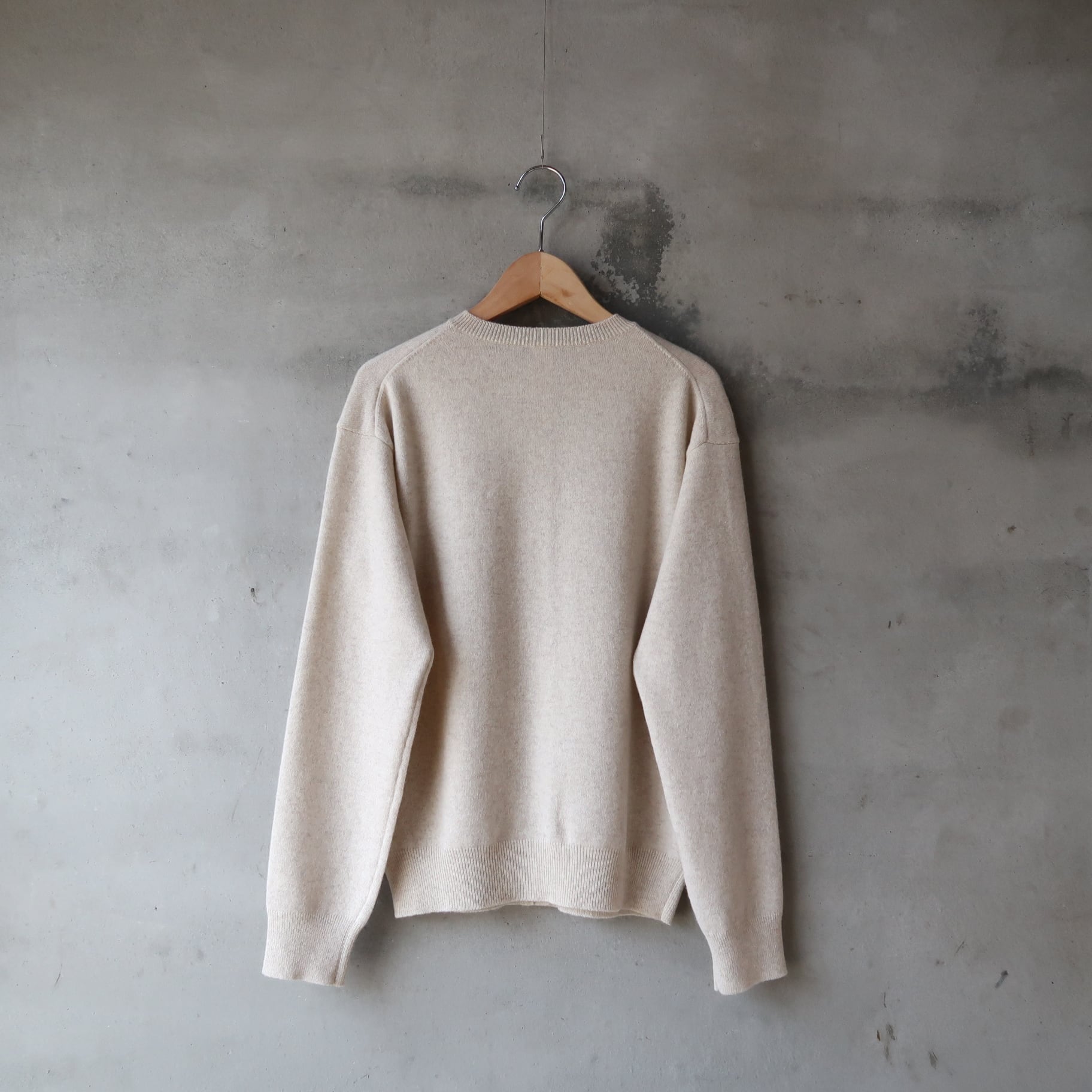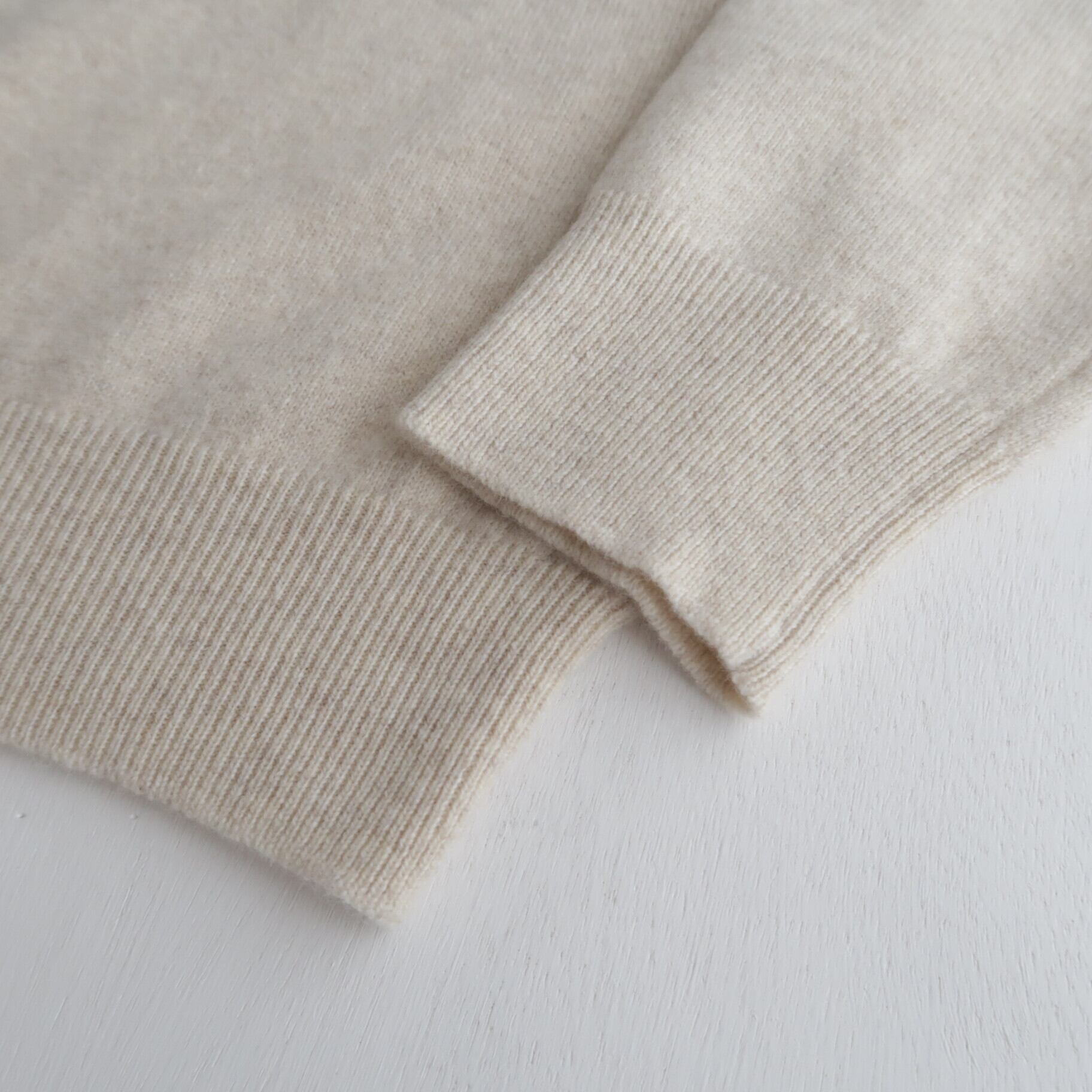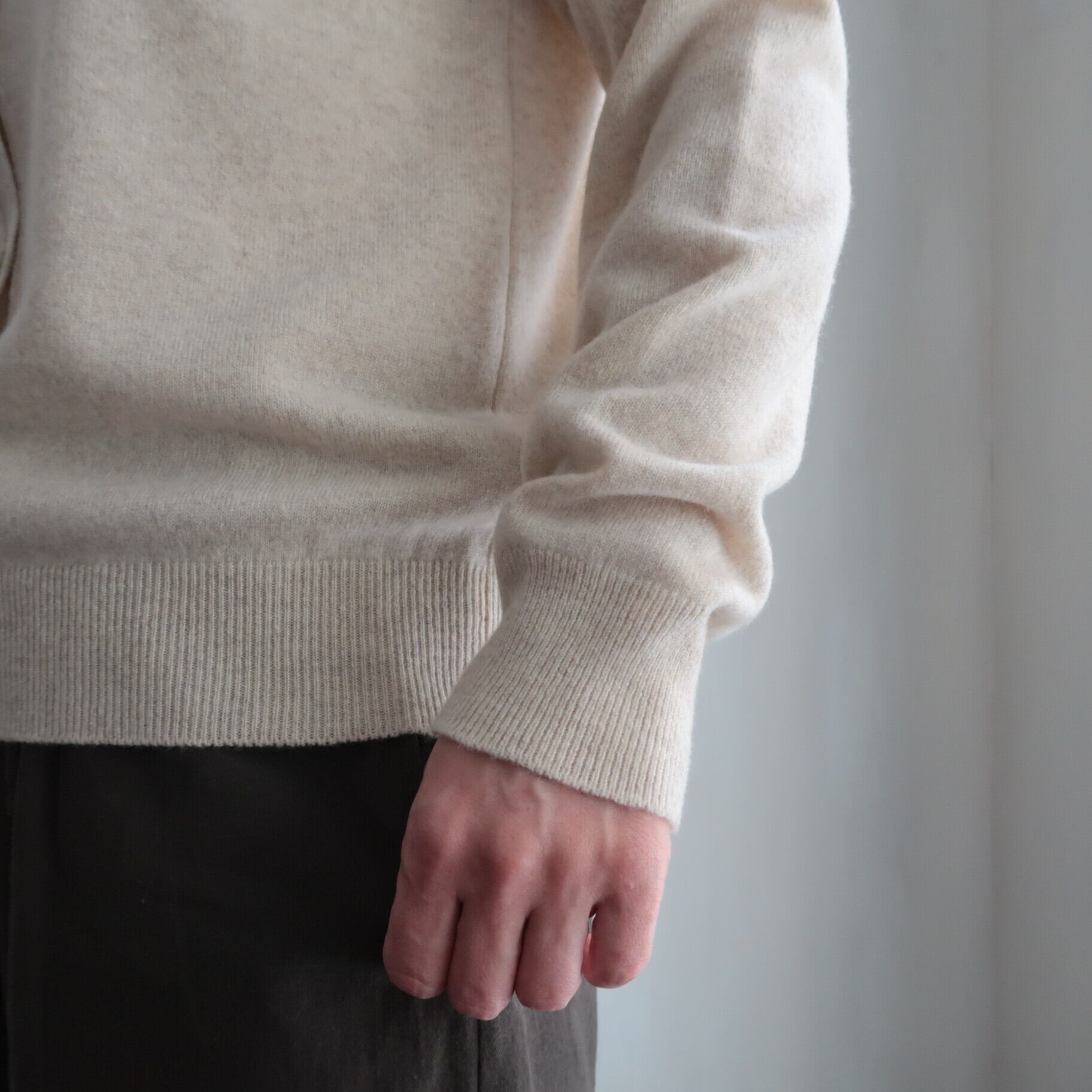 こちらは、オーストラリアのロジン地方で産出される、スーパーエクストラファインラムという、17.5~18.5マイクロンの細く高品質のラムウールに、極細で希少なホワイトカシミヤをMixして編み立てられた、軽い着心地のウール×カシミヤのニット。ウールベースで編地がしっかりしているので、気兼ねなく普段使いできるのが魅力です。