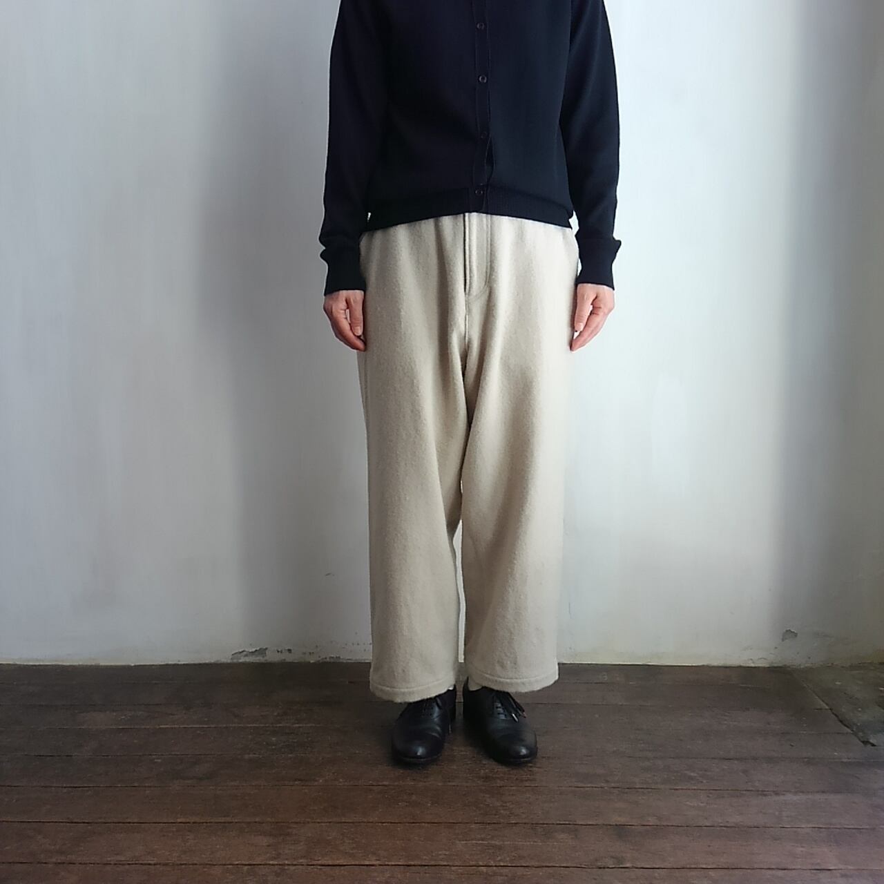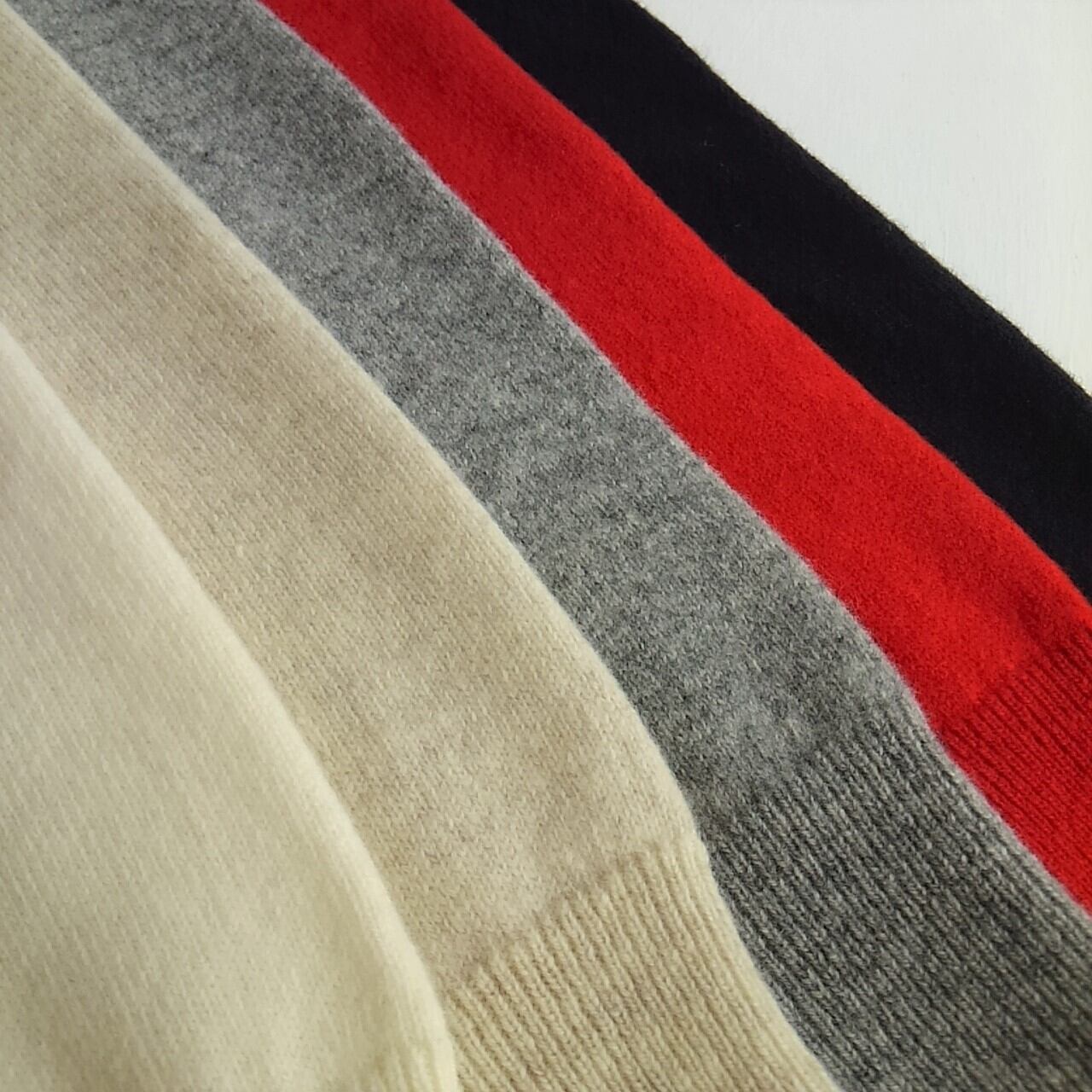 こちらは、オーストラリアのジロン地方で産出される、スーパーエクストラファインラムという、17.5~18.5マイクロンの細く高品質のラムウールに、極細で希少なホワイトカシミヤをMixして編み立てられた、軽い着心地のウール×カシミヤのニット。ウールベースで編地がしっかりしているので、気兼ねなく普段使いできるのが魅力です。