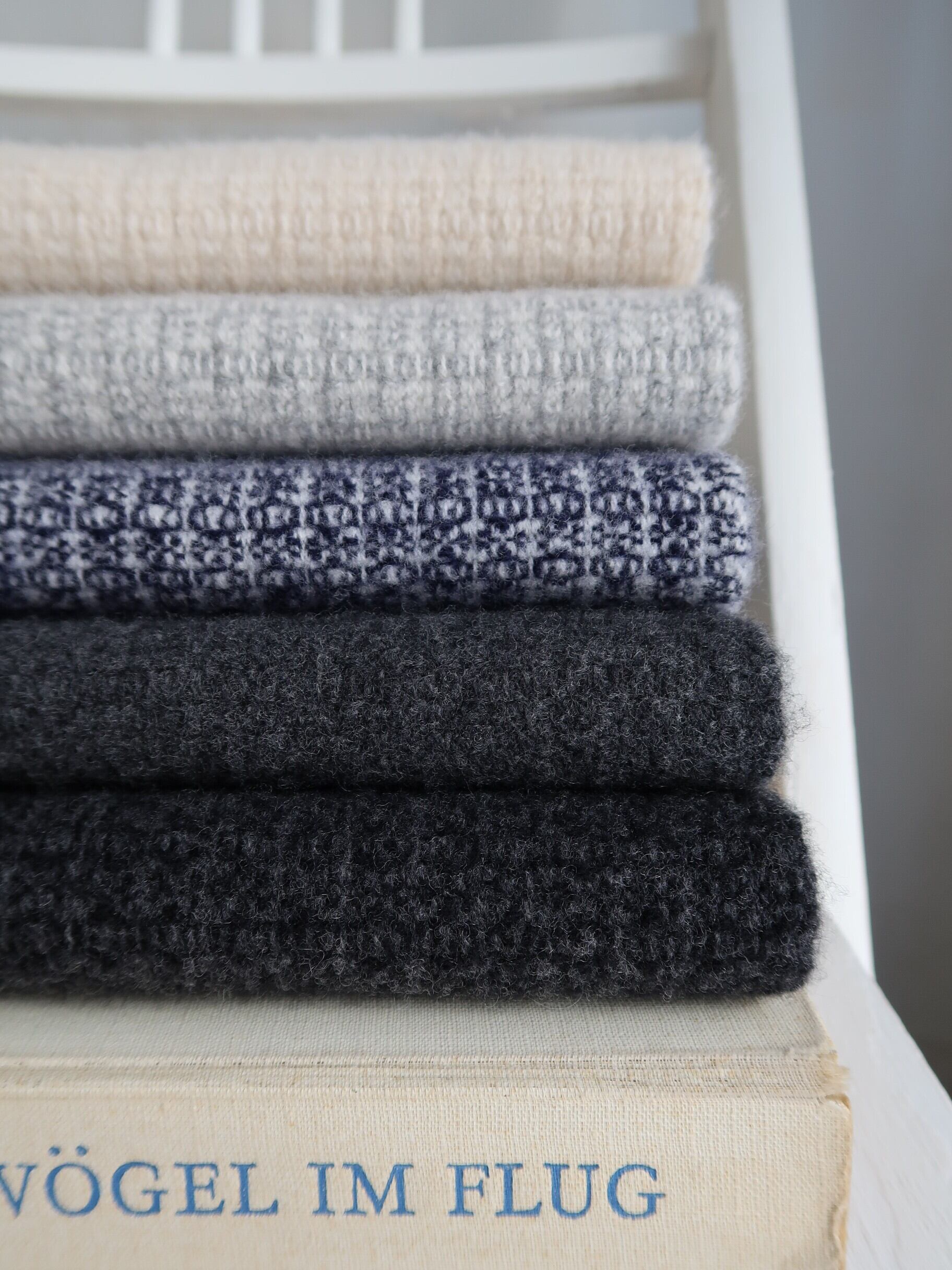 そのウール糸を、タテヨコで掛け合わせ組織織りにし、織り目を詰め過ぎず、ふっくらと厚みを出しながら織り上げました。
