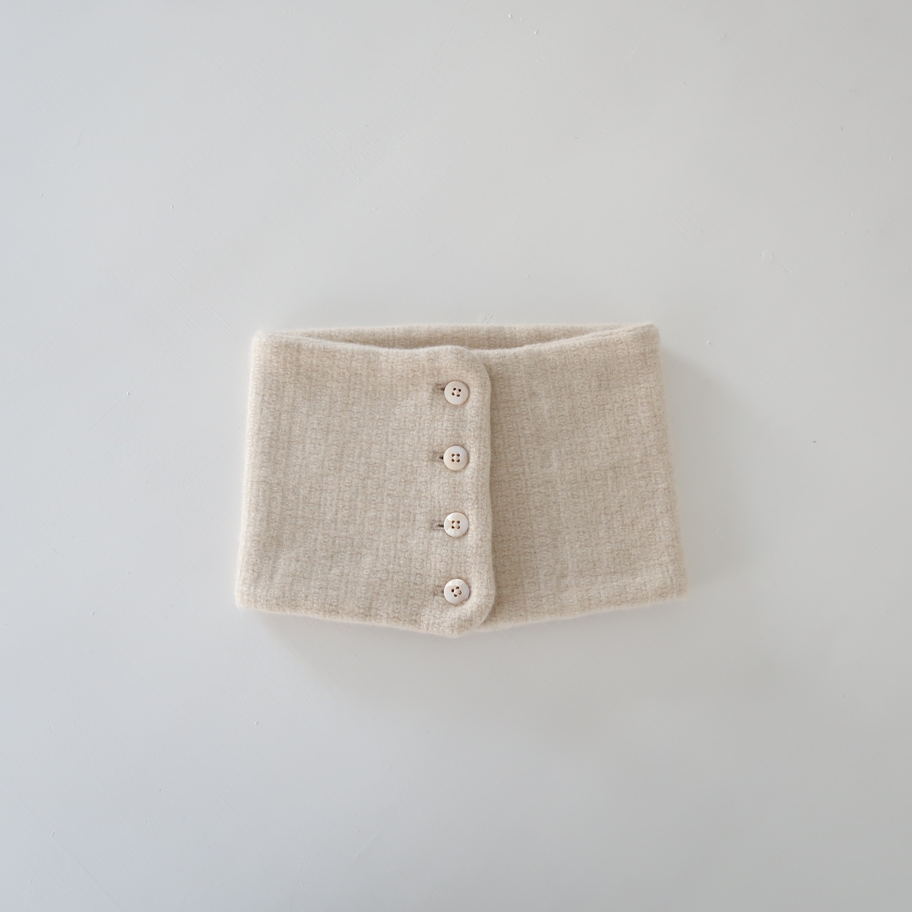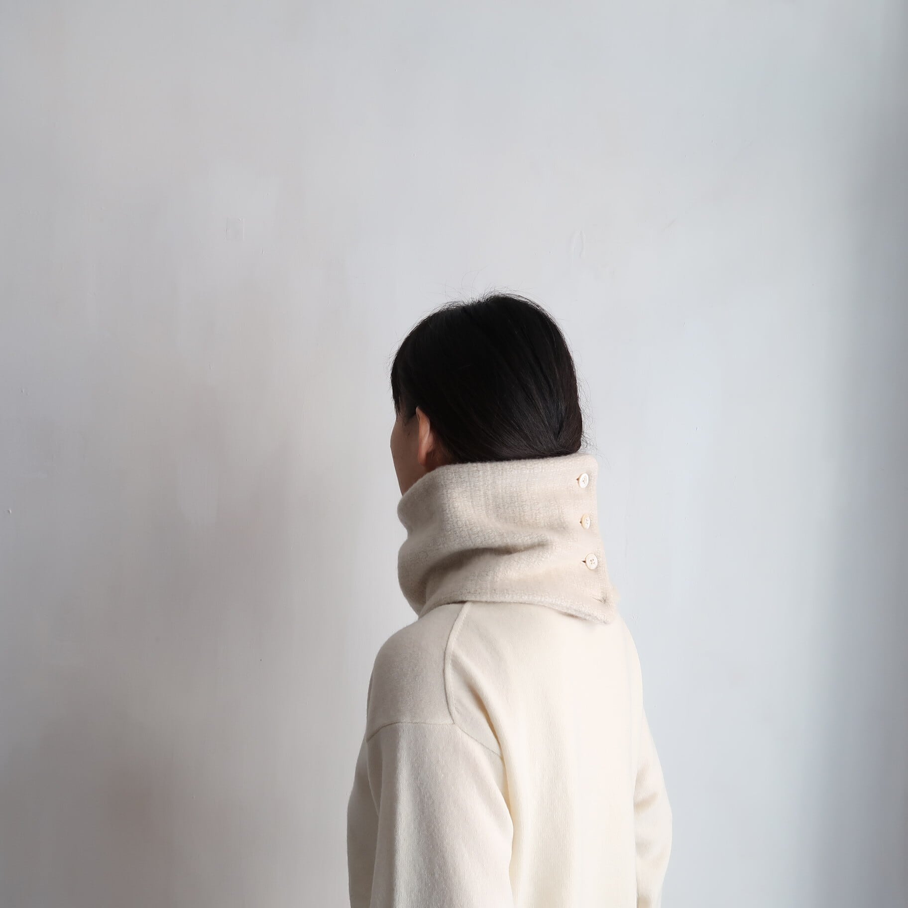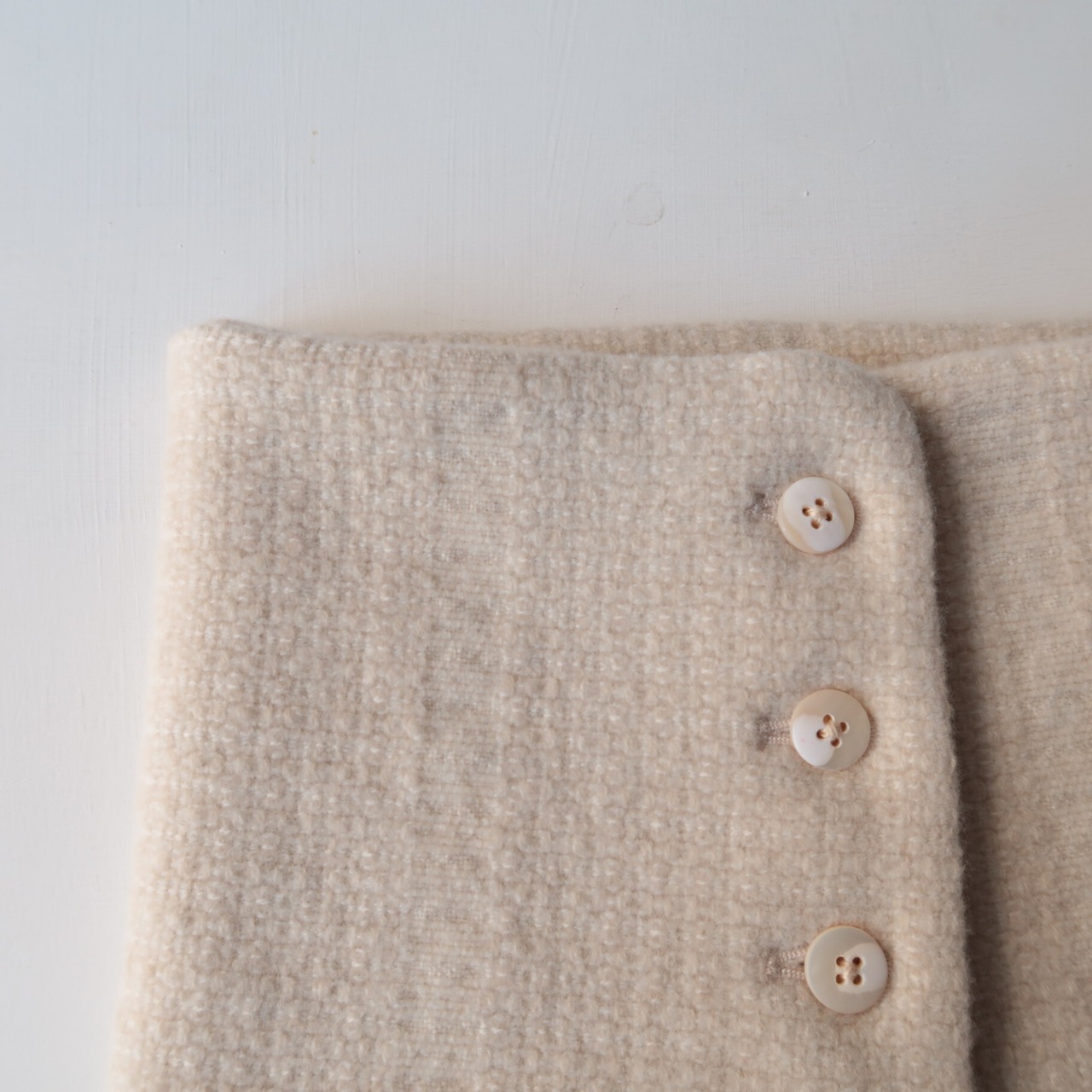 また、ネックカバーは、ボタン開きになっており、ボタンの位置を前後左右にすることで雰囲気を変えたり、ボタンの開閉によって、つけ襟っぽくしたり、、、色々と試しながら、どうぞお楽しみ下さい。