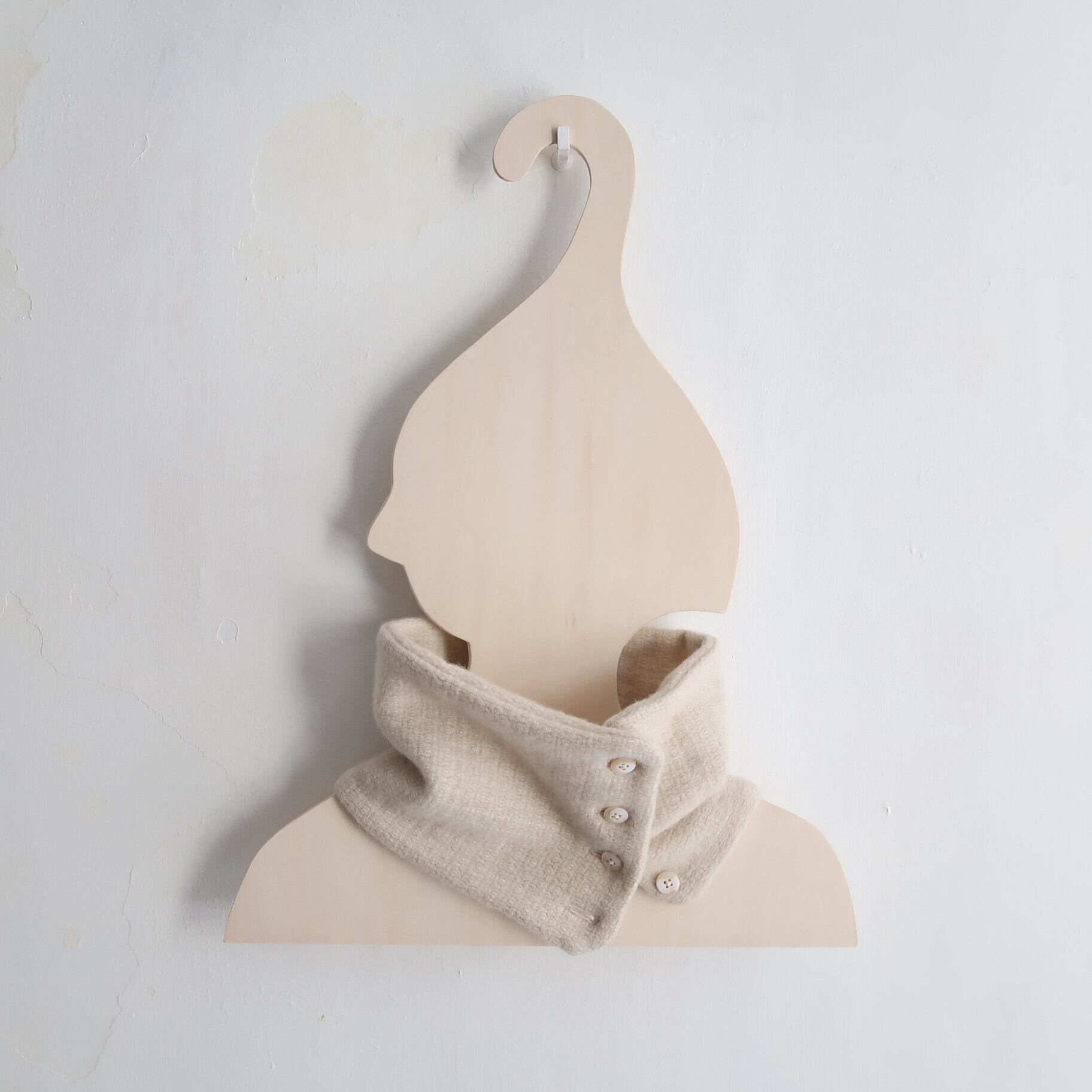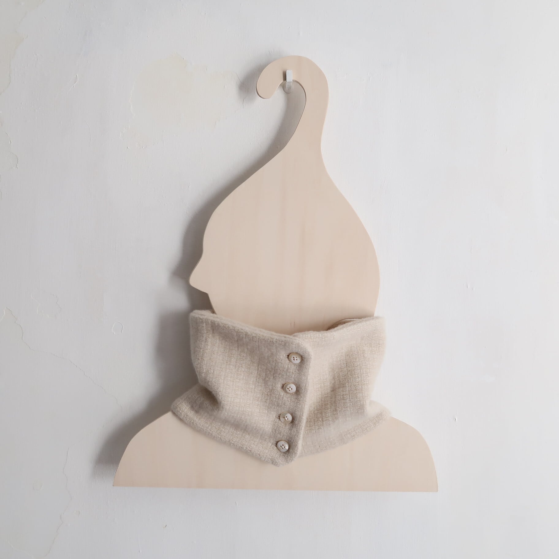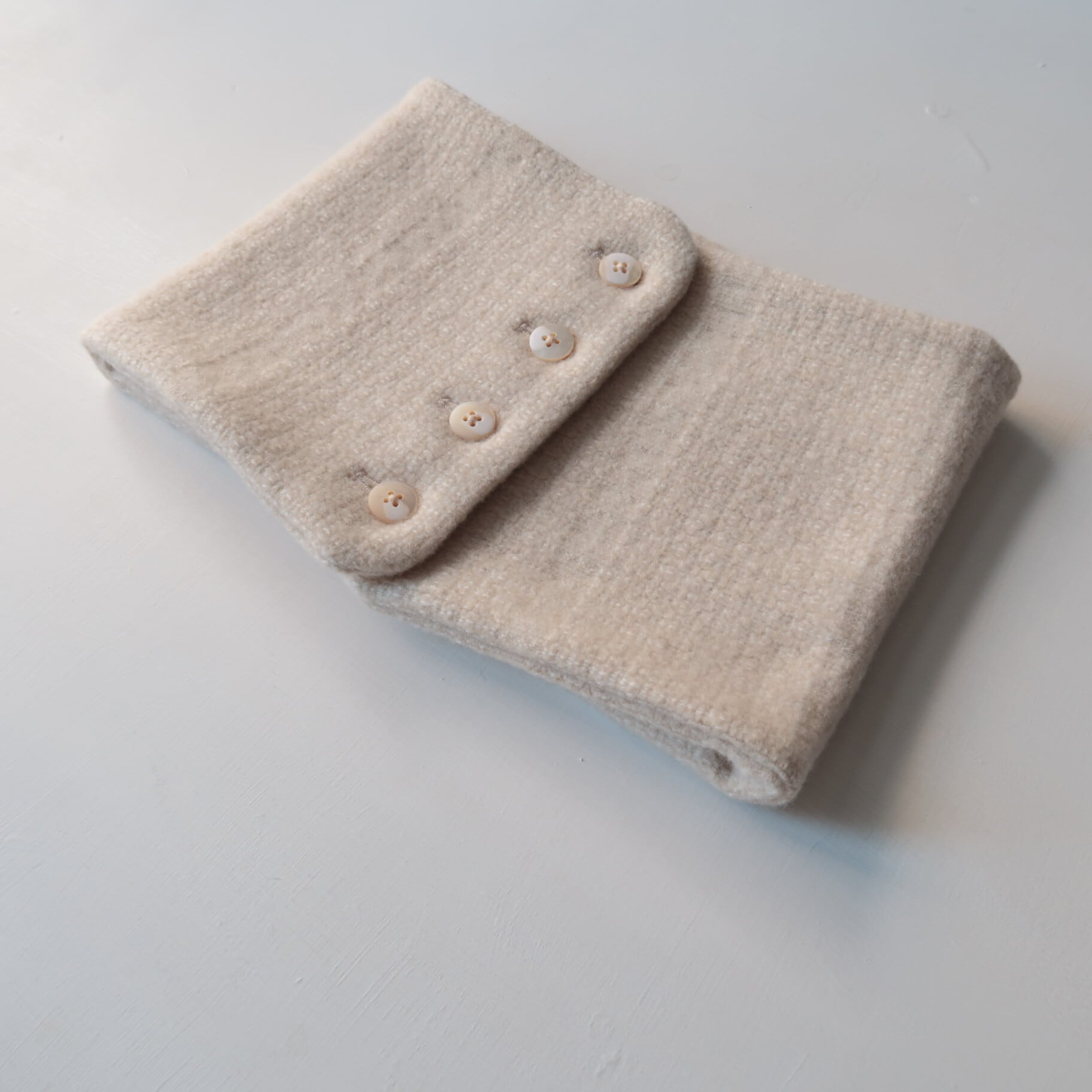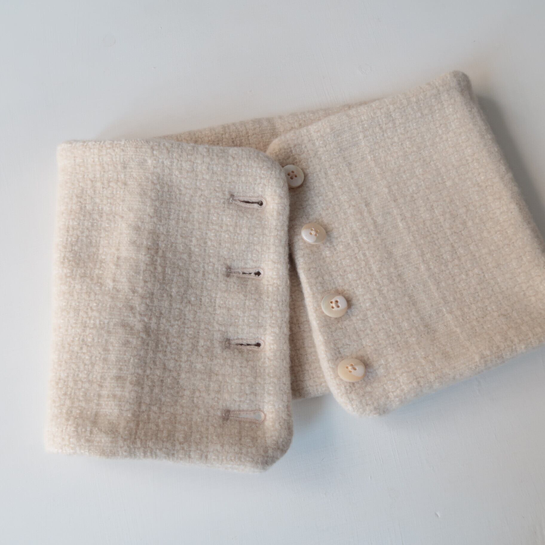 また、ネックカバーは、ボタン開きになっており、ボタンの位置を前後左右にすることで雰囲気を変えたり、ボタンの開閉によって、つけ襟っぽくしたり、、、色々と試しながら、どうぞお楽しみ下さい。