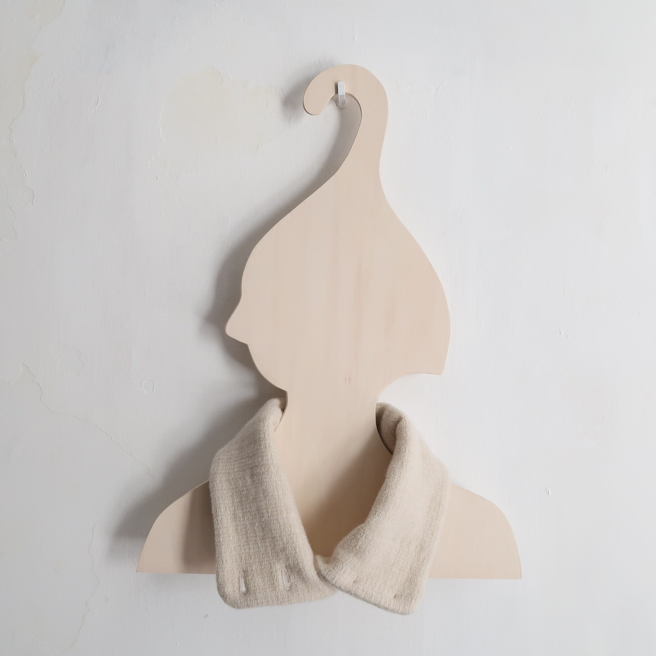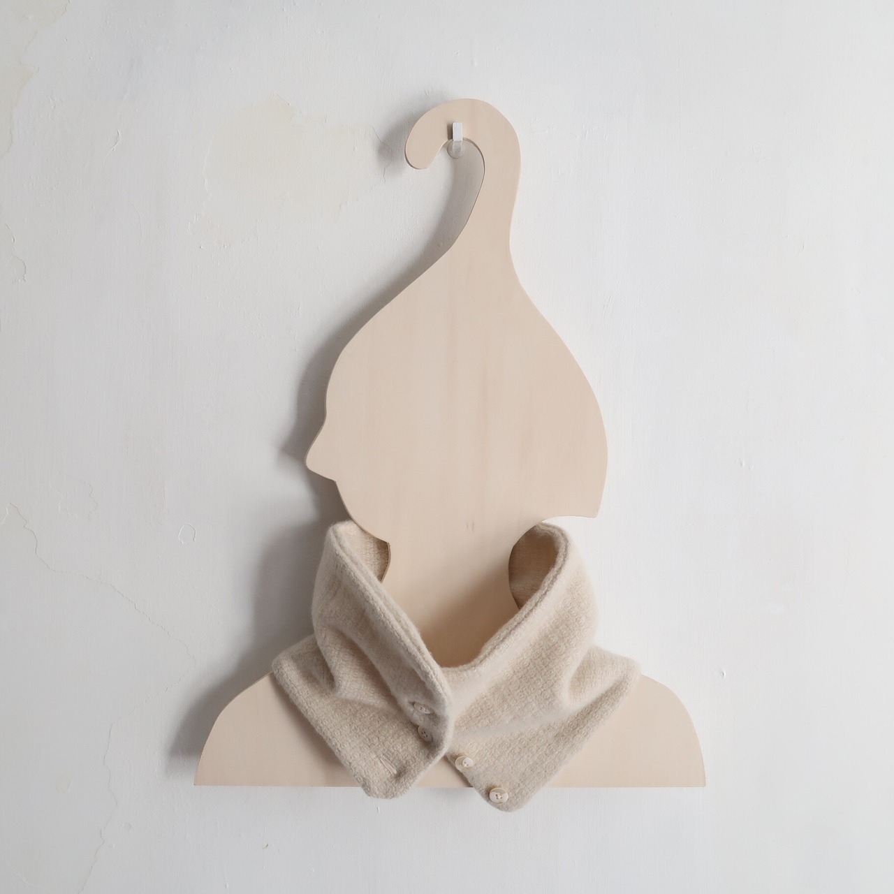 " puff " のふっくらとした厚みのある生地を、二重の仕立てにすることによって、保温力が高く、首元の収まりが良い感じで、ニットと布帛の、また、服とマフラーのちょうど中間的なニュアンスに。