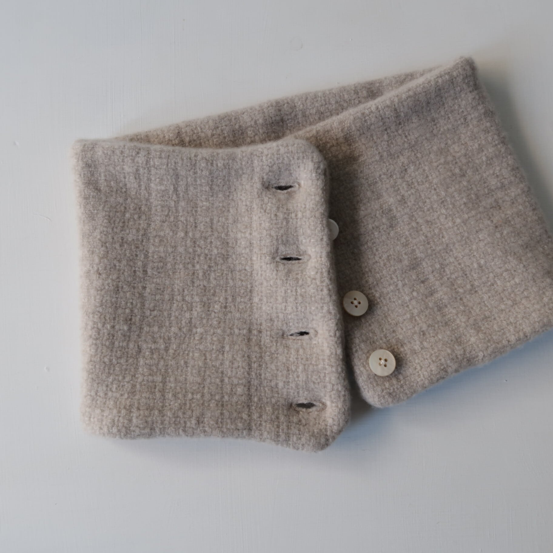 こちらは、その " puff " の布地を使用して、白~ベージュ、ブラウン、グレー、ネイビー等のベーシックカラー中心に、ネックカバーを制作しました。