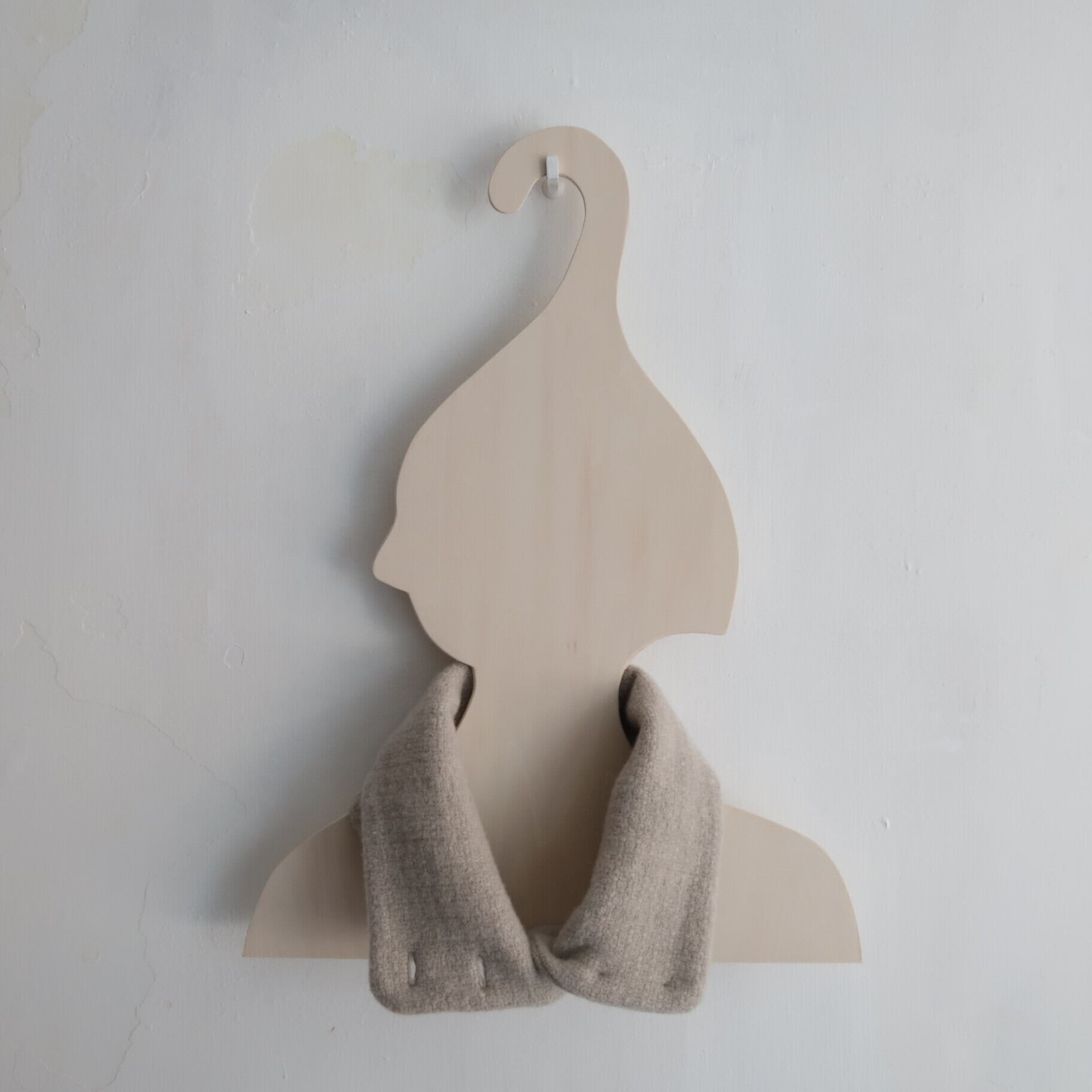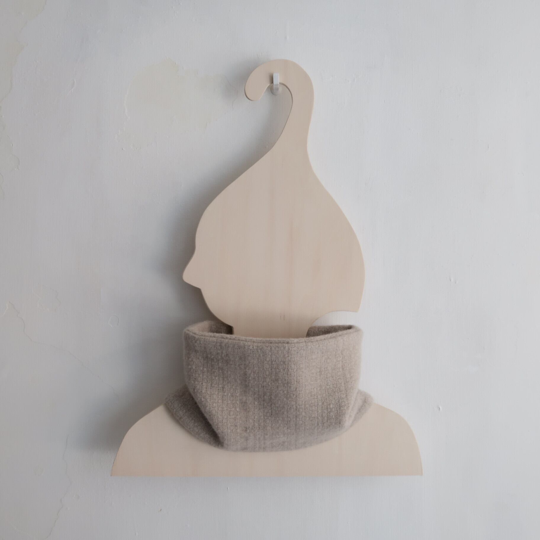 " puff " のふっくらとした厚みのある生地を、二重の仕立てにすることによって、保温力が高く、首元の収まりが良い感じで、ニットと布帛の、また、服とマフラーのちょうど中間的なニュアンスに。
