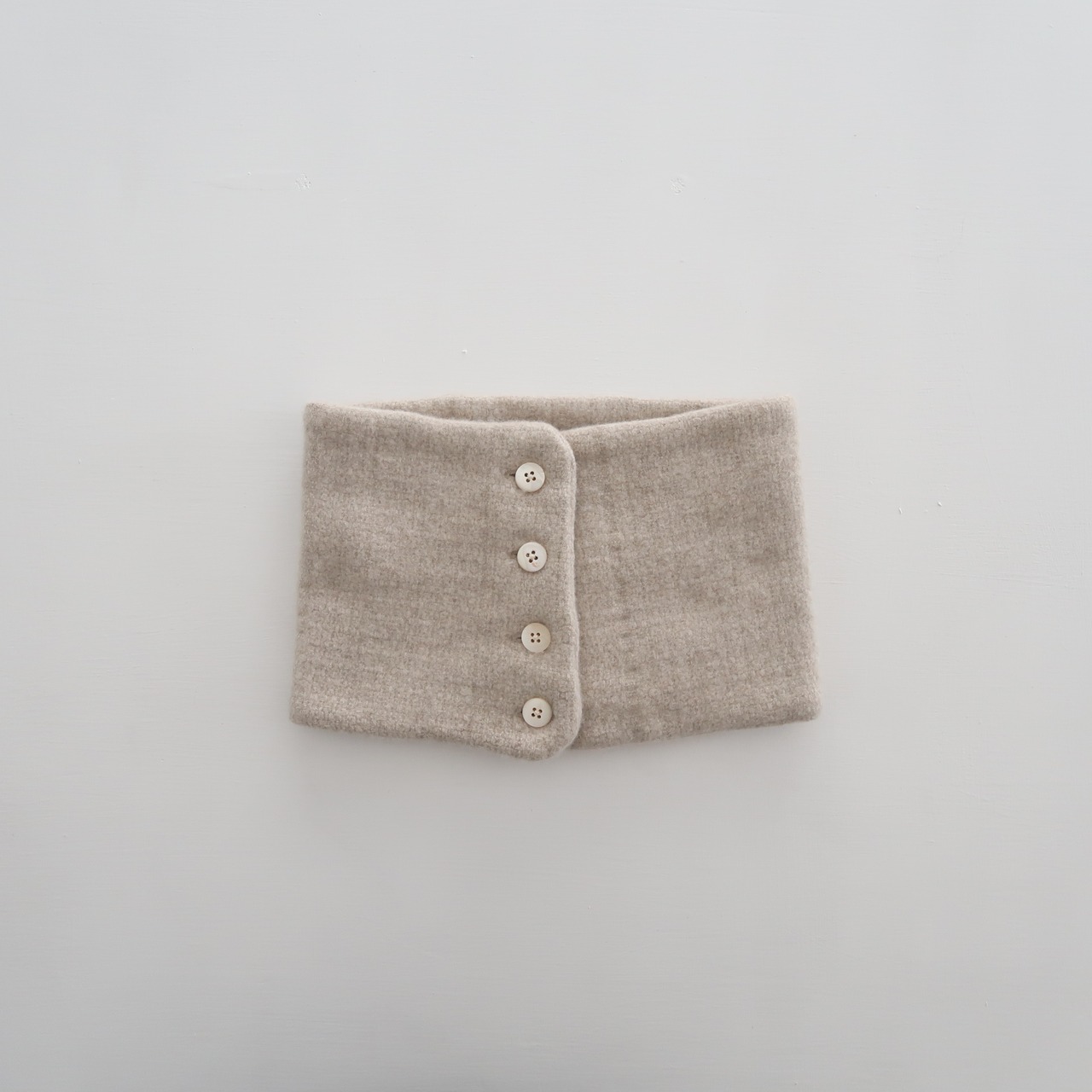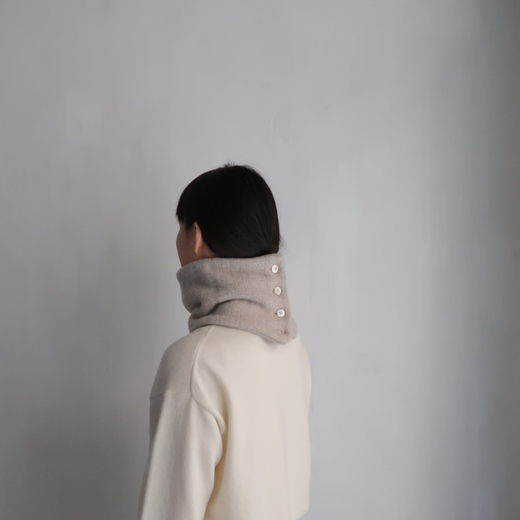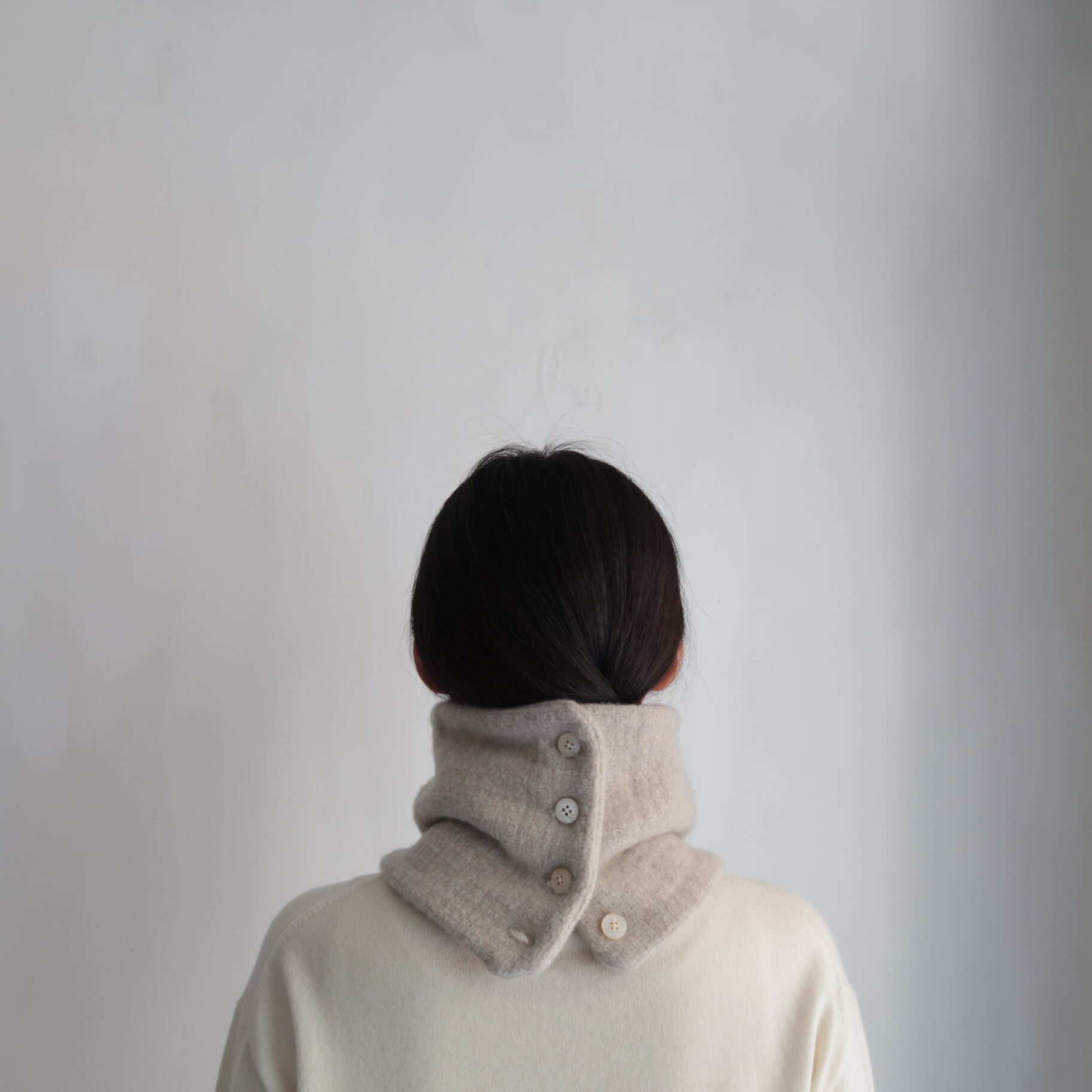 また、ネックカバーは、ボタン開きになっており、ボタンの位置を前後左右にすることで雰囲気を変えたり、ボタンの開閉によって、つけ襟っぽくしたり、、、色々と試しながら、どうぞお楽しみ下さい。