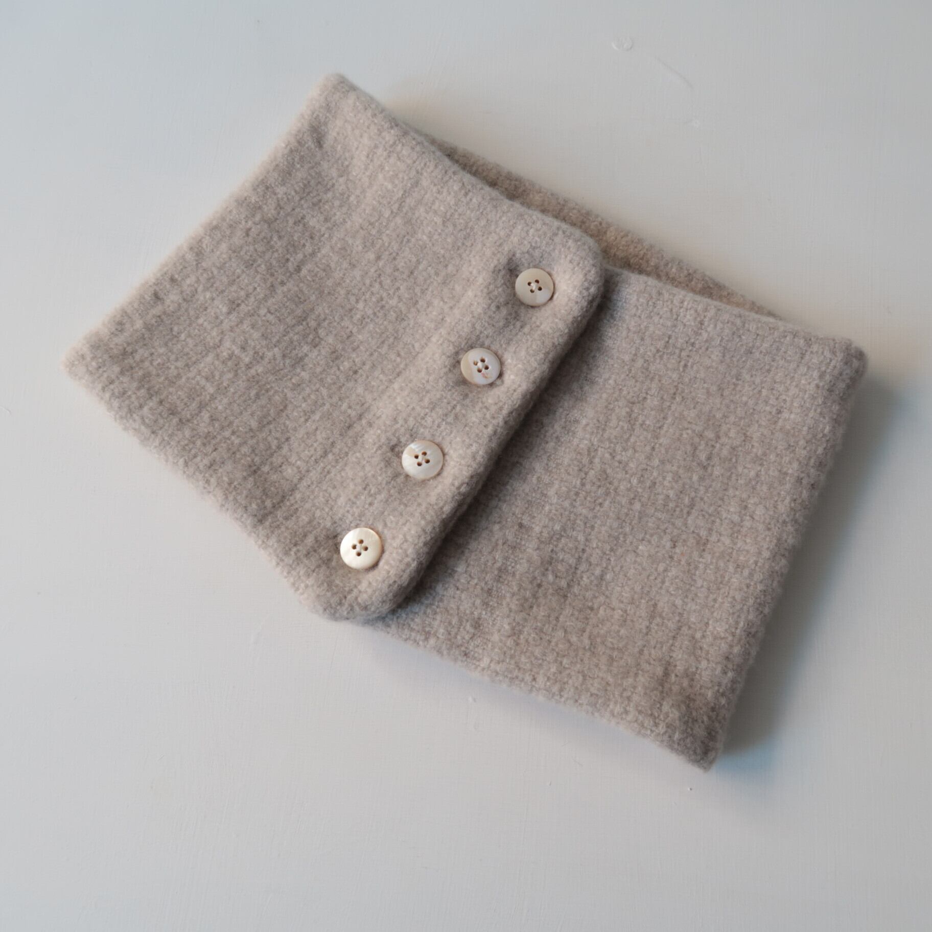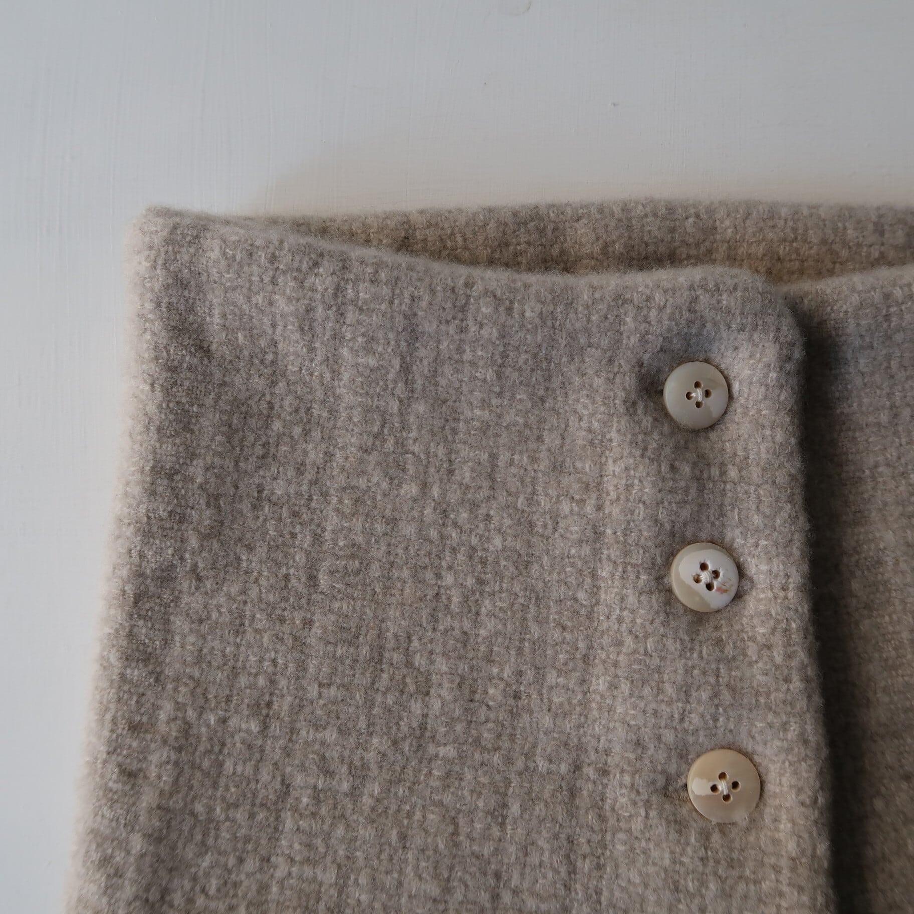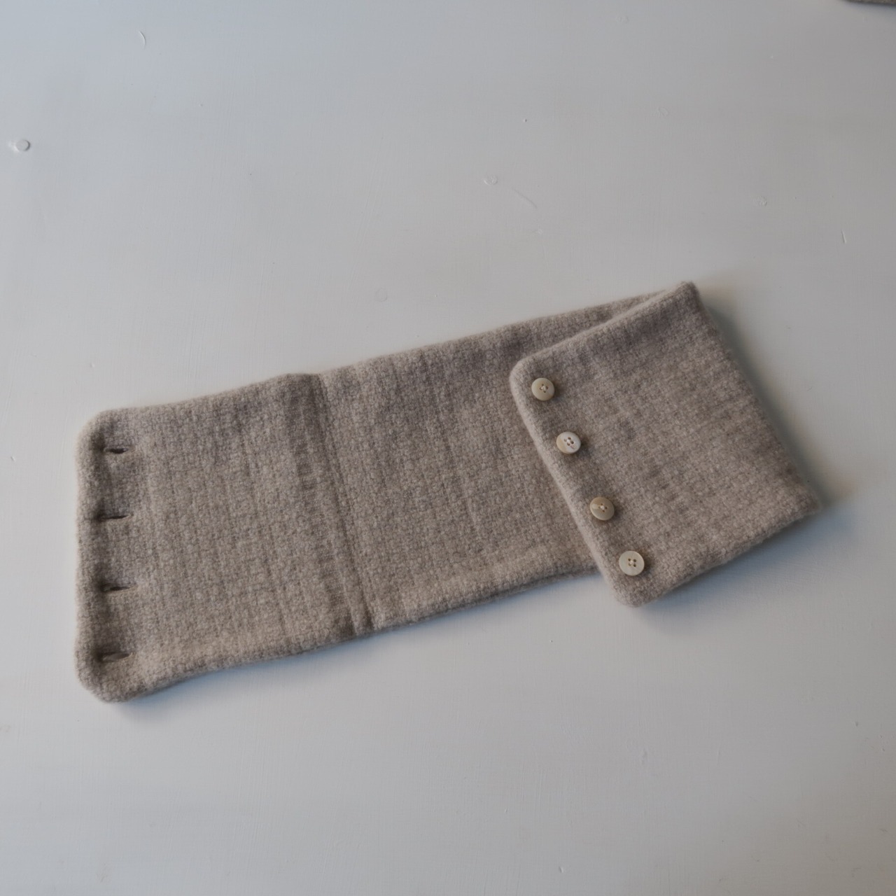 また、ネックカバーは、ボタン開きになっており、ボタンの位置を前後左右にすることで雰囲気を変えたり、ボタンの開閉によって、つけ襟っぽくしたり、、、色々と試しながら、どうぞお楽しみ下さい。