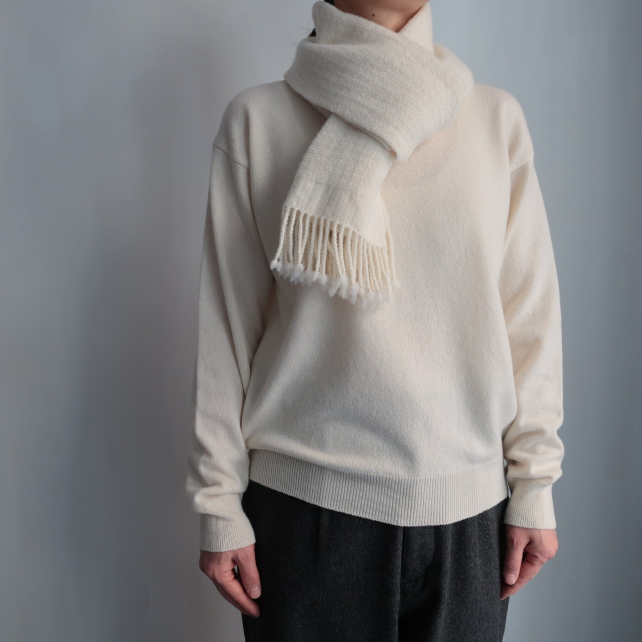 サイズは、首元にコンパクトに巻いて頂けるサイズ感になっています。( 他、大判でショールとしてもお使い頂けるサイズのものもあります。)