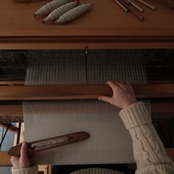 ( 大阪 貝塚 のアトリエの手機で、一つ一つ織っています。)