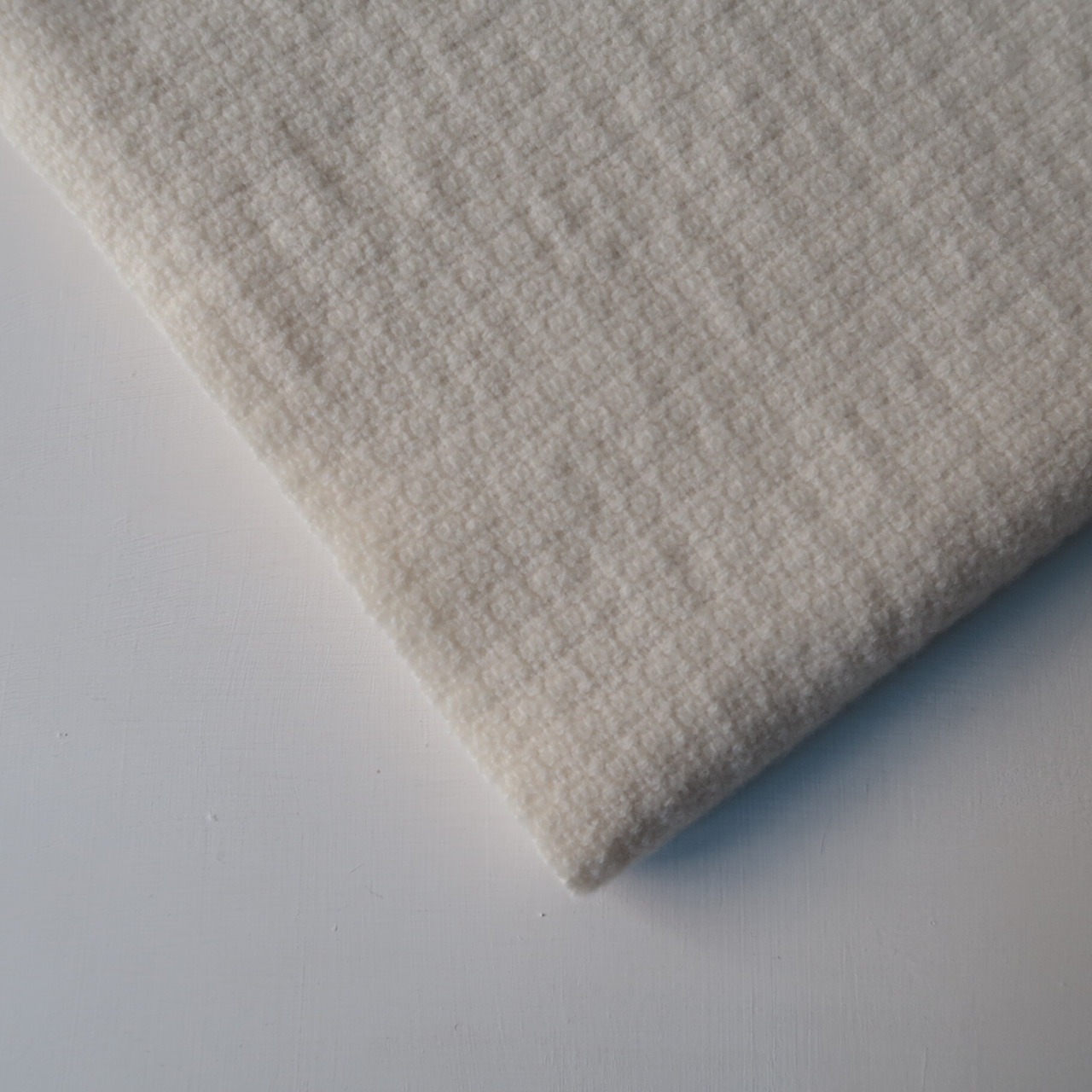 そのウール糸を、タテヨコで掛け合わせ組織織りにし、織り目を詰め過ぎず、ふっくらと厚みを出しながら織り上げました。