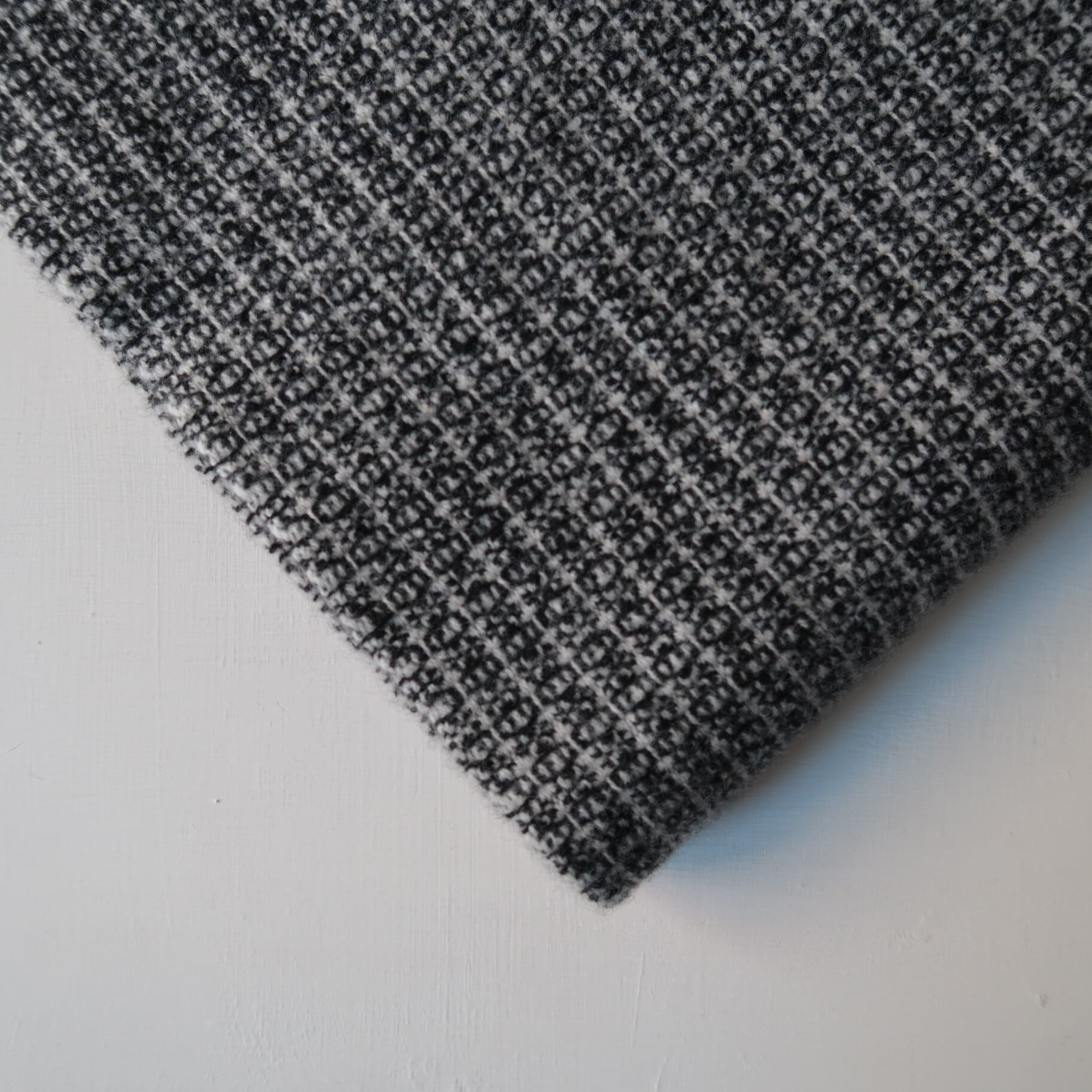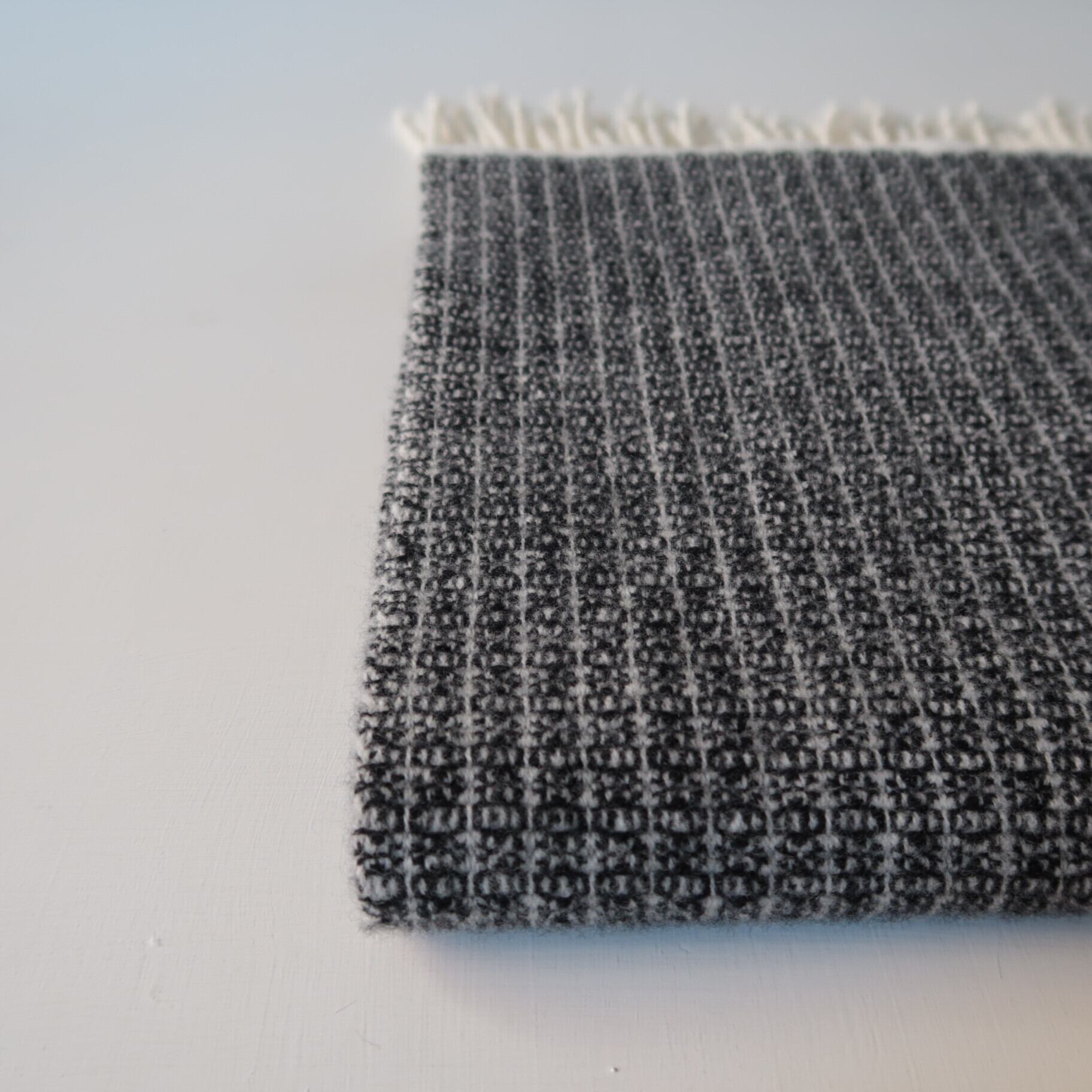 そのウール糸を、タテヨコで色の差がある糸を掛け合わせ組織織りにし、織り目を詰め過ぎず、ふっくらと厚みを出しながら、また、織り柄が比較的はっきりと出る様に織り上げました。