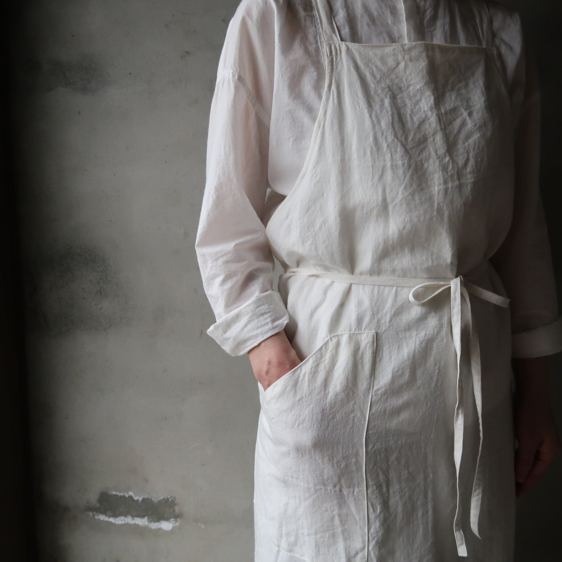 今回、エプロンを制作するのにあたって選んだ素材は、高密度に織られたベルギー コルトレイクのリネン生地。