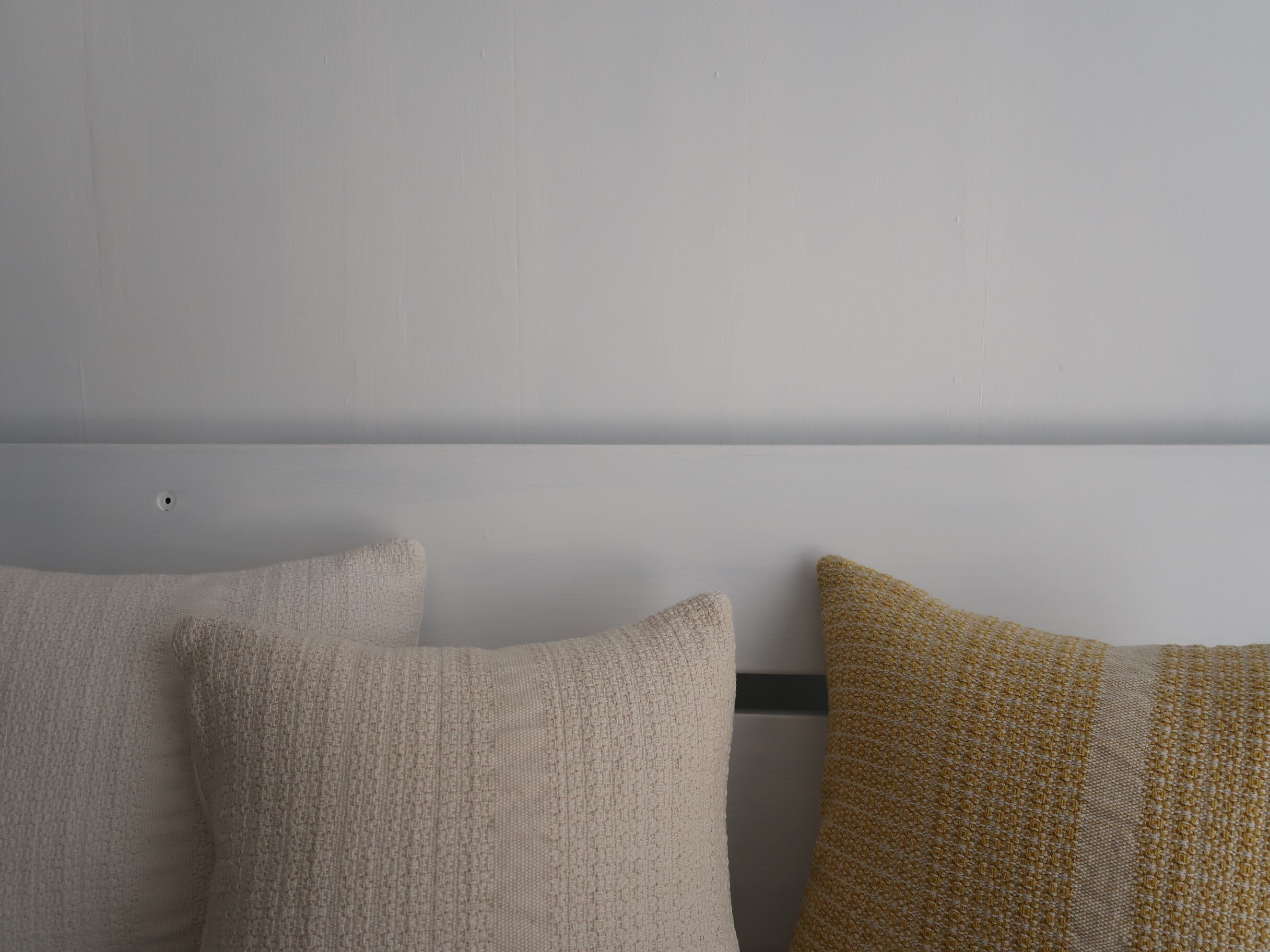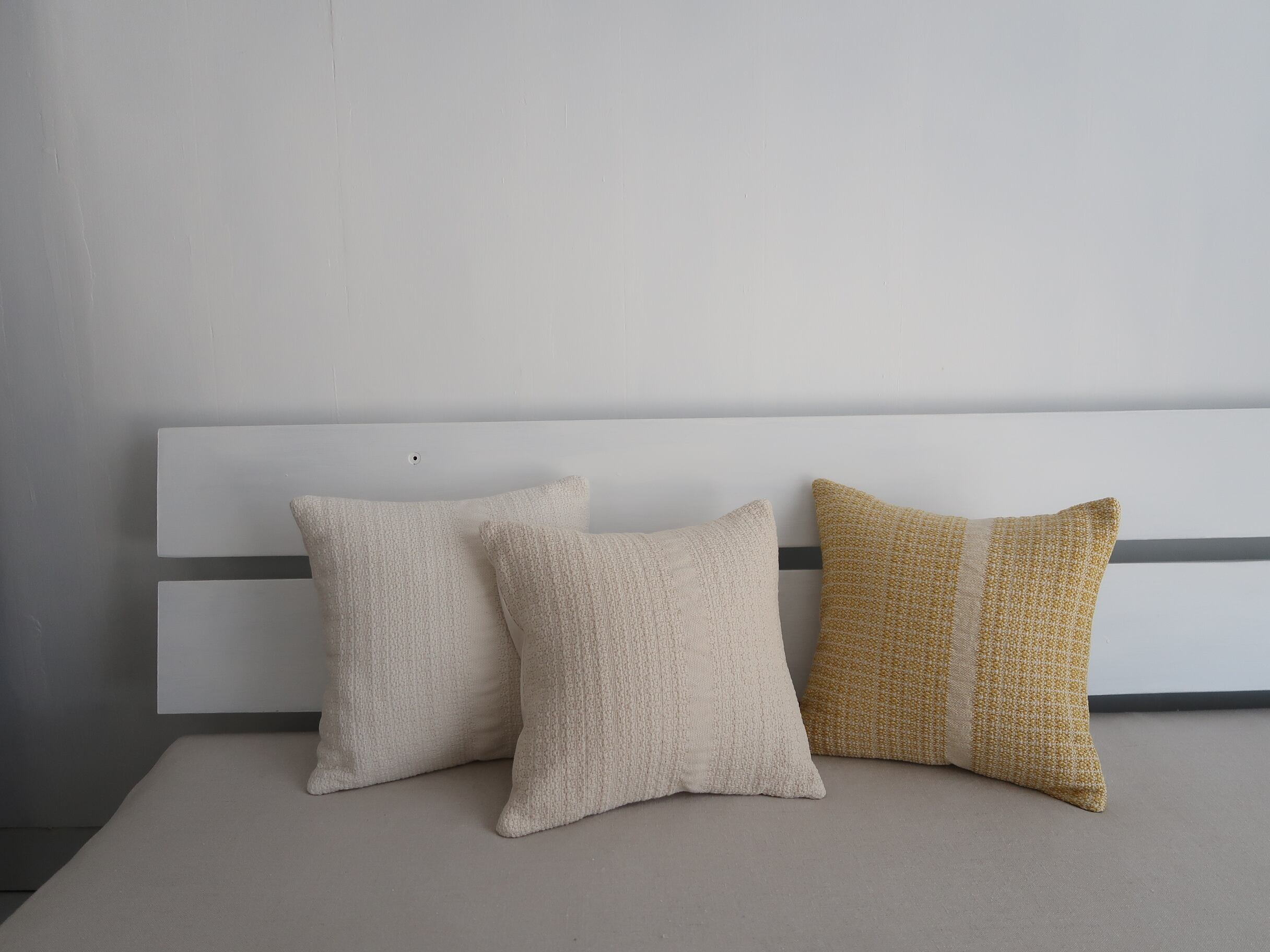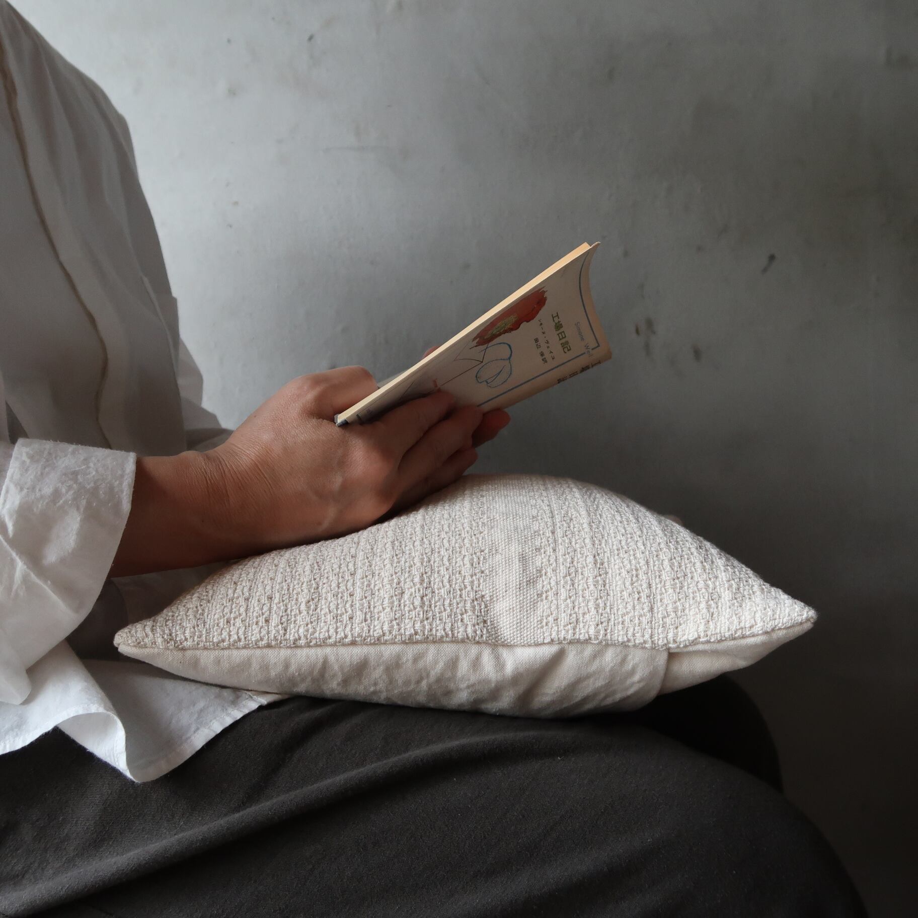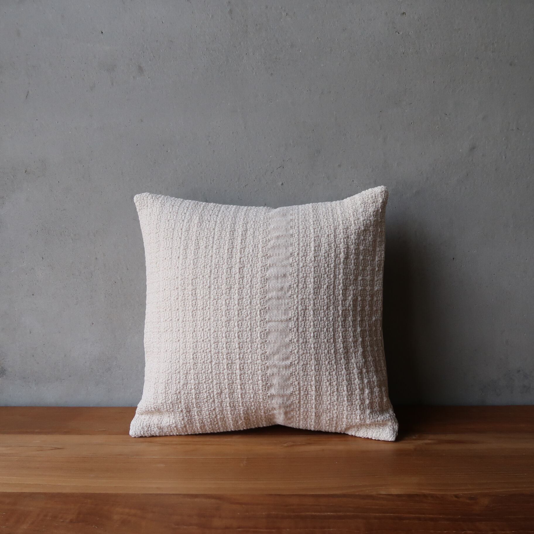 what is there で継続的に織り続けている、その " mosaic "のテキスタイルを使用して、30cm角のミニクッションを制作致しました。 ( 表面は、mosaic のテキスタイル。裏面は 11号の綿帆布を使用。ポリエステル100%の中材付き。)