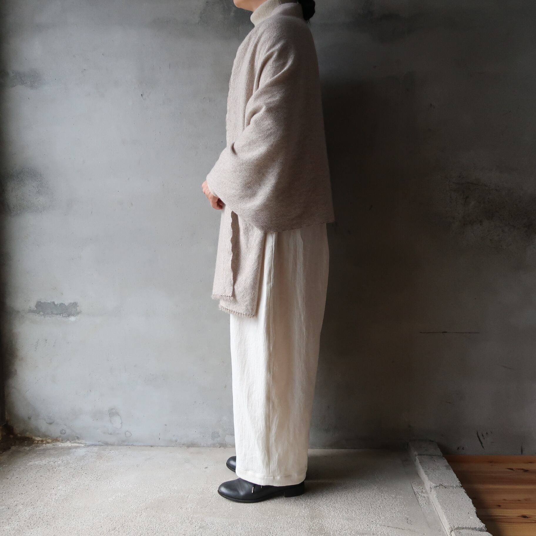 組織織りのものよりも薄手に感じられ、寒い冬の時期だけでなく、春先や秋口の少し肌寒さの残る時期に、薄手のブラウスやワンピース、カットソーの上にサラッと羽織ったりしてお使い頂くのにも、ちょうど良い厚みに仕上がっており、長い期間ご活用頂けるのも魅力です。