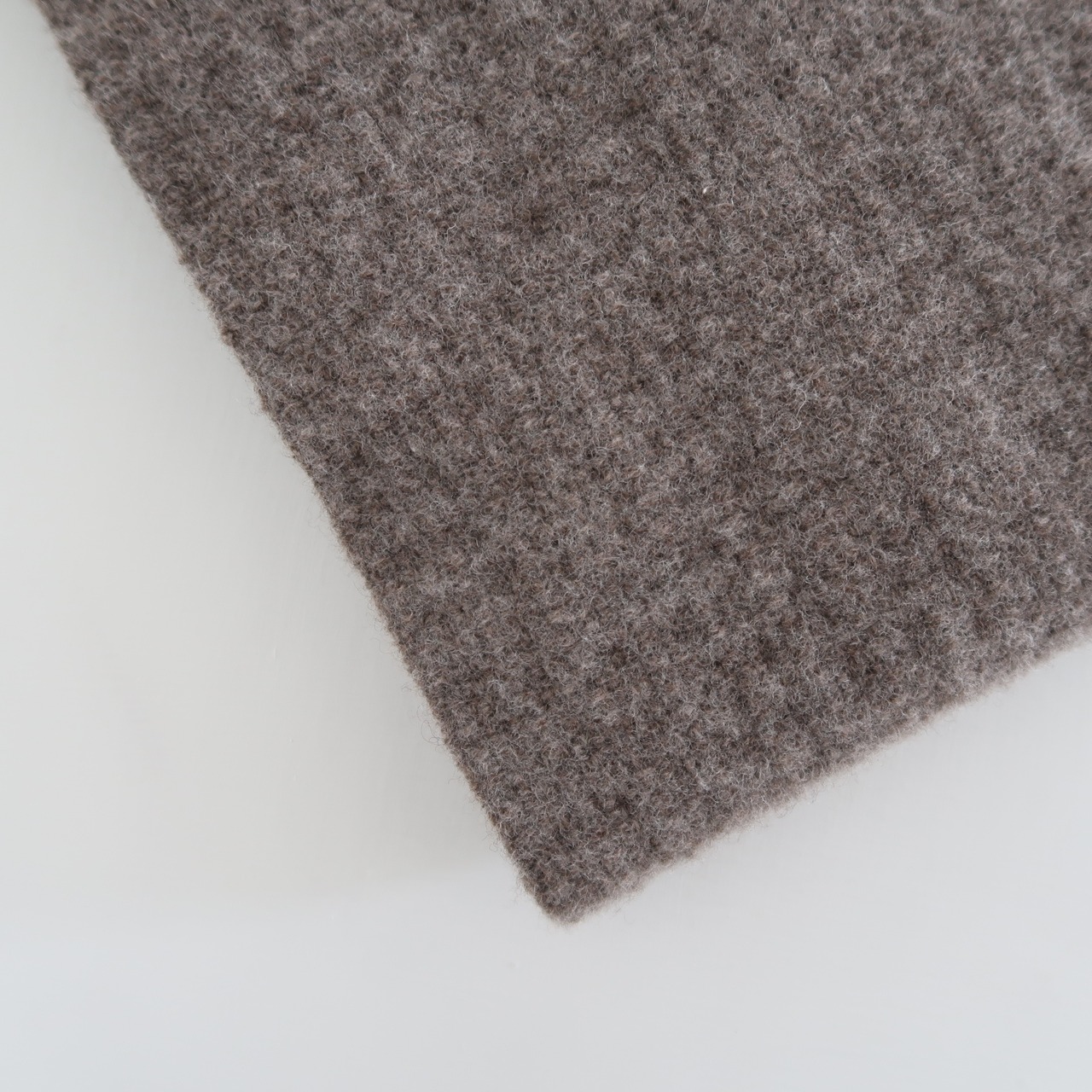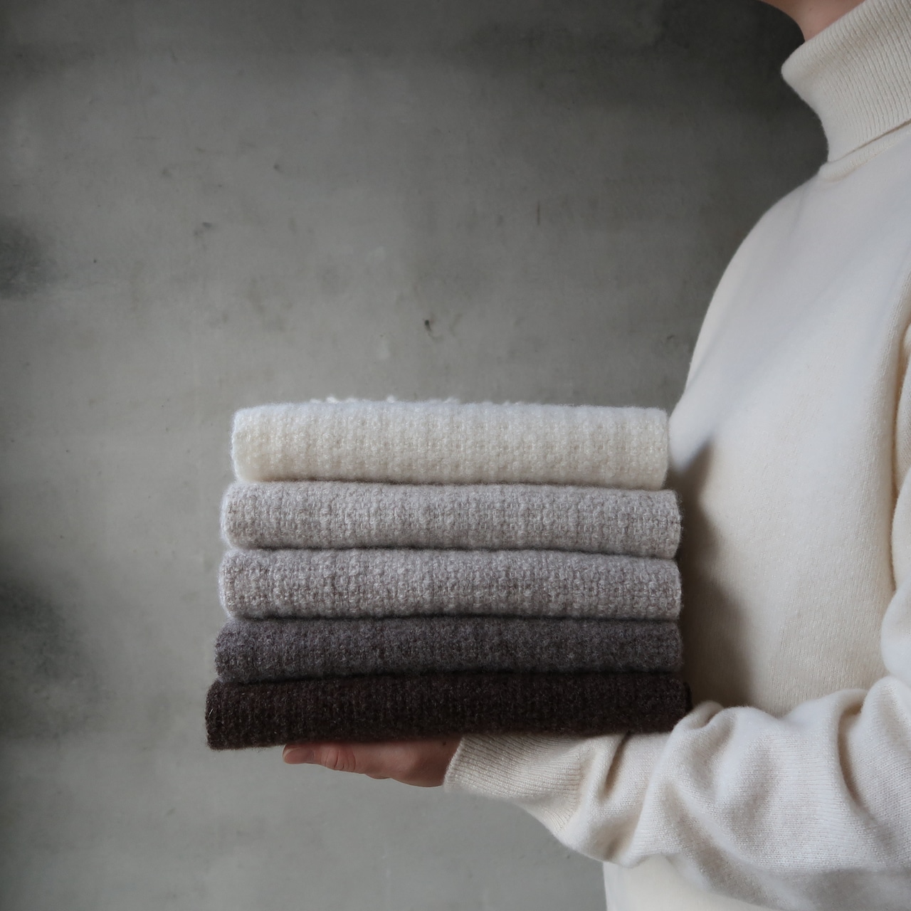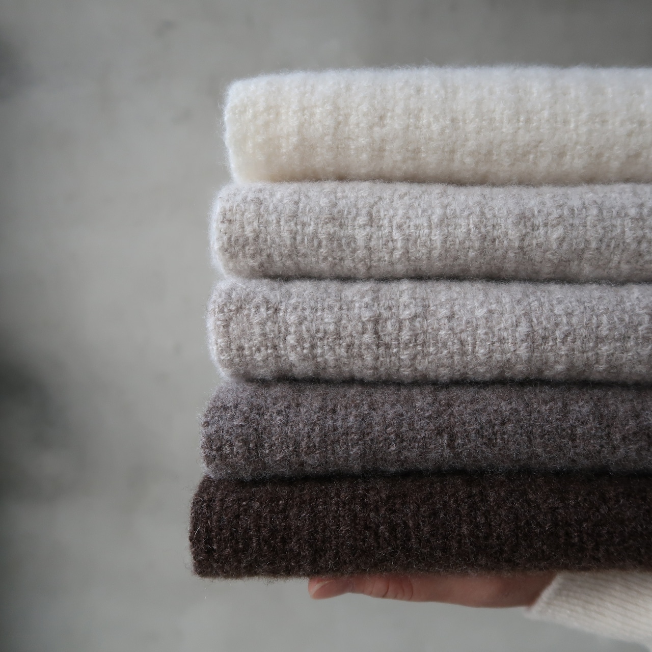ナチュラルウールというと、ガサっとして太く硬質なものを想像されるかもしれませんが、こちらは有色羊の中でも最も細い部類のウール( 約 20.5μ )になっており、羊本来の風合いがありつつも、肌触りの良いウールになっています。