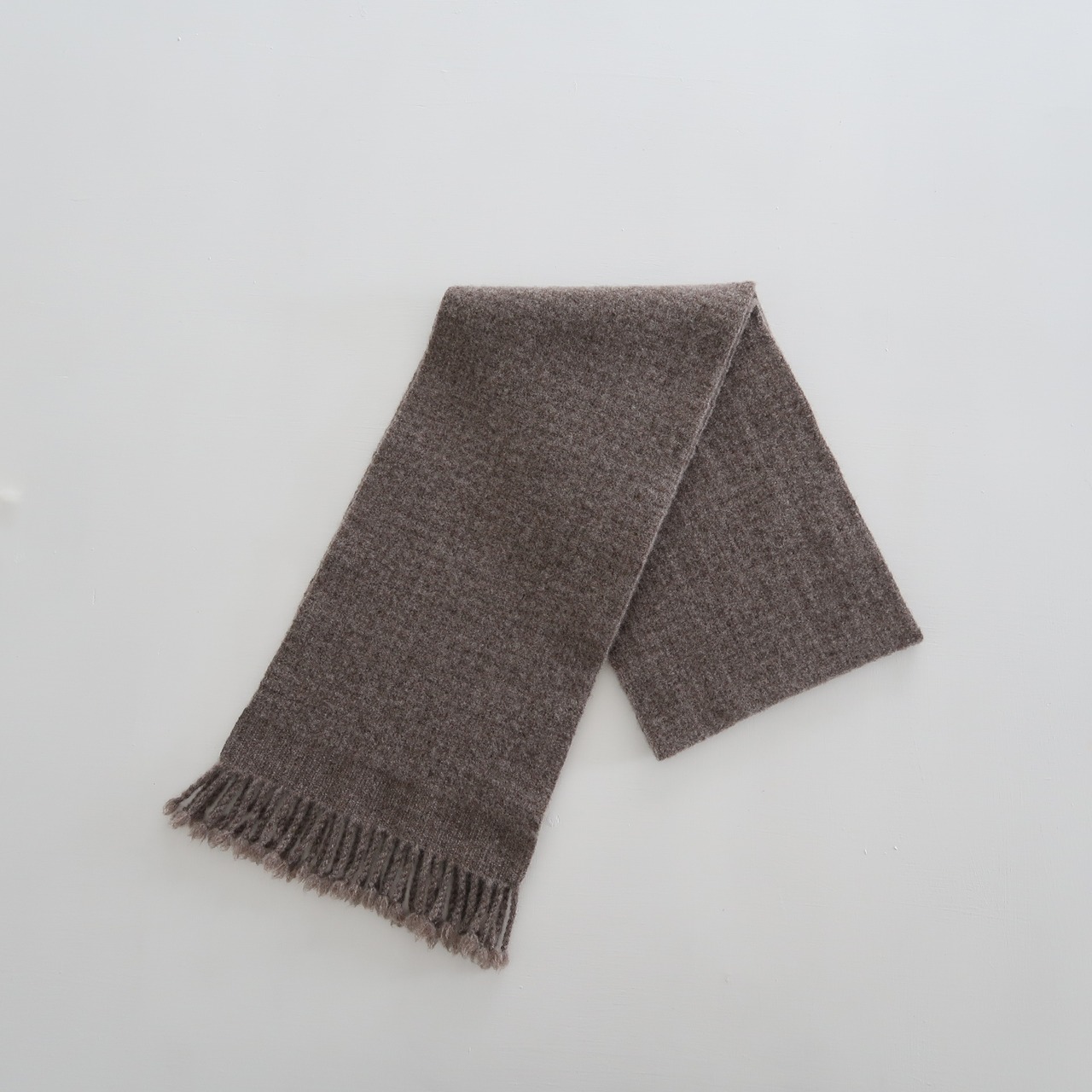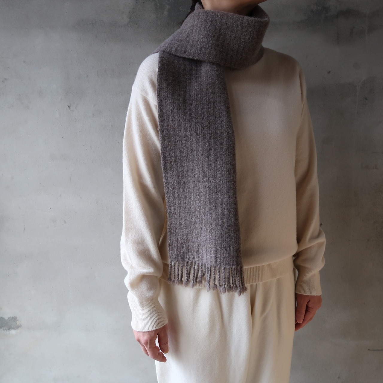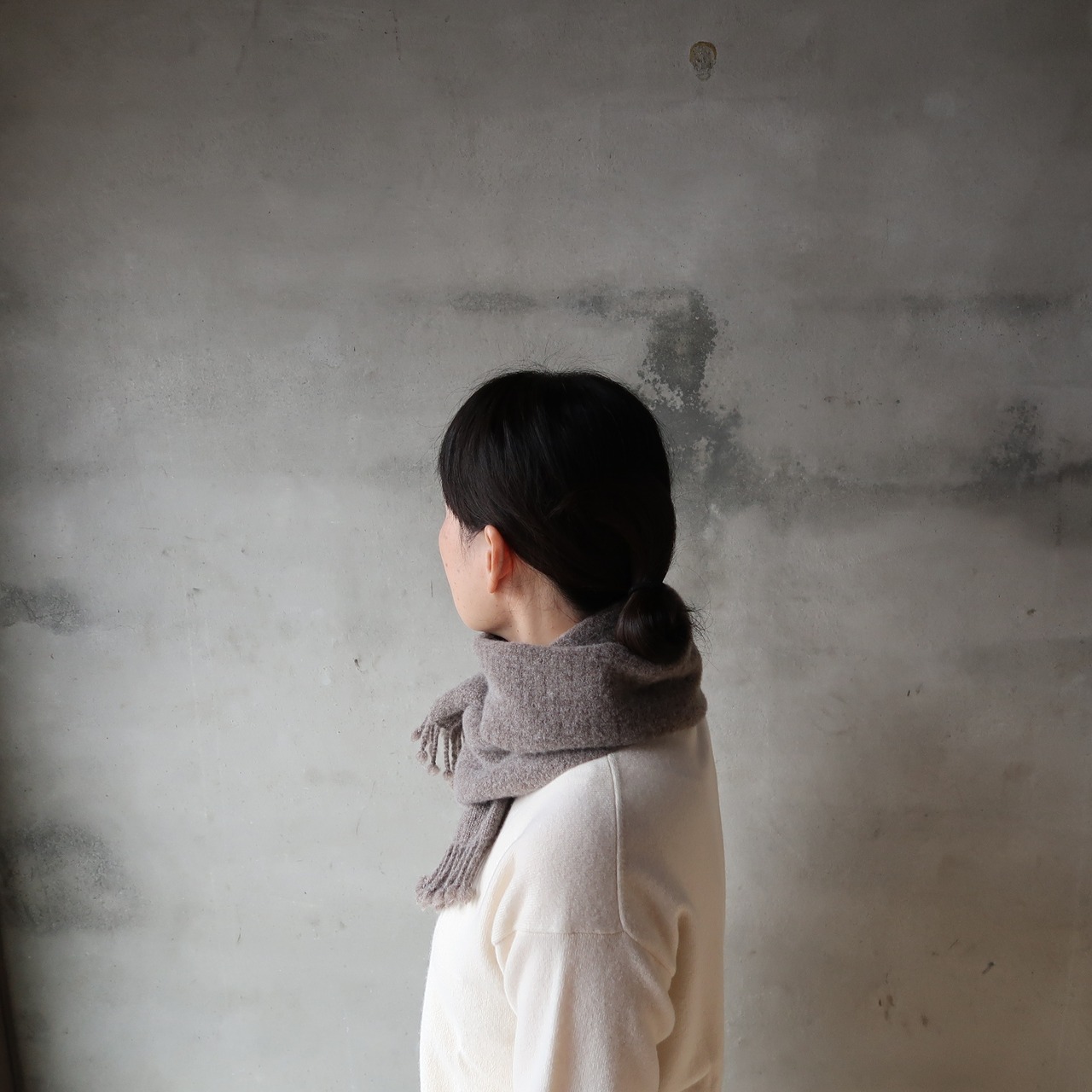 サイズは、首元にコンパクトに巻いて頂けるサイズ感になっています。( ニュージーランド産ウールのタイプより、やや厚みがあり、よりコンパクトなサイズに。 )