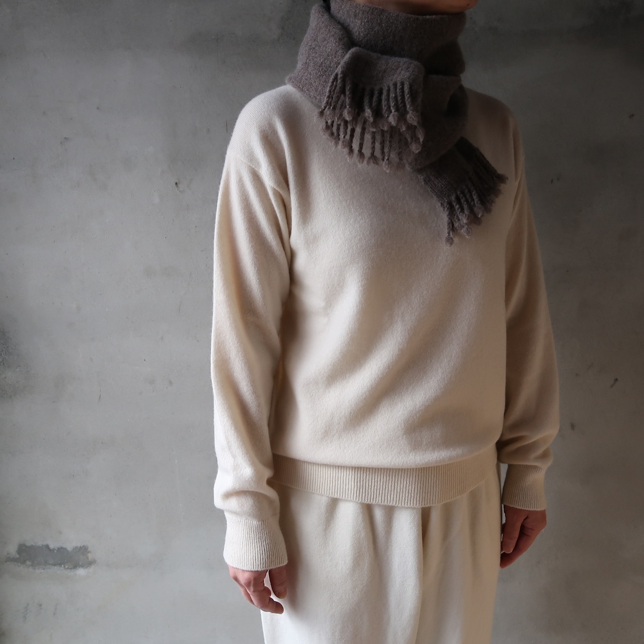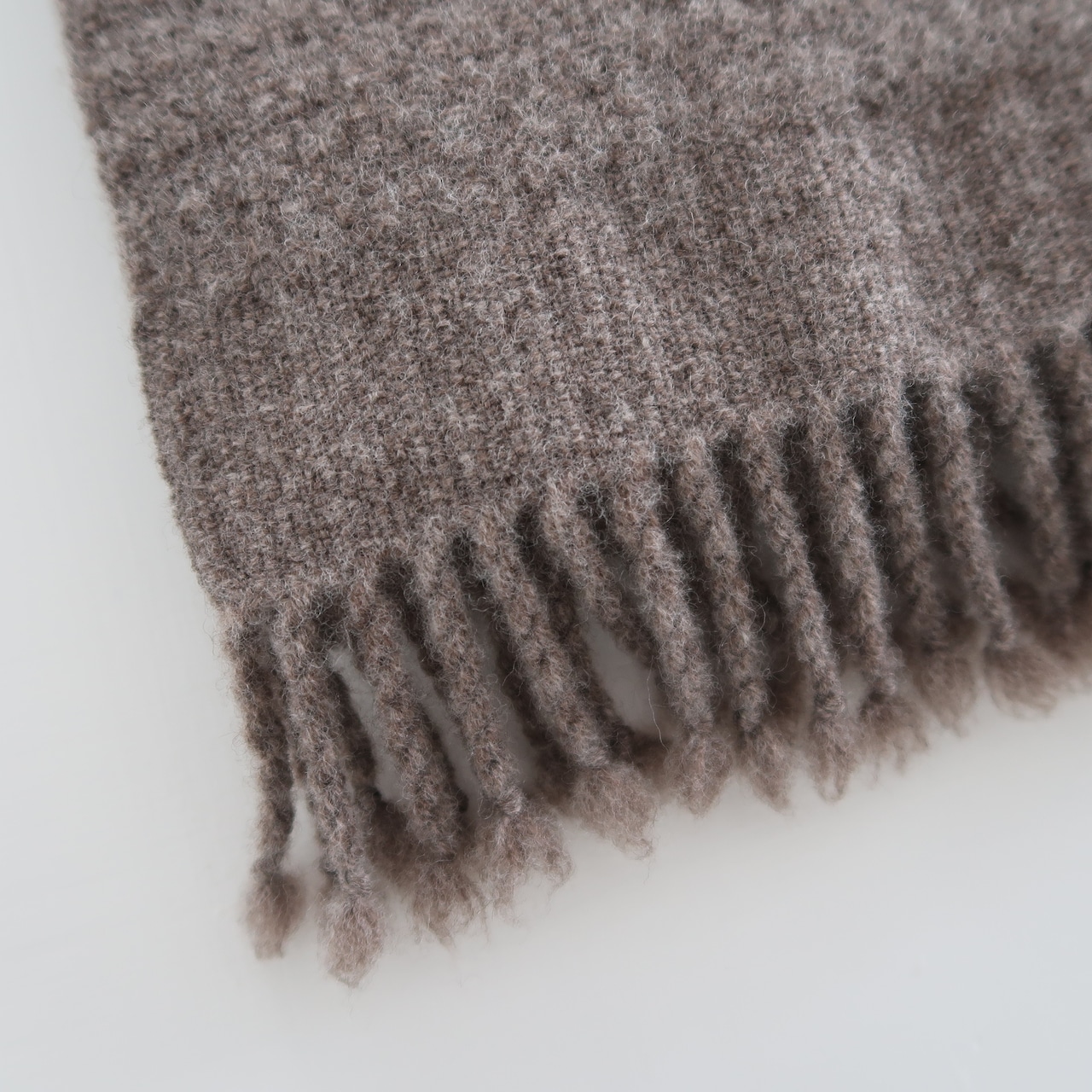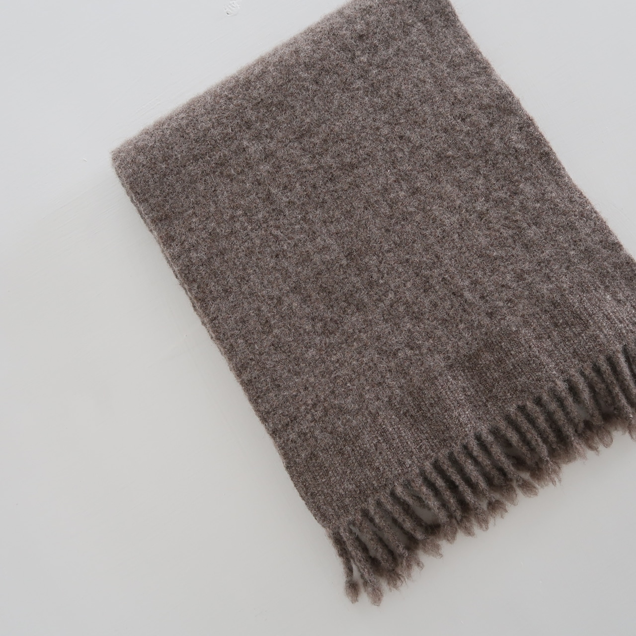 サイズは、首元にコンパクトに巻いて頂けるサイズ感になっています。( ニュージーランド産ウールのタイプより、やや厚みがあり、よりコンパクトなサイズに。 )