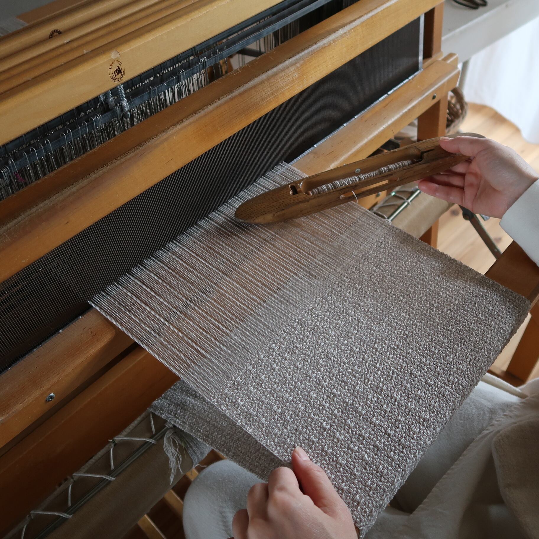 そのウール糸をタテヨコに掛け合わせ組織織りにし、織り目を詰め過ぎず、ふっくらと厚みを出しながら織り上げました。