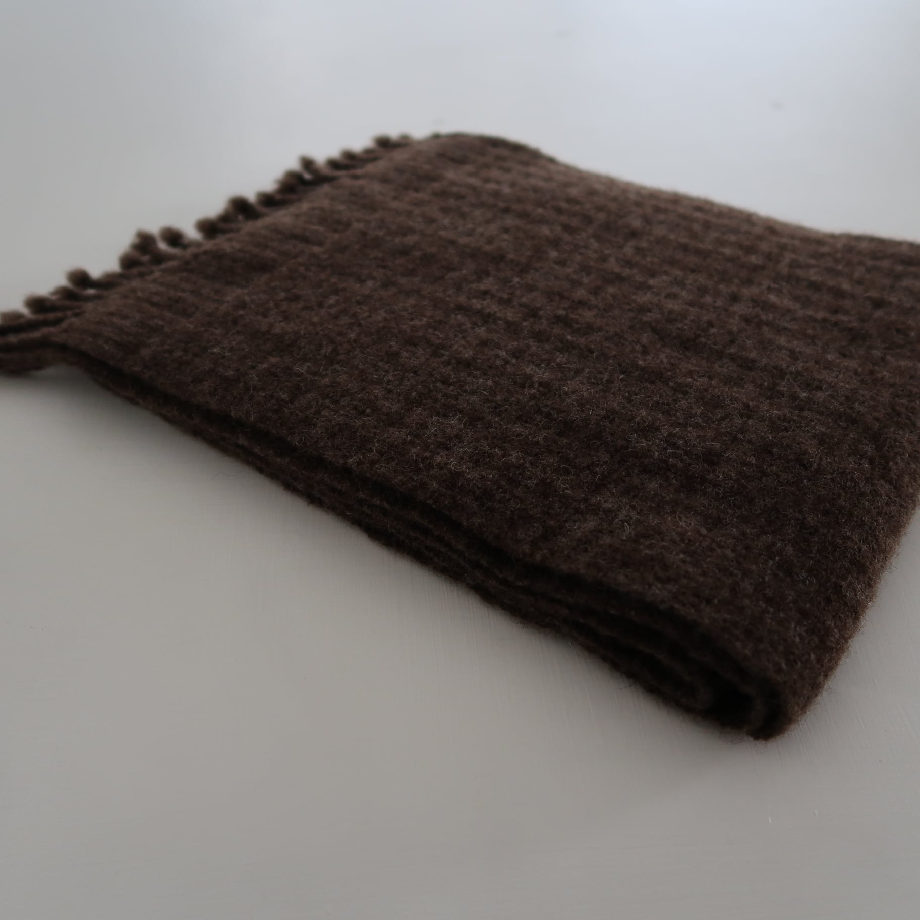 オーストラリア大陸の南東海上に位置する、自然豊かなタスマニア島で小規模ながら有色ウール専用の牧場で飼育されている、希少なナチュラルブラックウールを素材として使用し、アトリエの手機で組織織りにした " puff " シリーズのマフラーです。