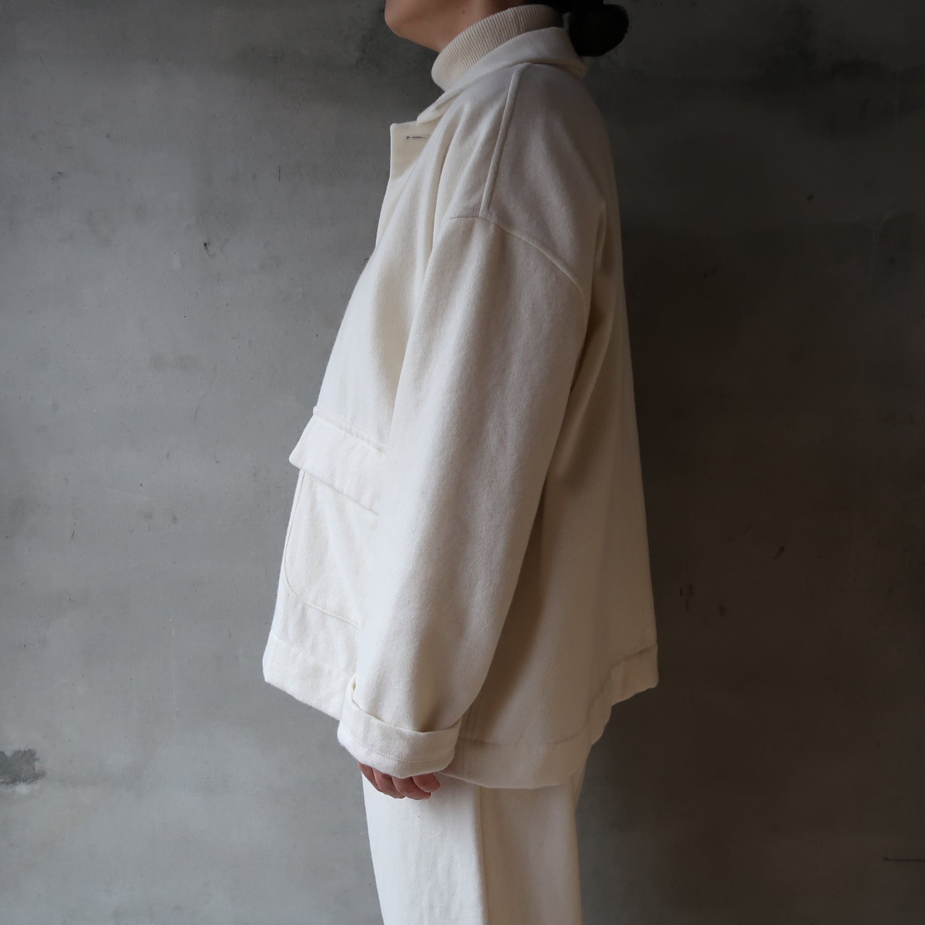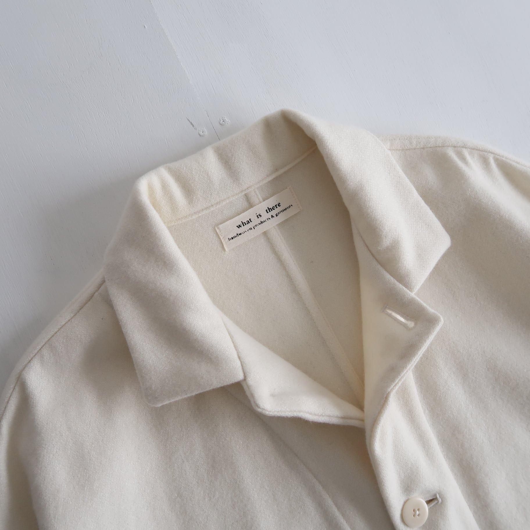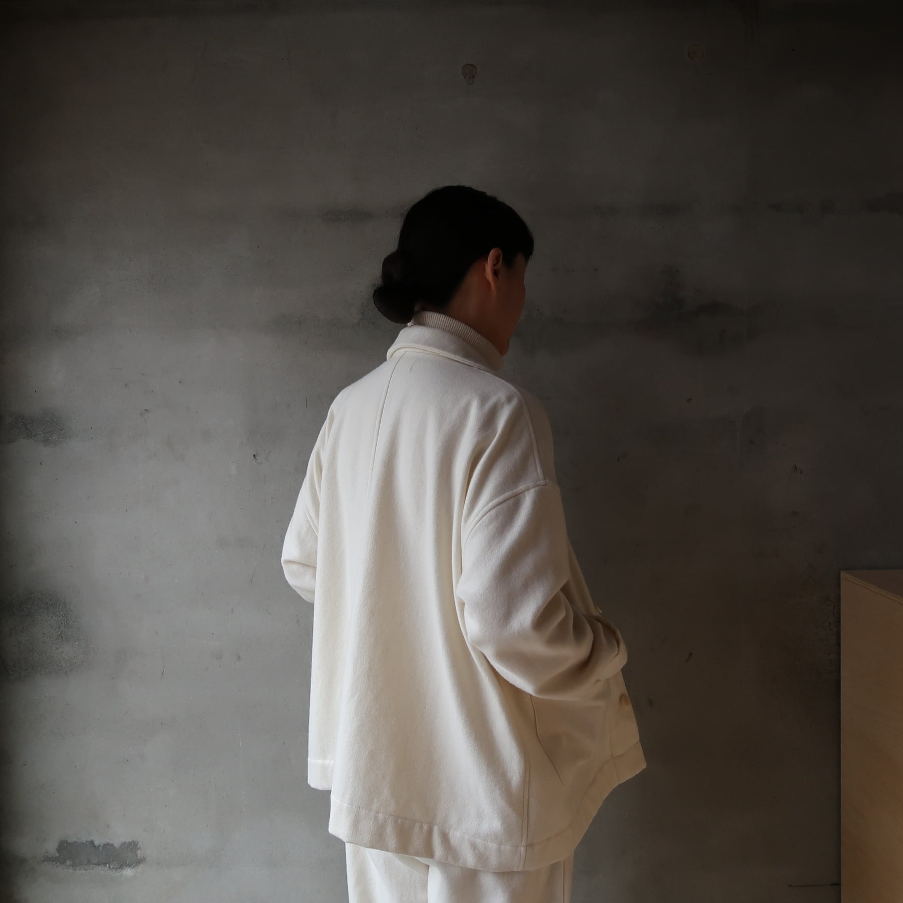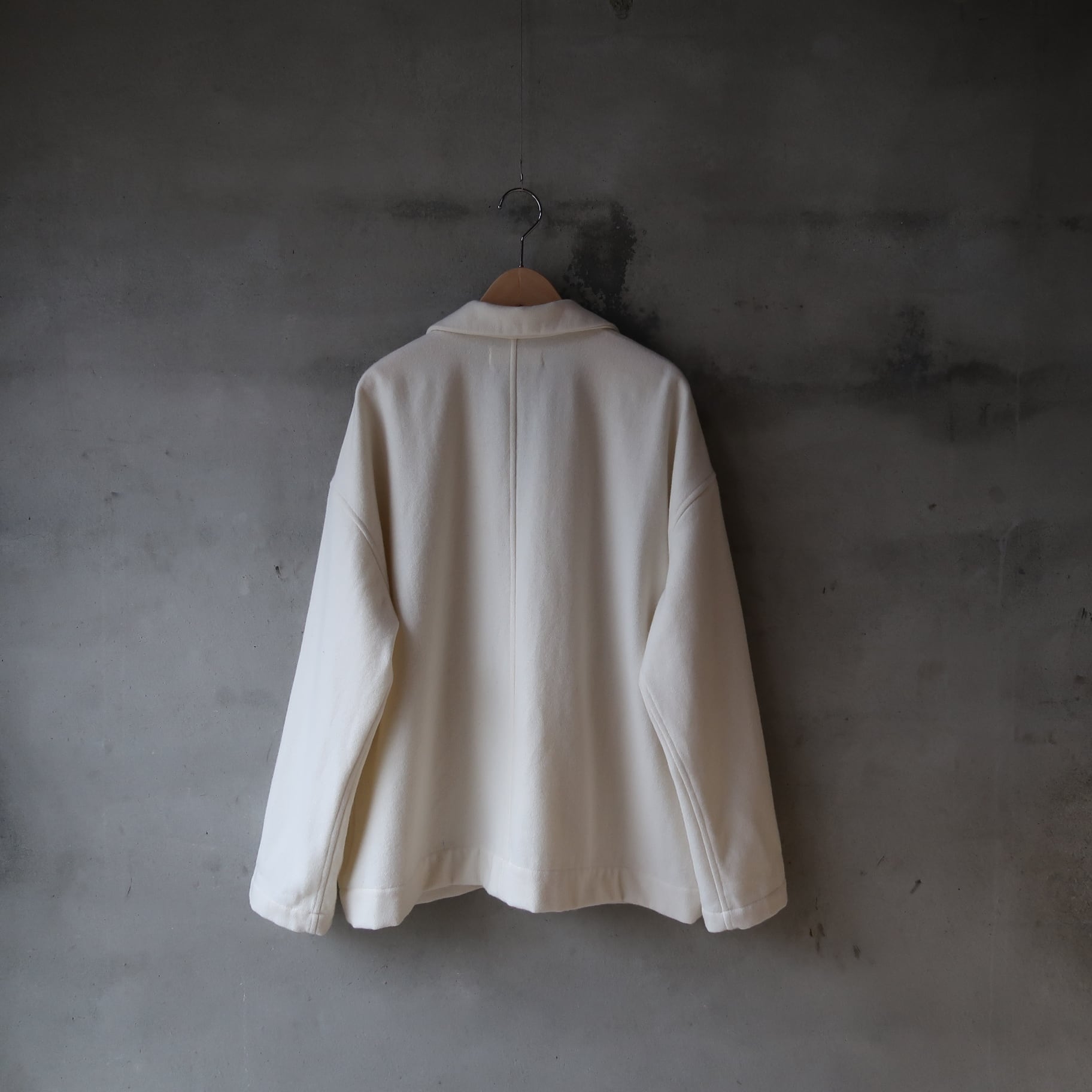 通常のメルトンというと、重量感があって、しっかりとした やや硬さのあるウール生地のイメージがあると思いますが、こちらは、軽く 触り心地もソフトで柔らかなメルトン生地で、その生地に よりあたたかな空気の層を含んでくれるように、製品洗いをかけて起毛させ、カジュアル感のある仕上がりに。