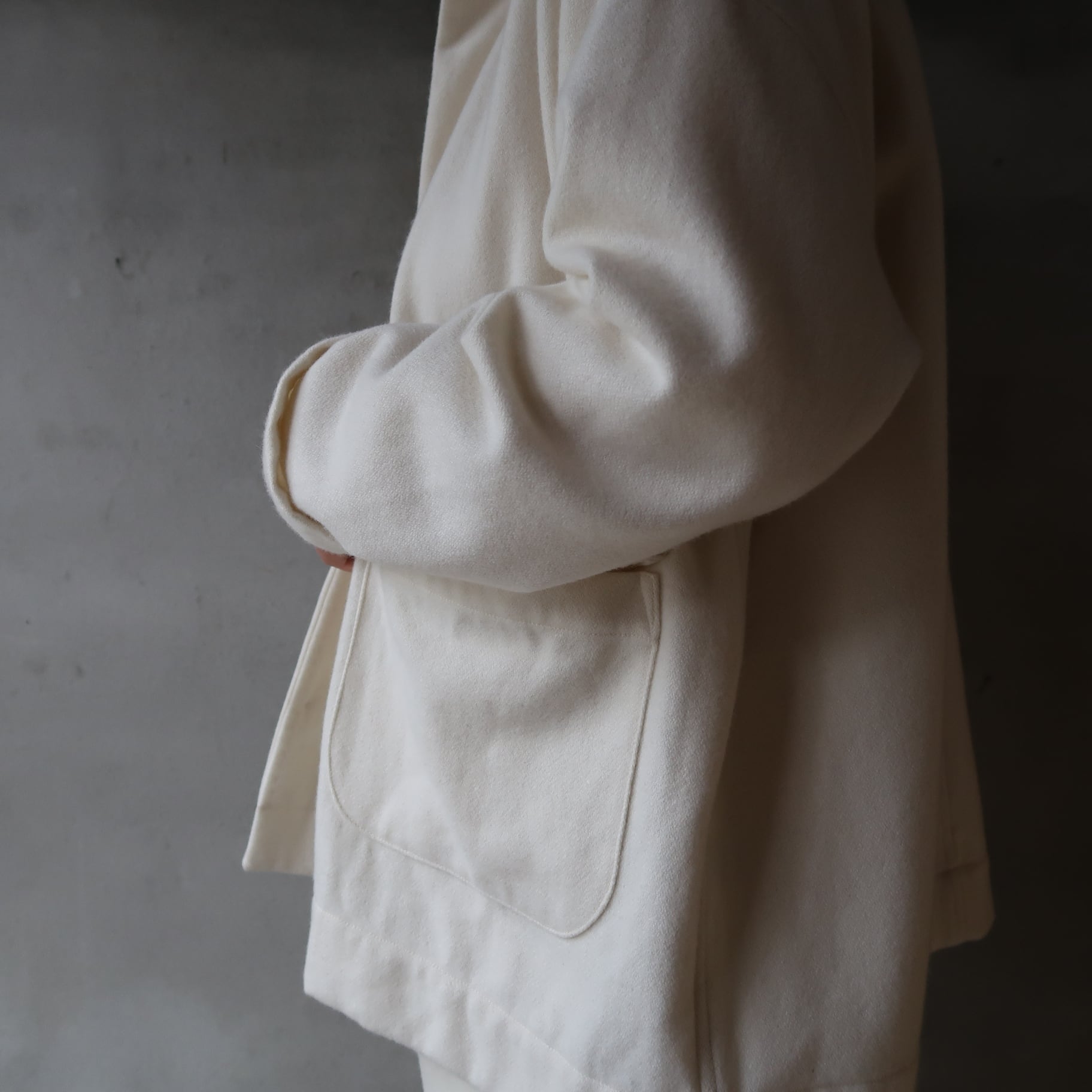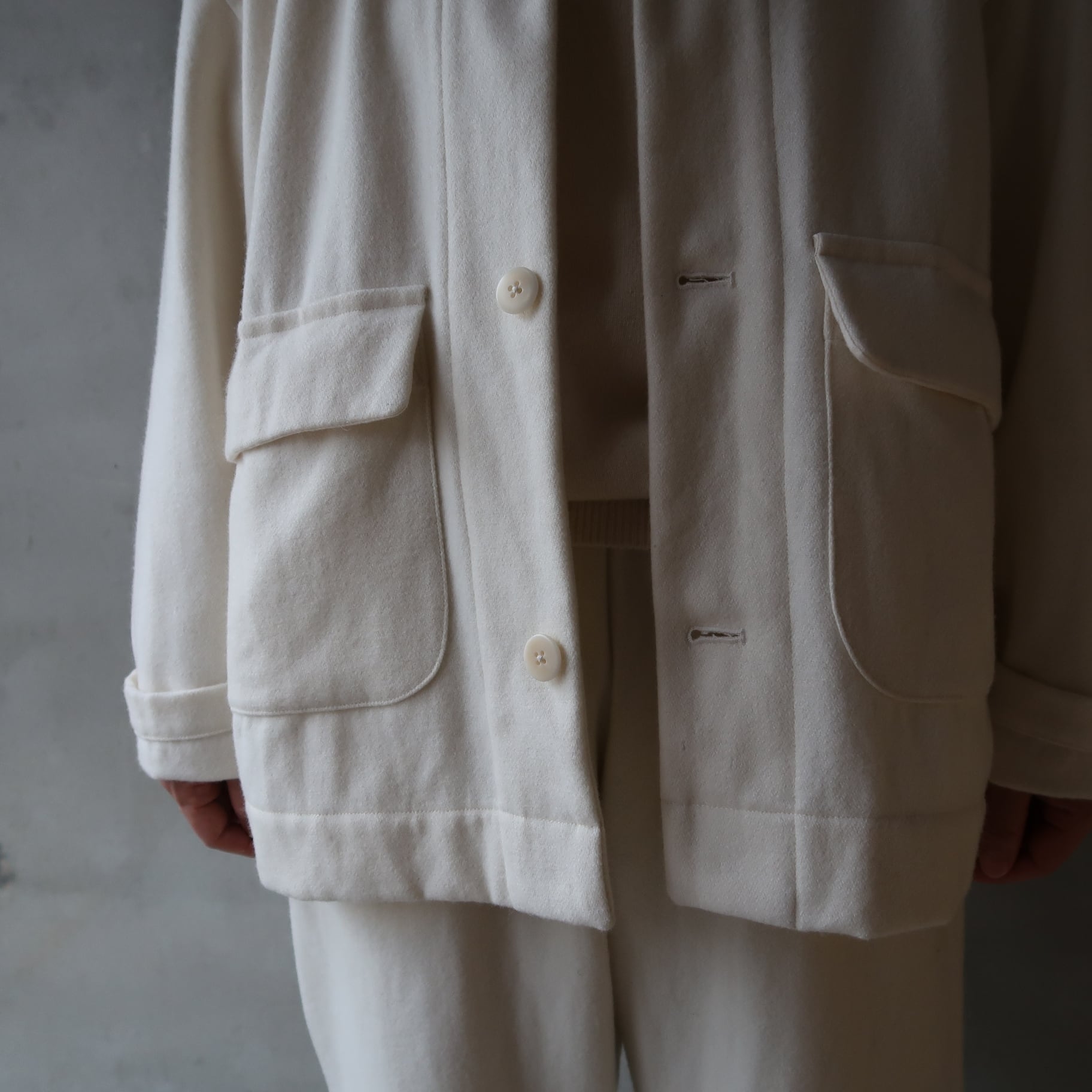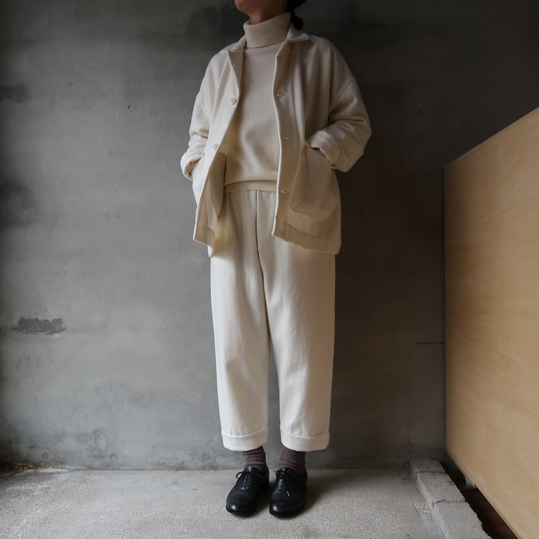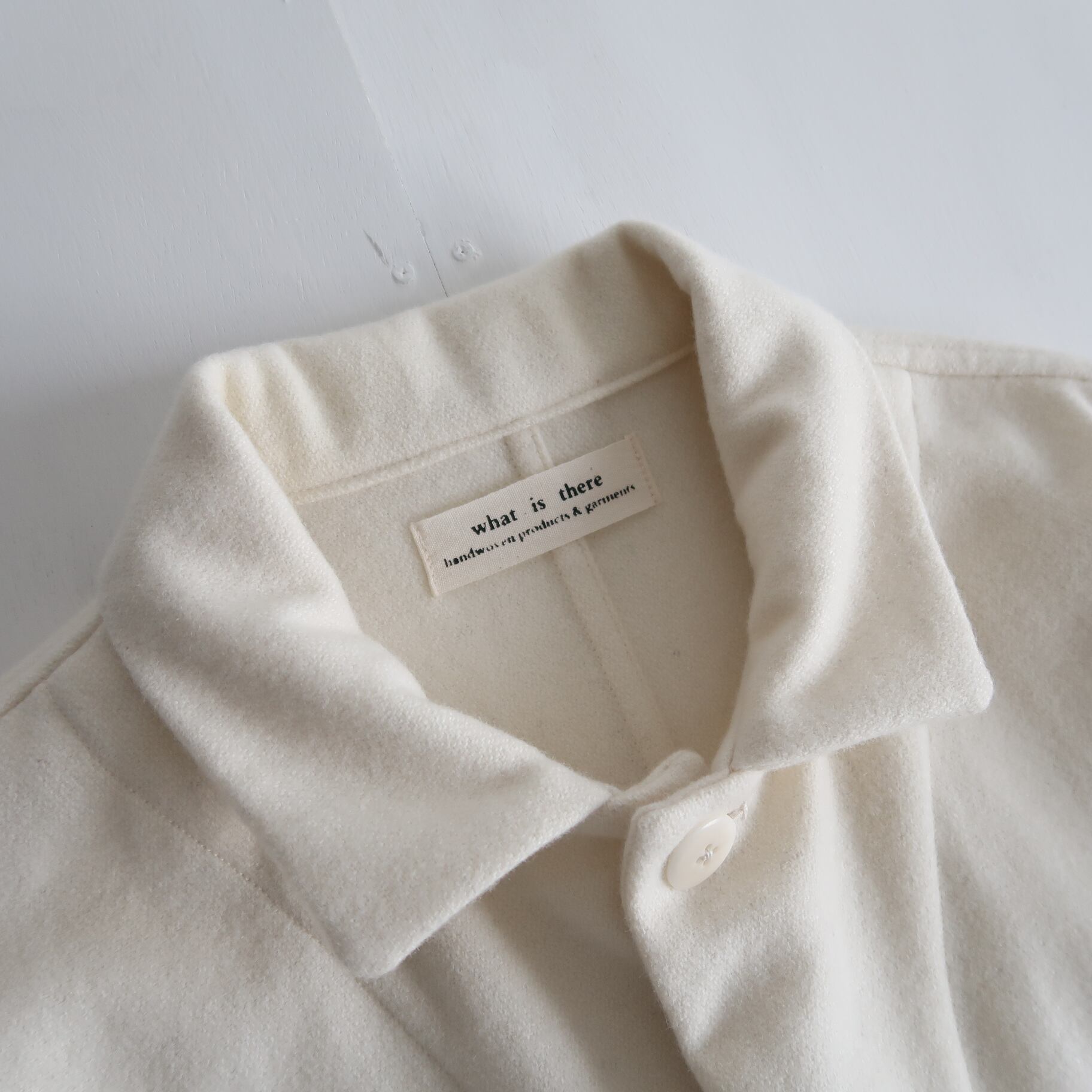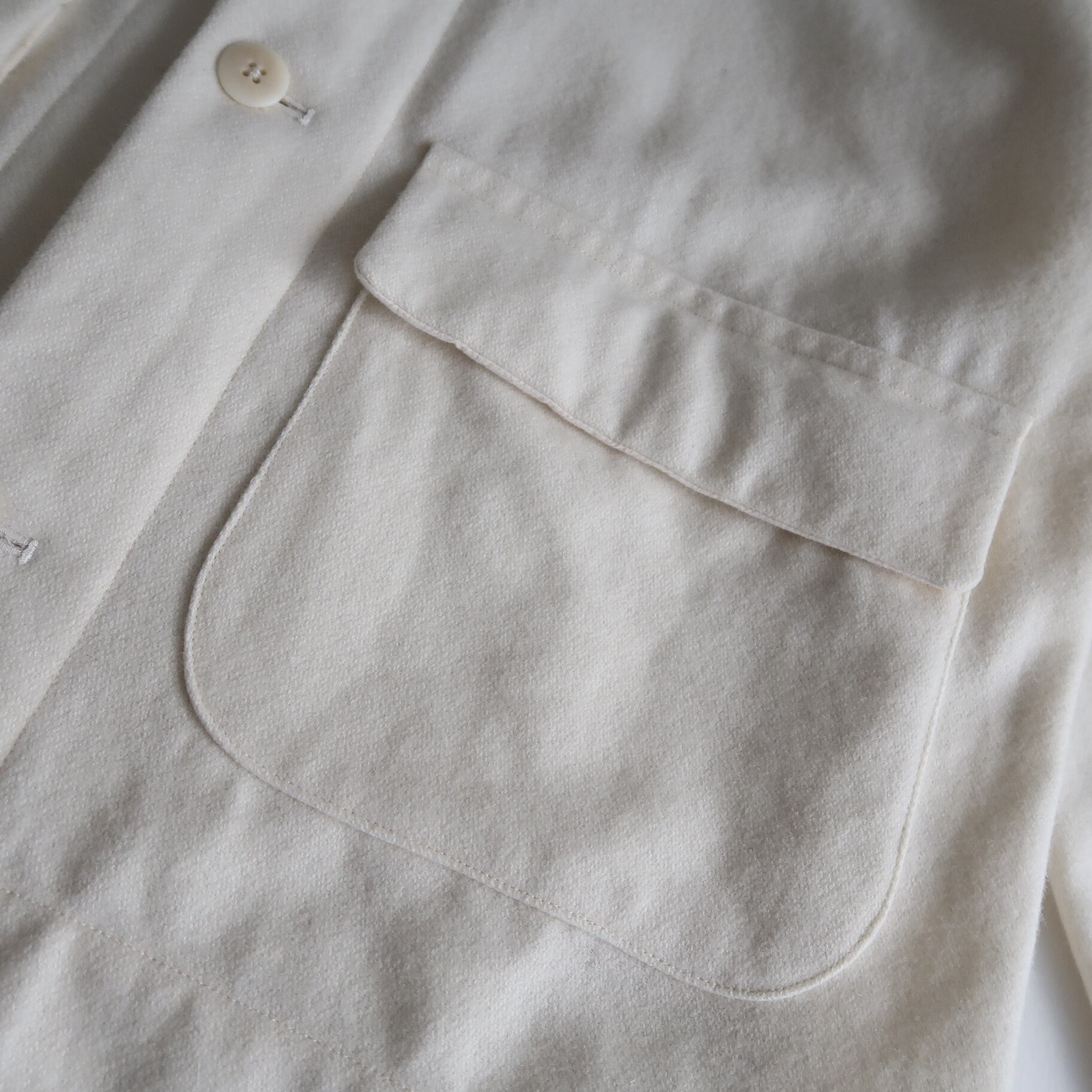 通常のメルトンというと、重量感があって、しっかりとした やや硬さのあるウール生地のイメージがあると思いますが、こちらは、軽く 触り心地もソフトで柔らかなメルトン生地で、その生地に よりあたたかな空気の層を含んでくれるように、製品洗いをかけて起毛させ、カジュアル感のある仕上がりに。