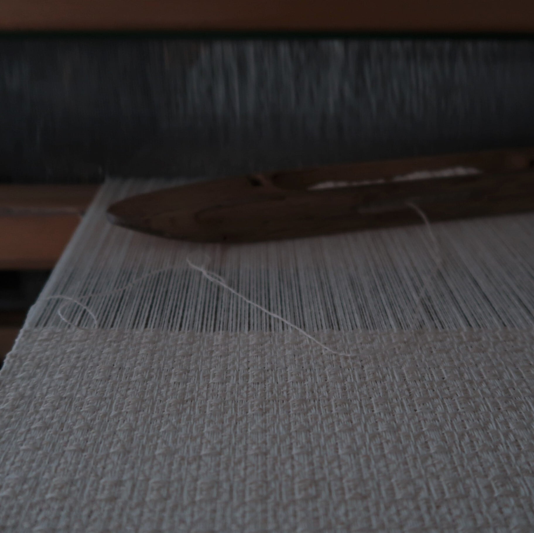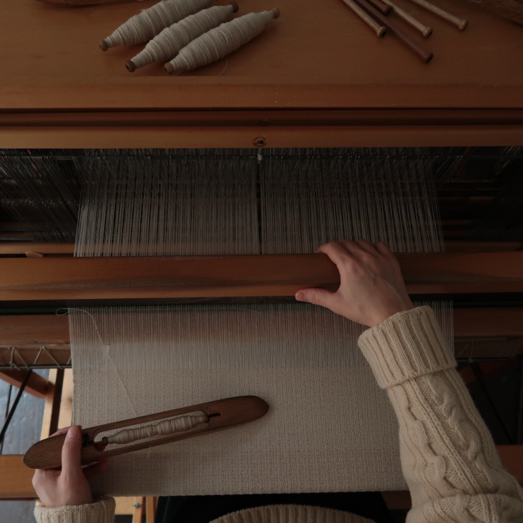 ( 大阪 貝塚 のアトリエの手機で、一つ一つ織っています。 )