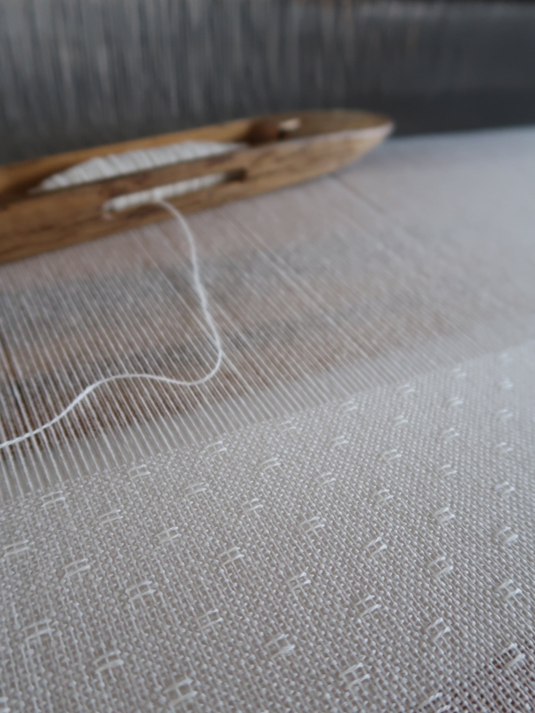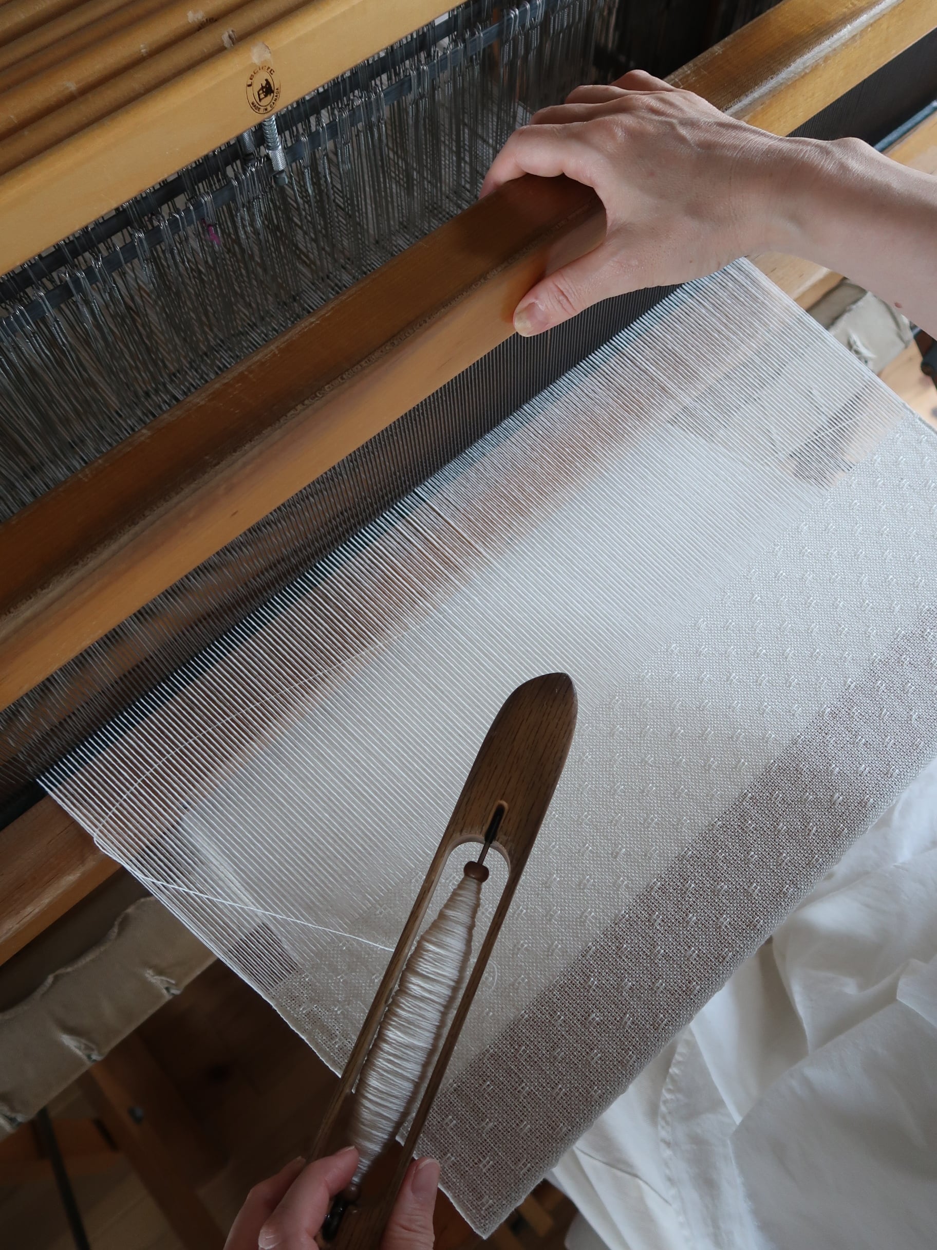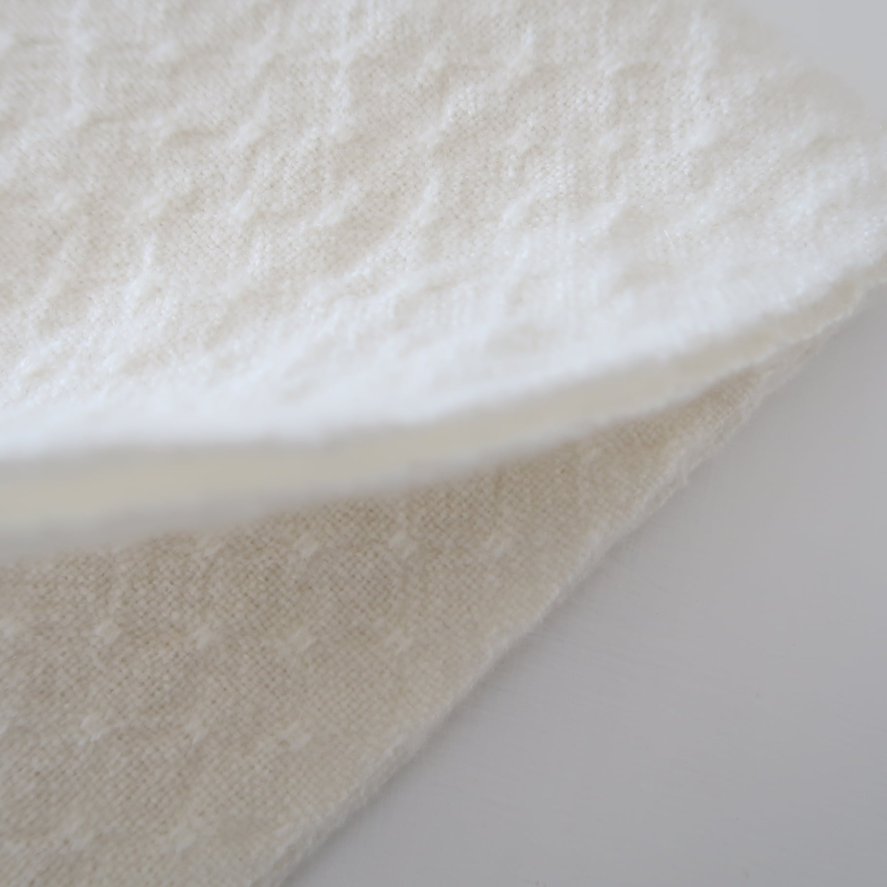 遠目に見ると、ドット模様のように見える組織織りで織り上げることで、布地に変化をつけ、程よい厚みで織り上げました。( 平織りのものよりも、フンワリとした織り上がりになっているように感じられます。)
